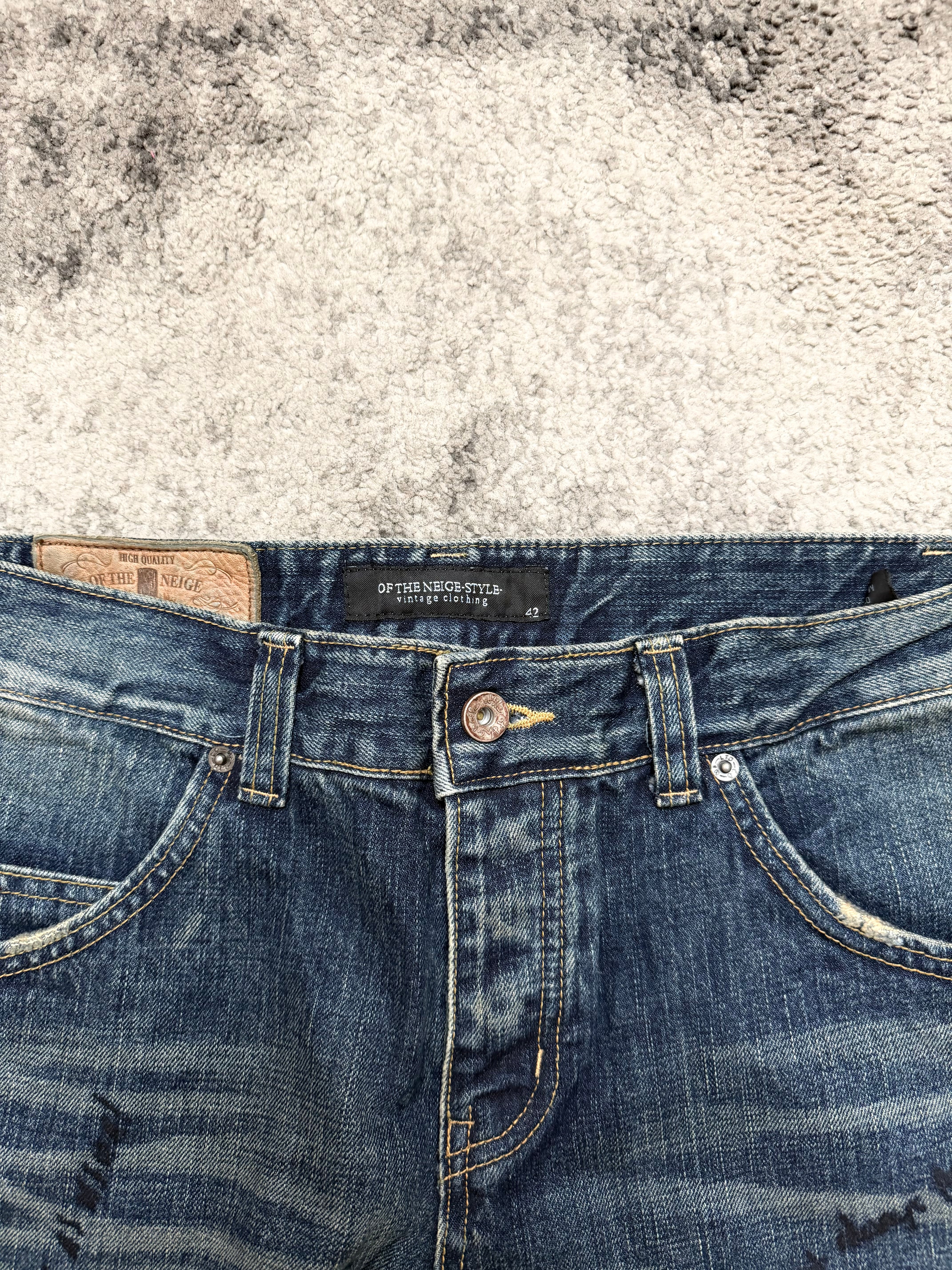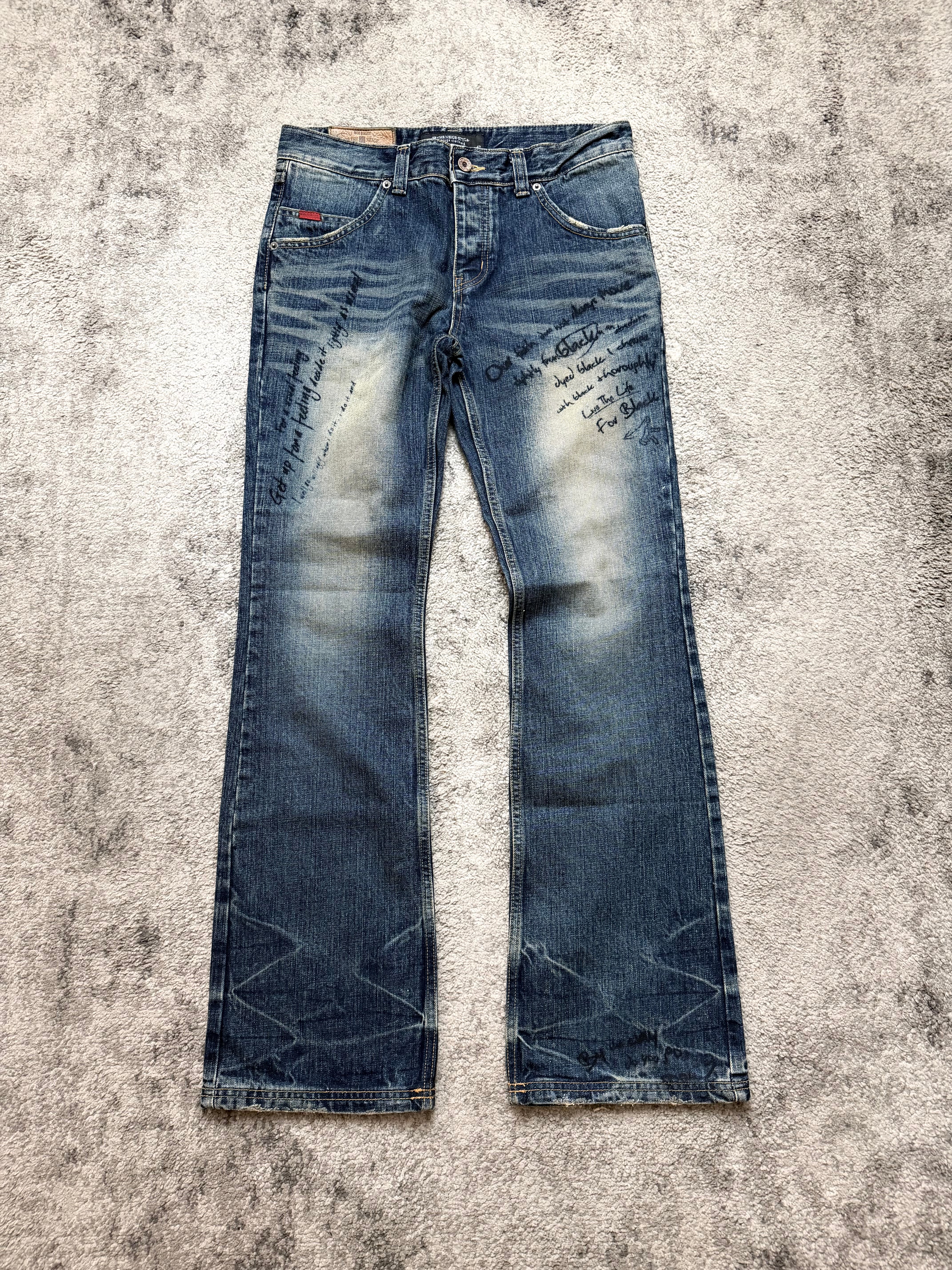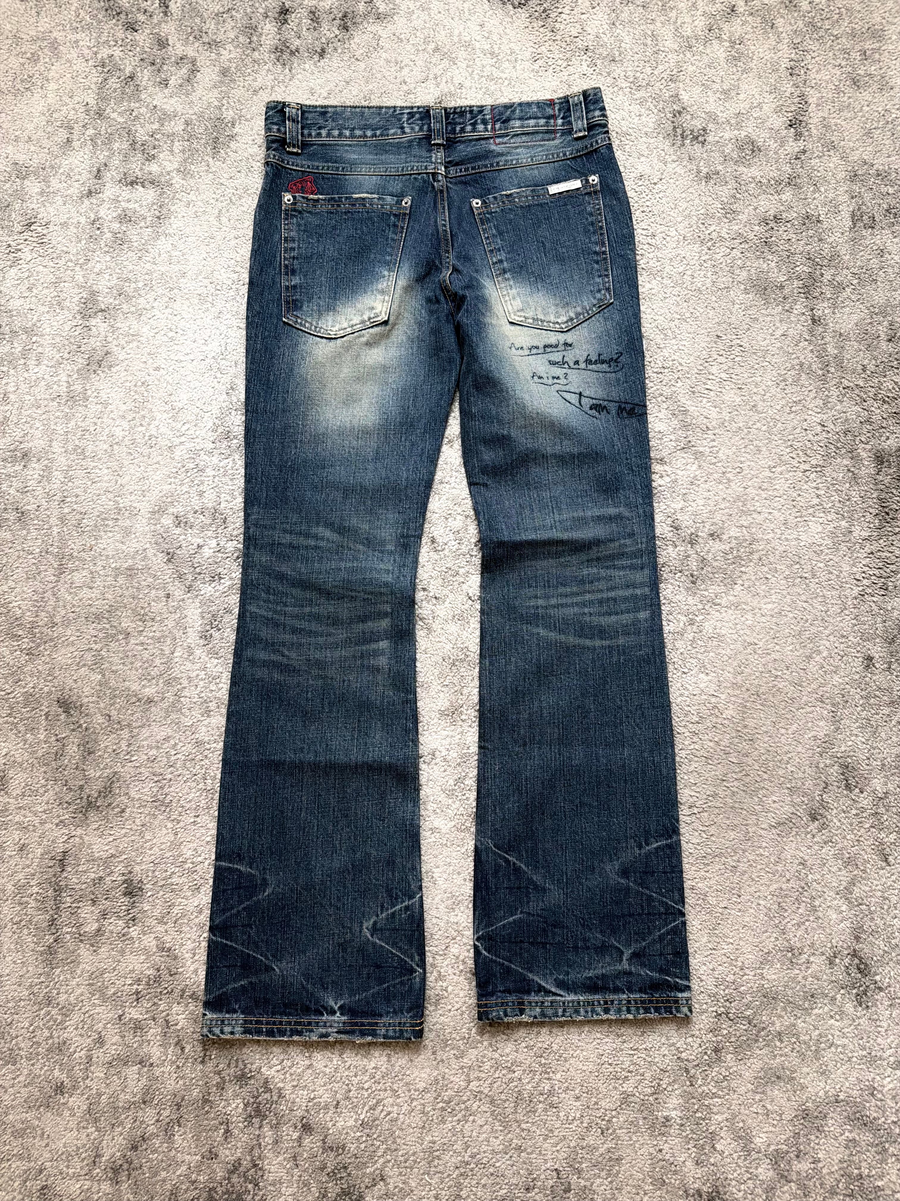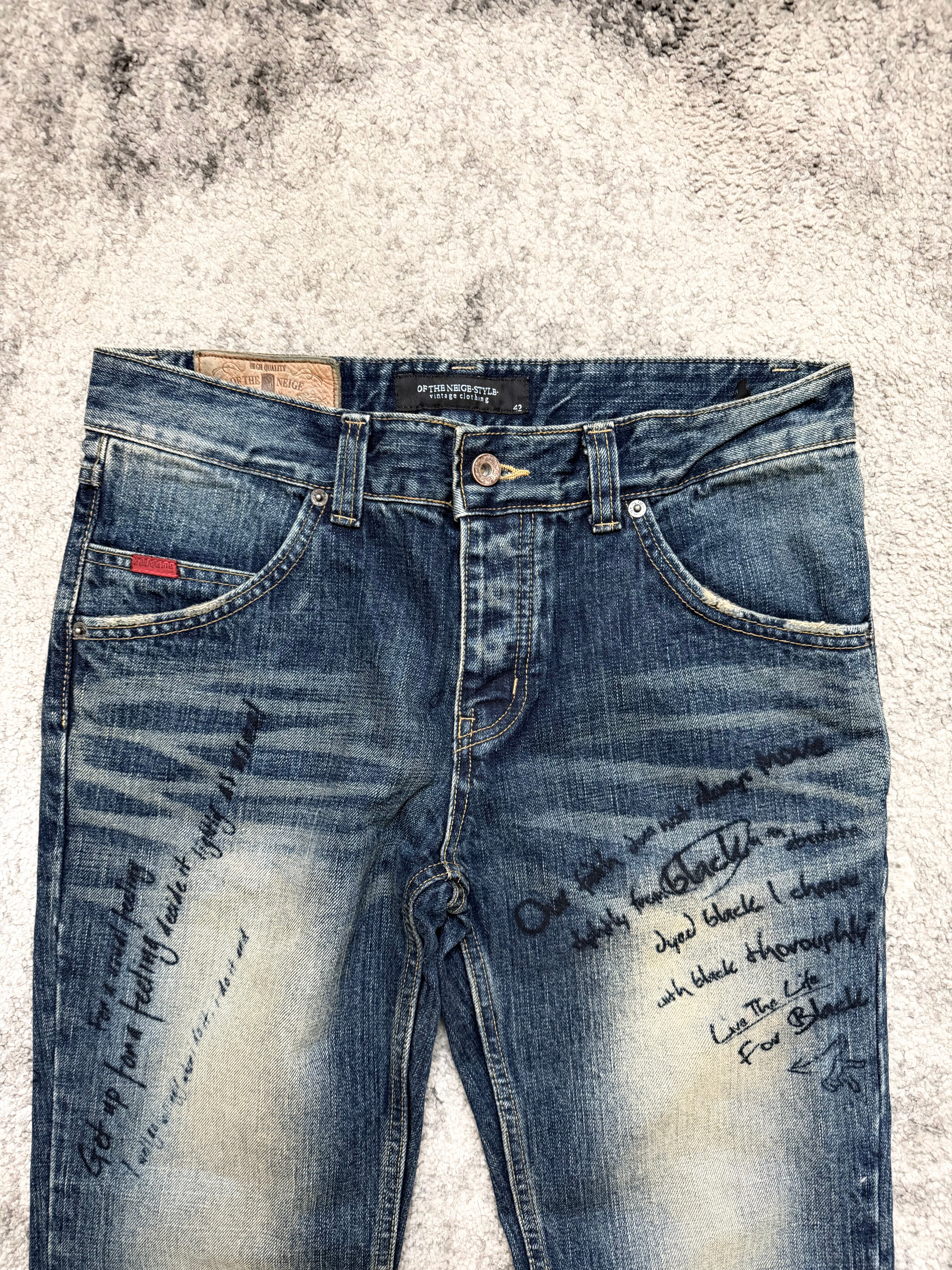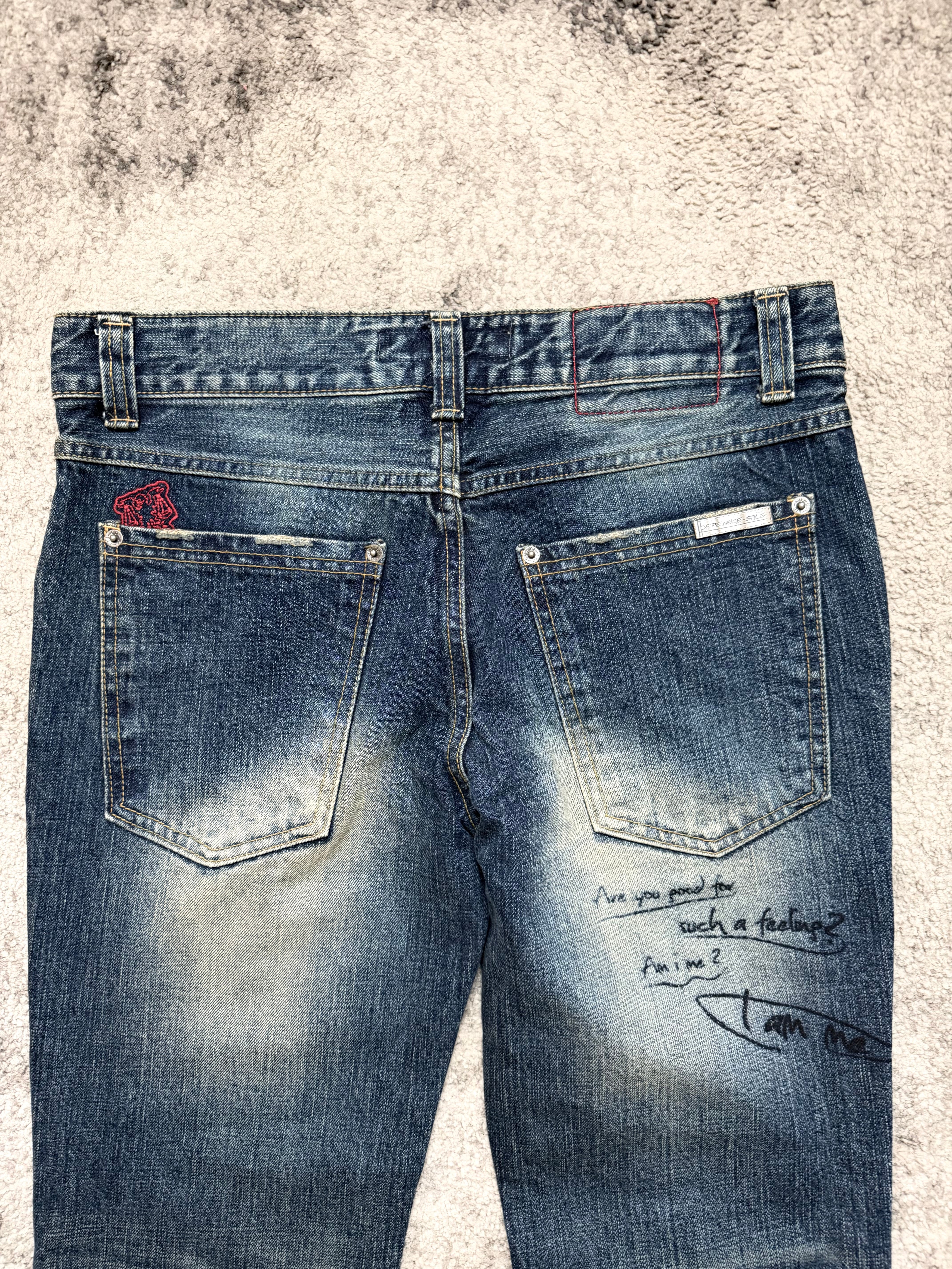 Straight-cut silhouette with that early-2000s Tokyo rebel energy. The front leg panels carry scattered handwritten graphics, like private notes left for someone who never came back. Soft whiskering across the thighs adds that true archive feel.