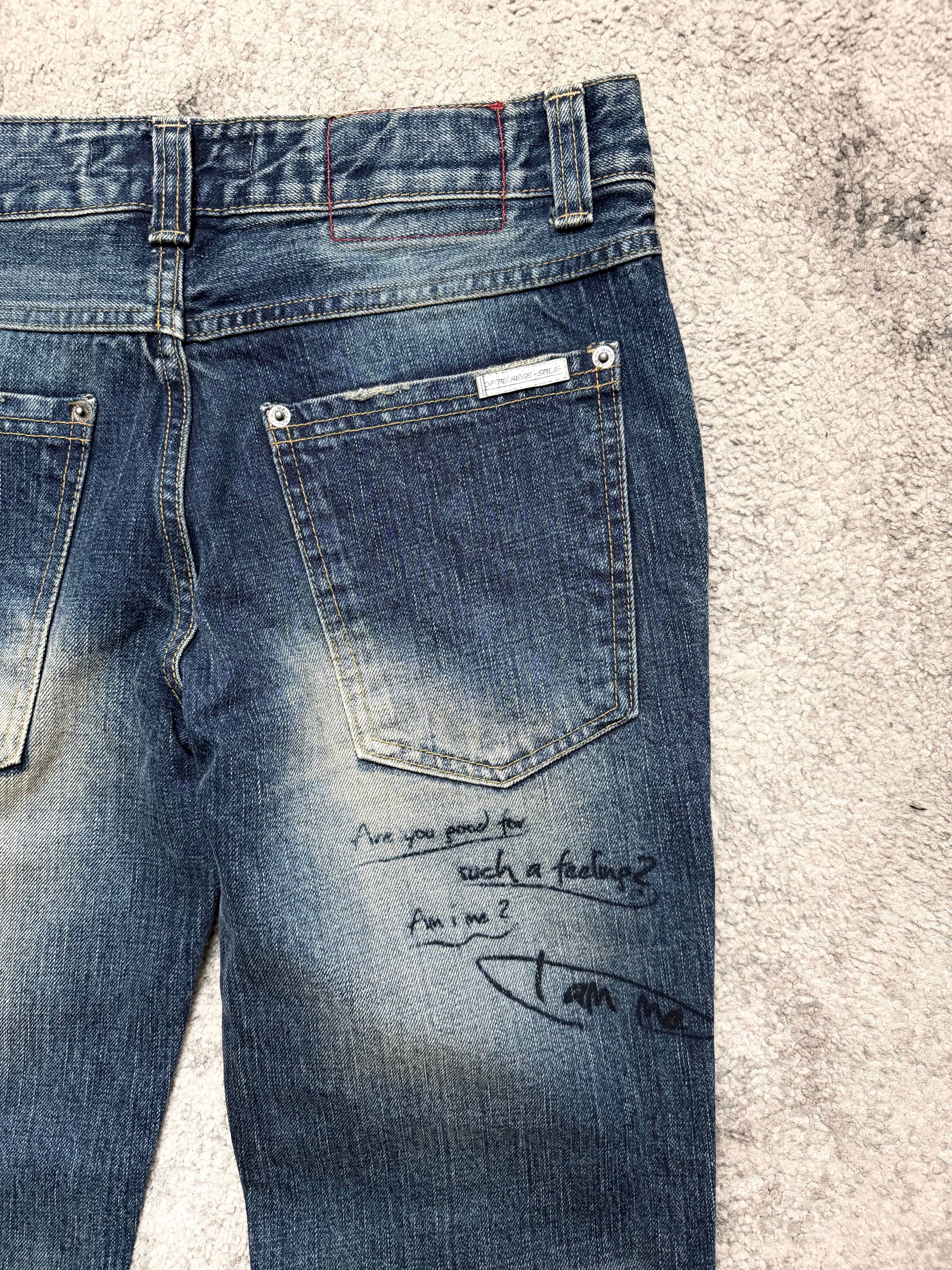 These jeans feel like they were pulled straight from a Number (N)ine backstage floor — raw emotion scribbled across denim, the softness of wear meeting the chaos of handwritten thoughts.