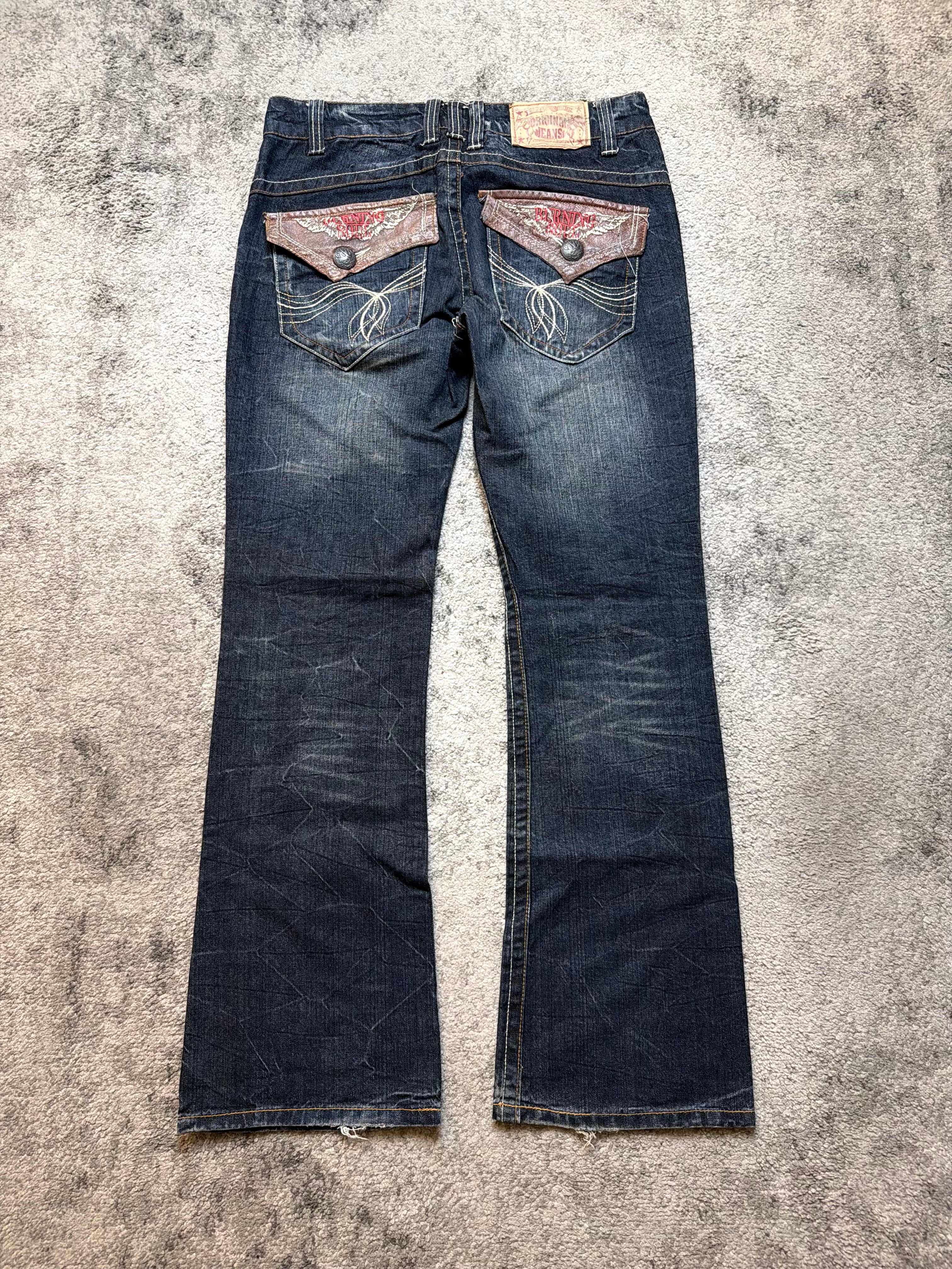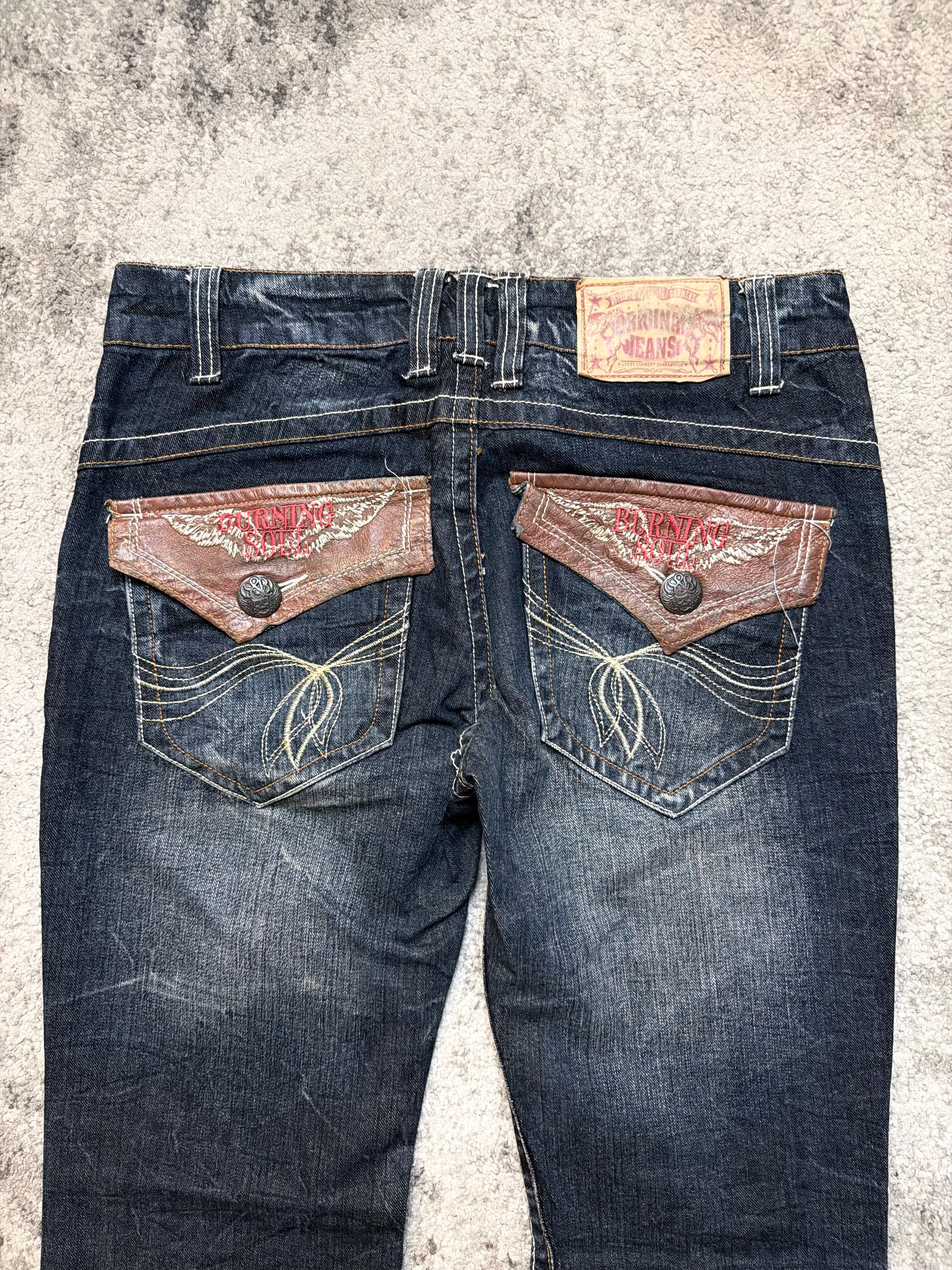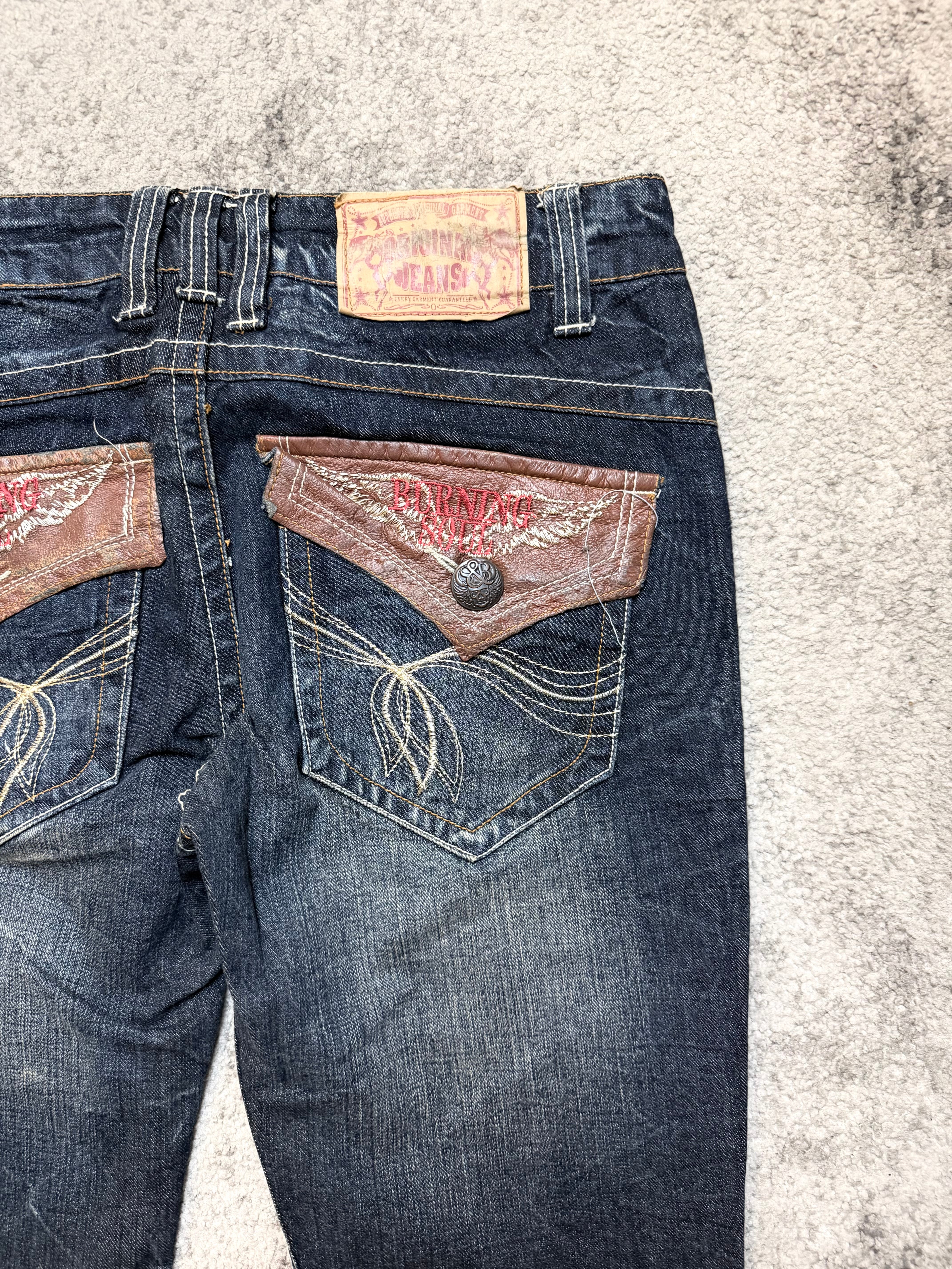 Crafted from soft yet durable Japanese cotton denim, they’re broken in perfectly — no fake stiffness, just real texture and character. The standout feature: unique contrast flap pockets on the back with stitched motifs and button closures, giving the jeans a rebellious, handcrafted look reminiscent of early Number (N)ine and underground Ifsixwasnine energy.