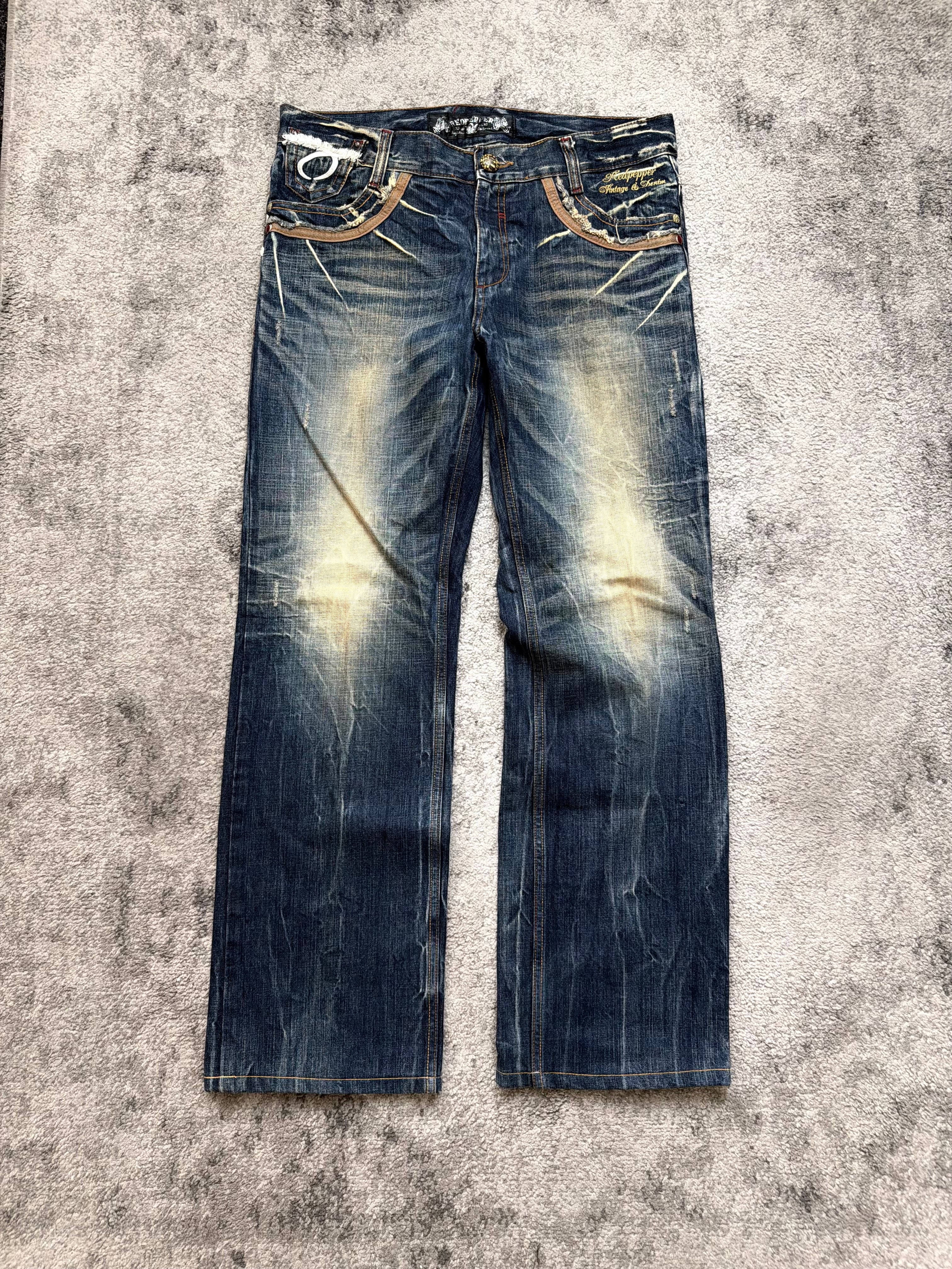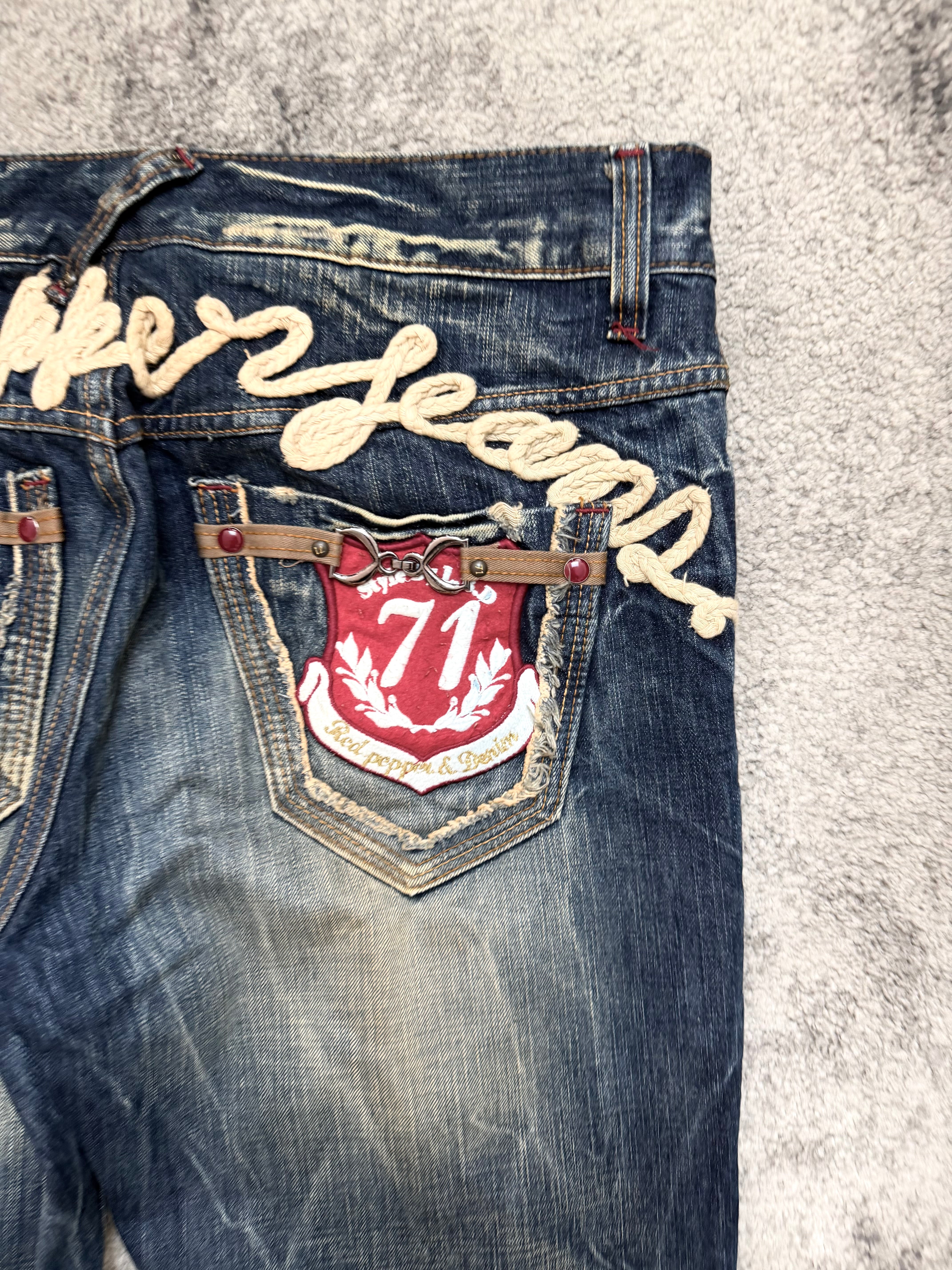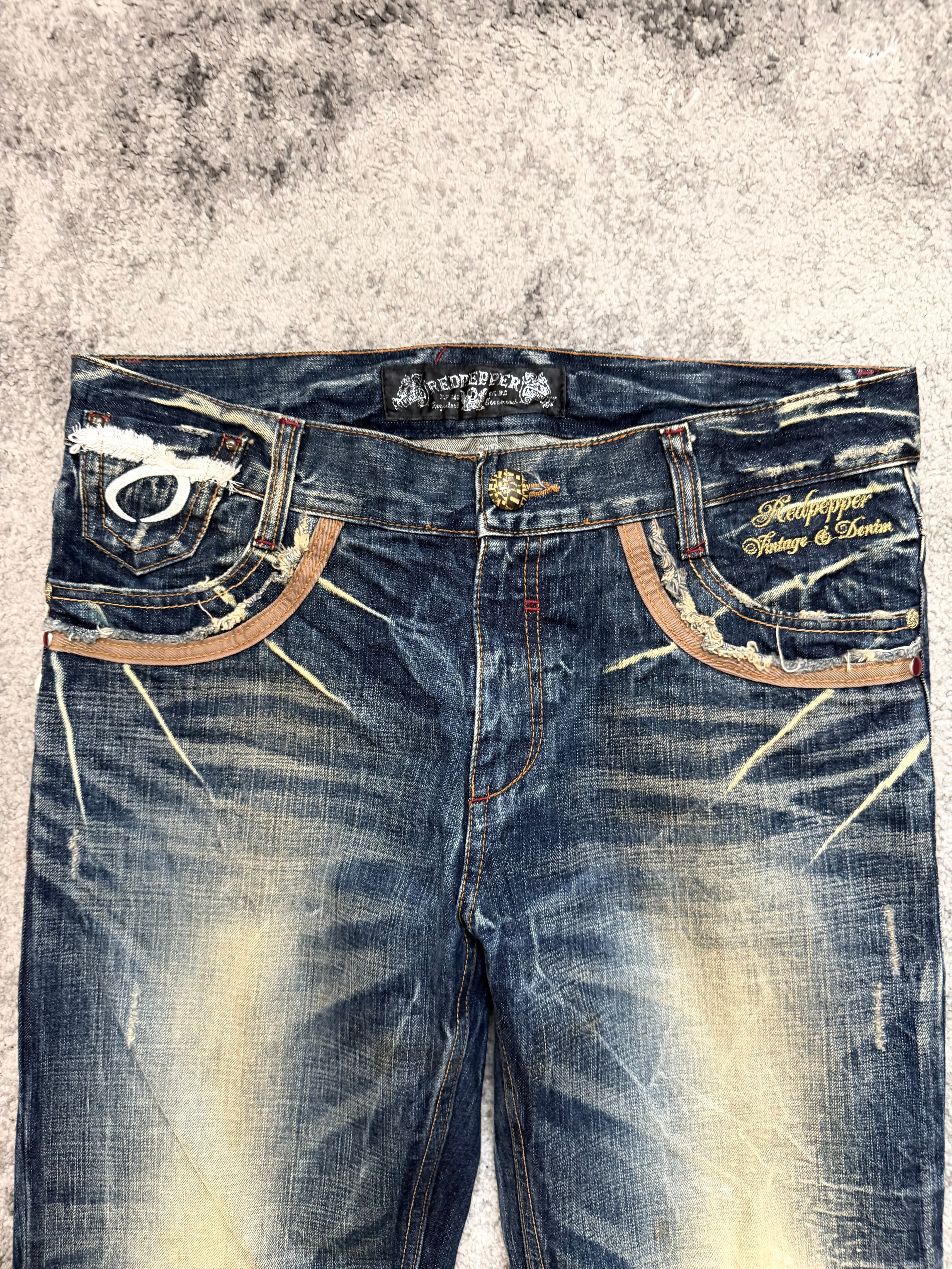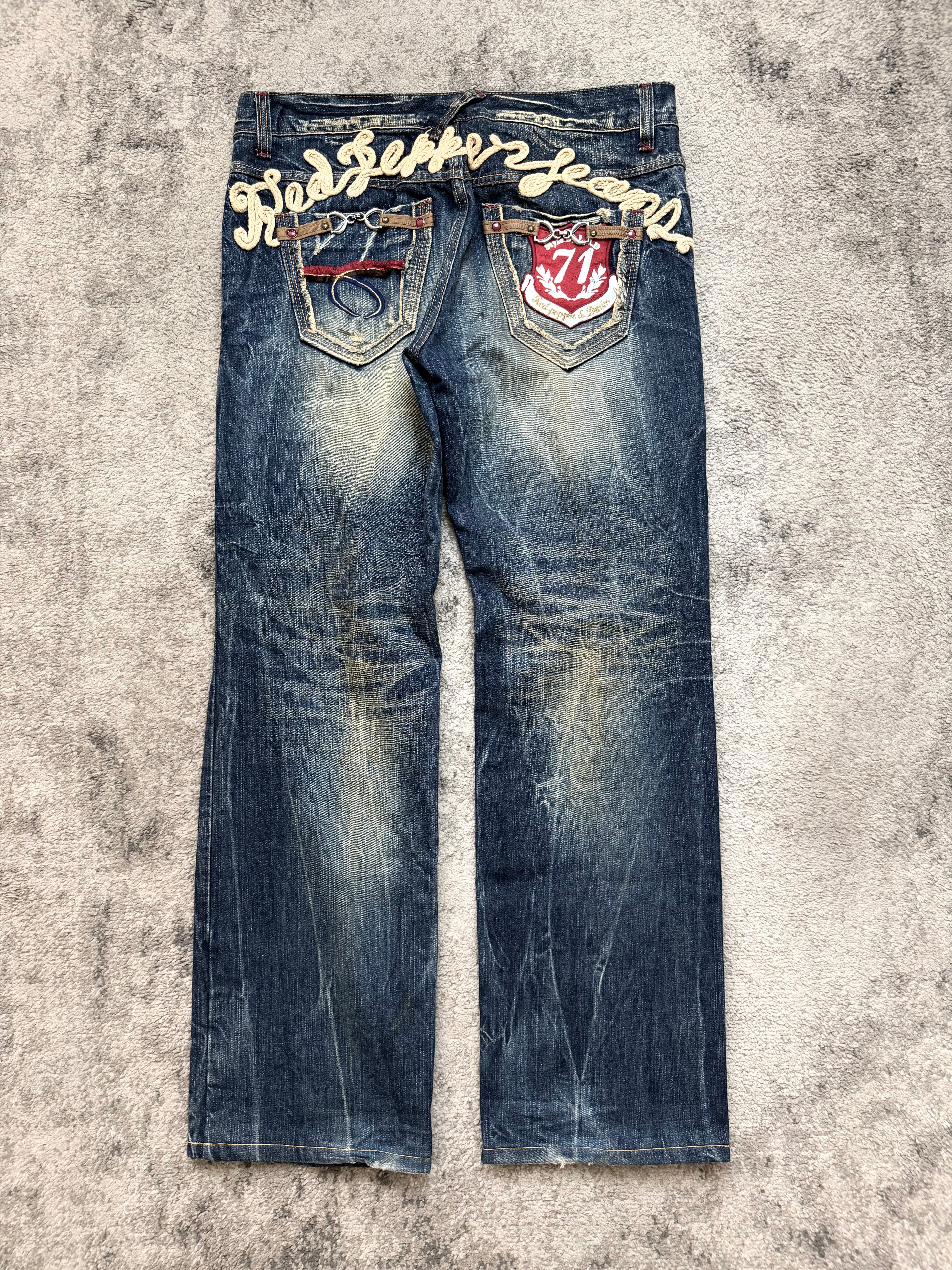 Constructed from premium mid-weight indigo denim with heavy fading, intense honeycomb whiskers, and distressed detailing throughout. The back features oversized “Red Pepper Jeans” embroidery and patchwork accents — pure Japanese maximalism at its finest.