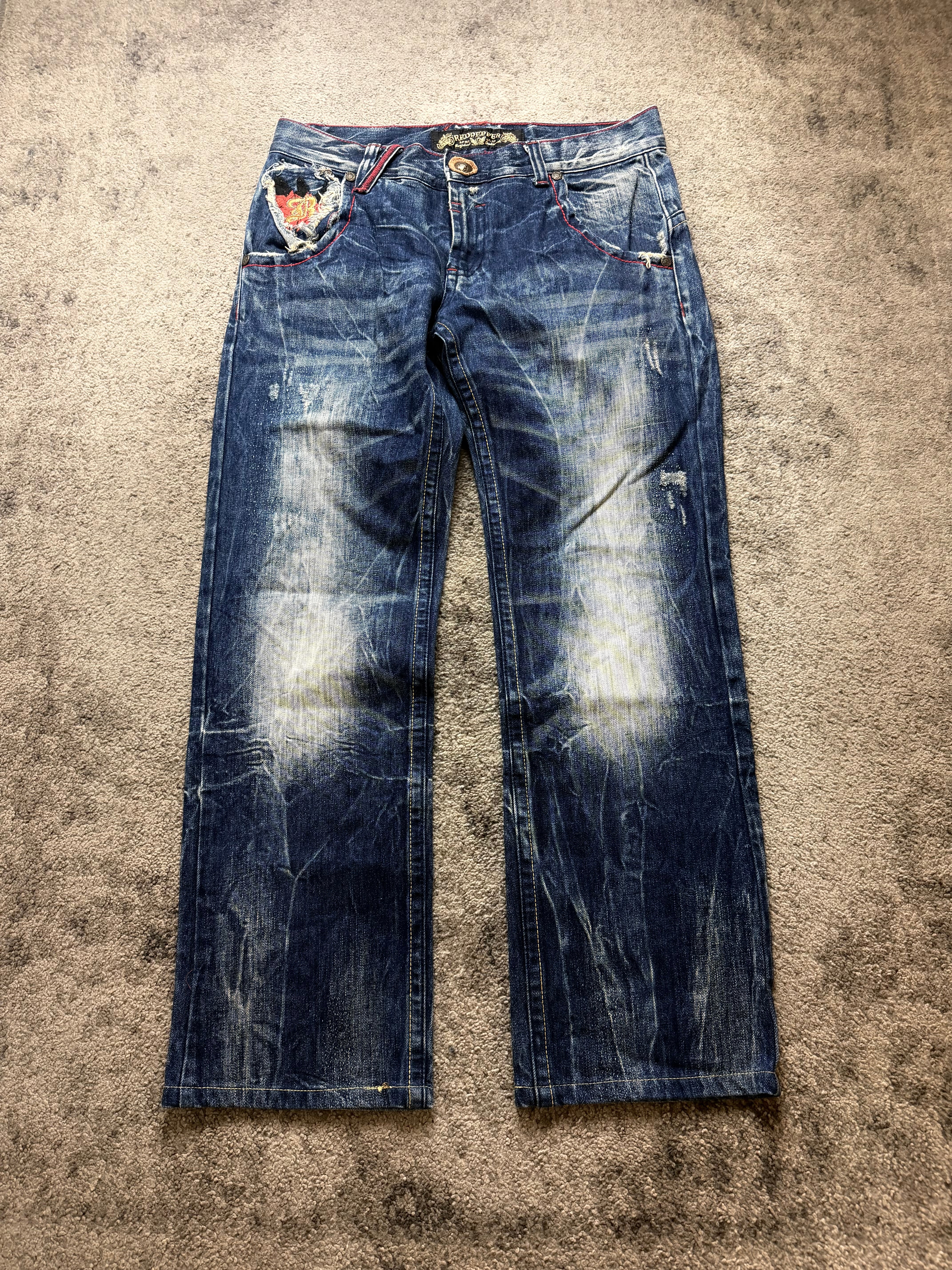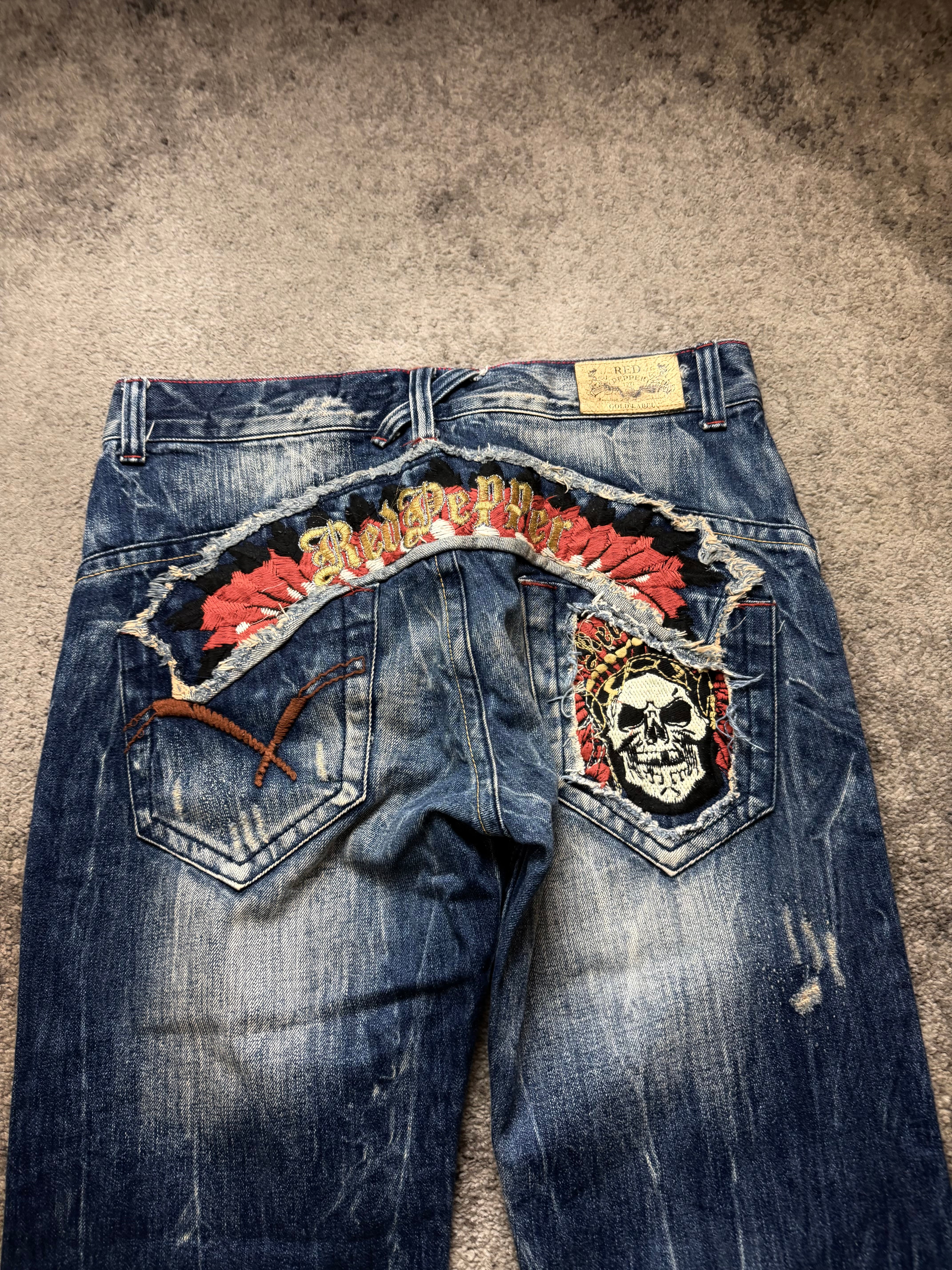 These RED PEPPER jeans bring that raw early-2000s Japanese energy — heavy whiskering, bold contrast fading, red stitch accents, and statement detailing that feels straight out of the golden archive era of Number Nine / ifsixwasnine-inspired streetwear.
