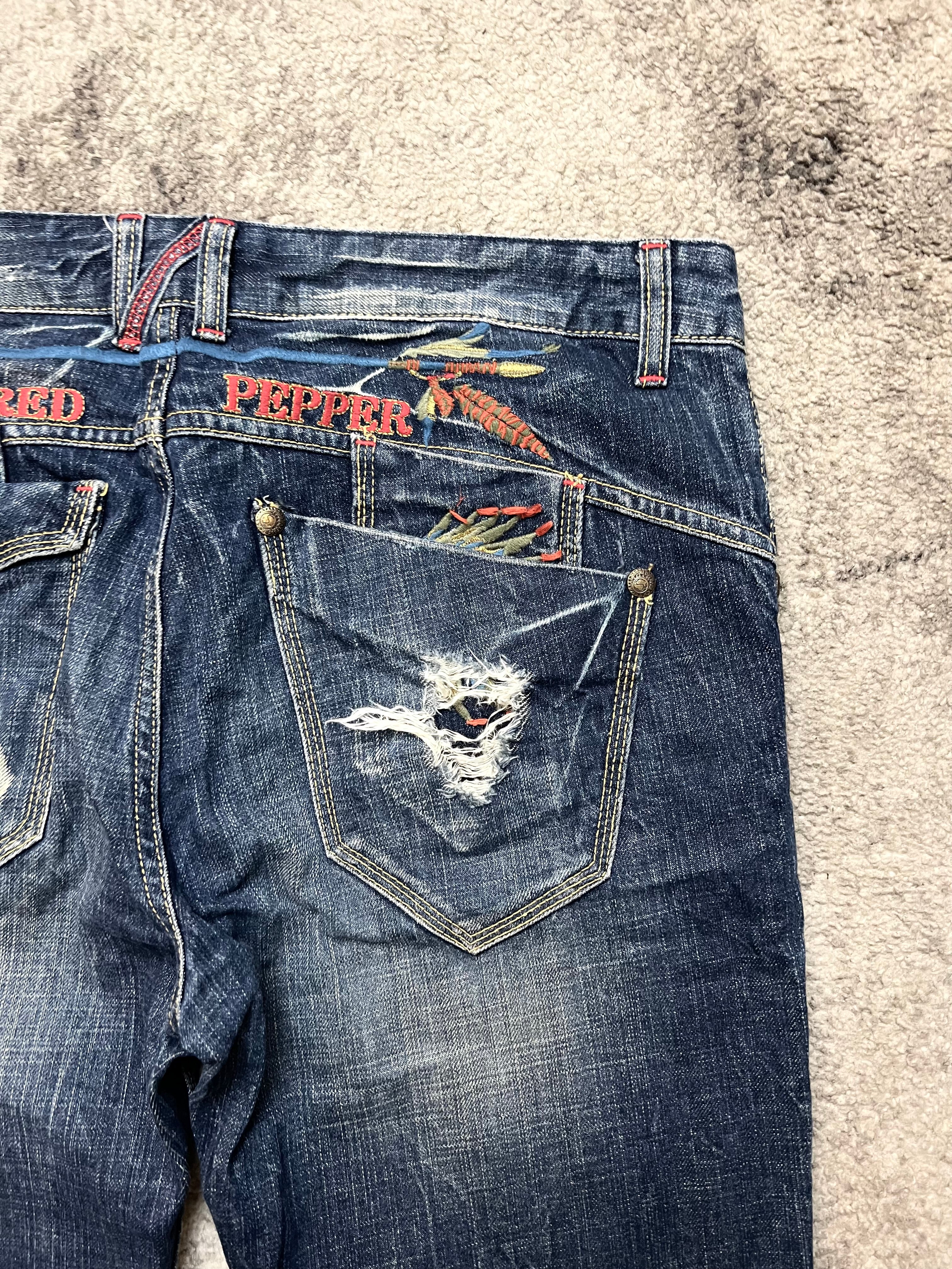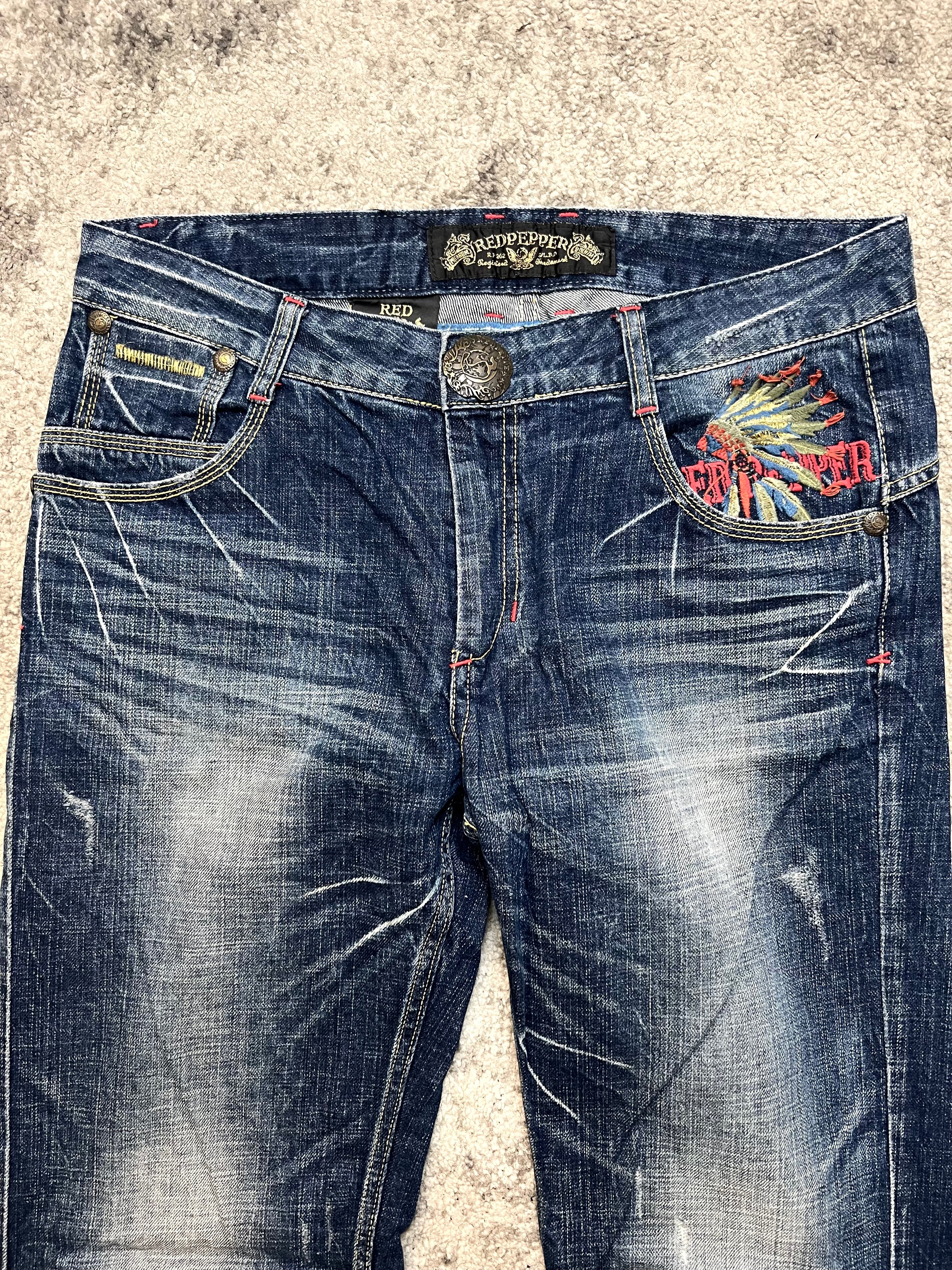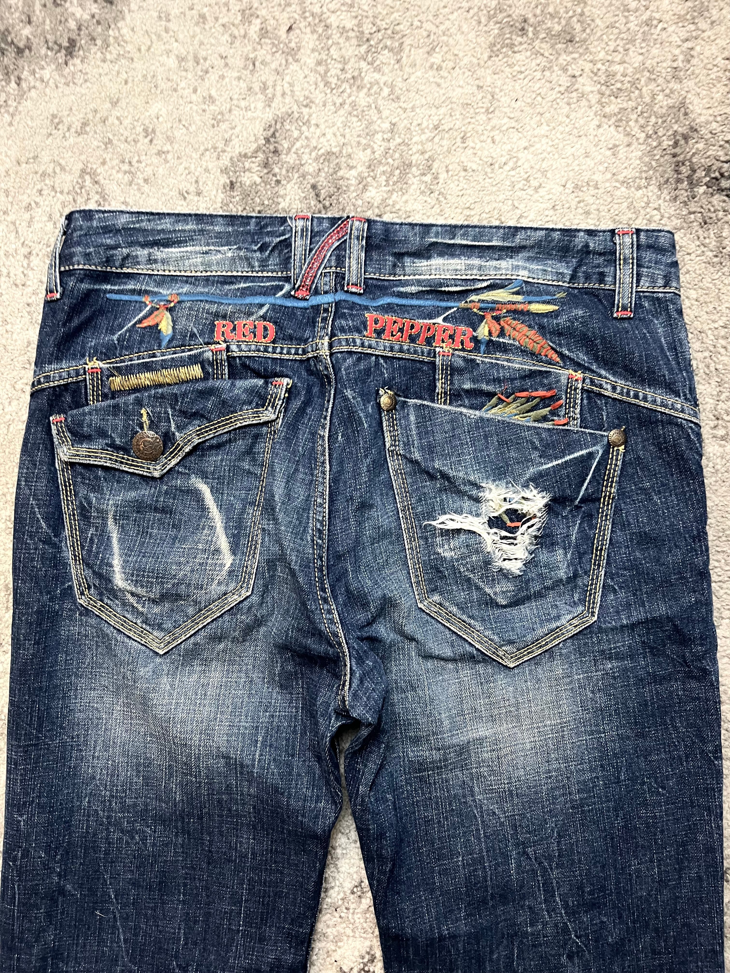 Vivid, bold, and full of attitude — this RED PEPPER denim captures the signature energy of early-2000s Japan. Cut from sturdy indigo cotton with a natural fade and whiskered wear, it’s the perfect mix of rugged texture and rebellious detail.