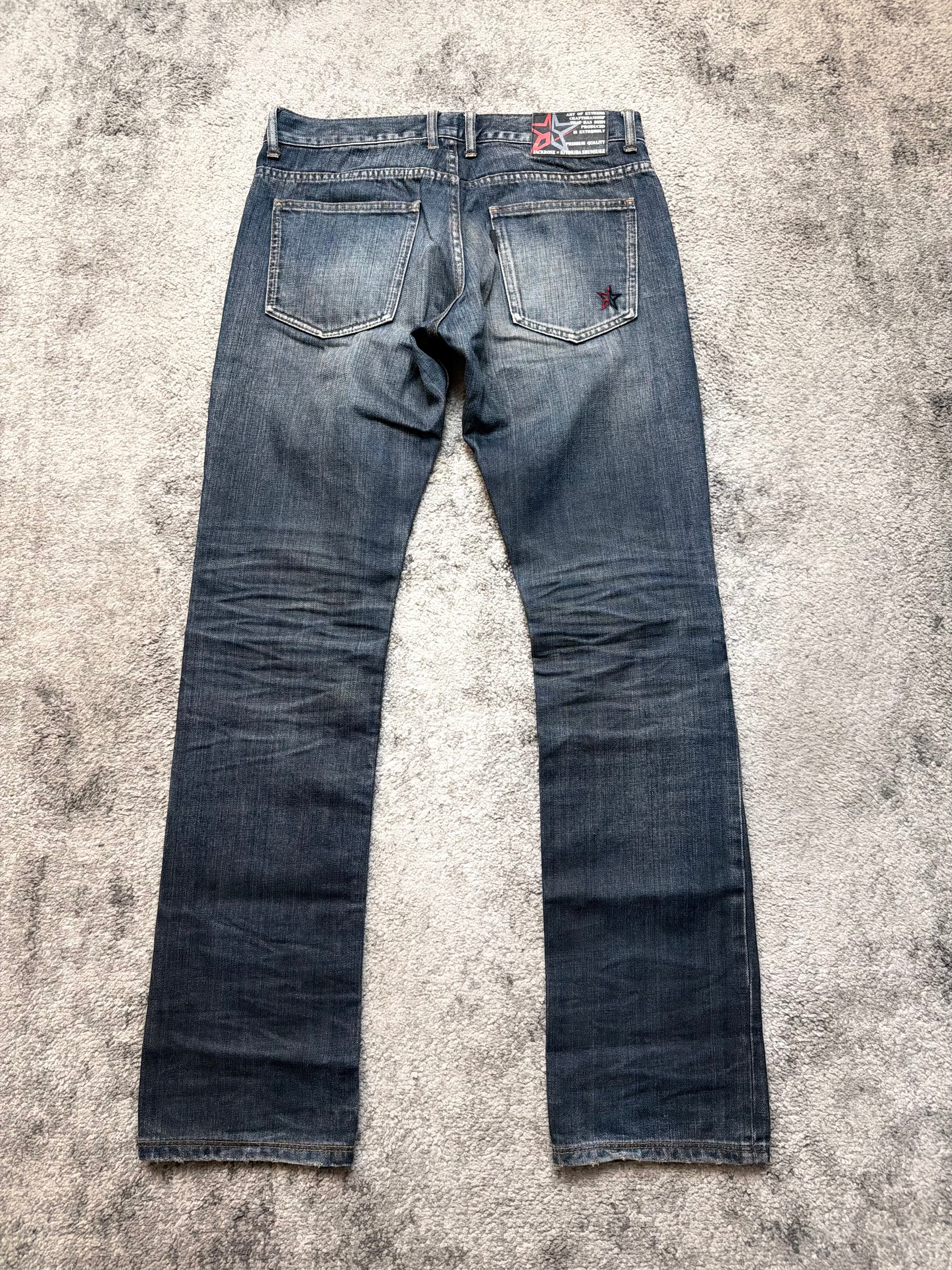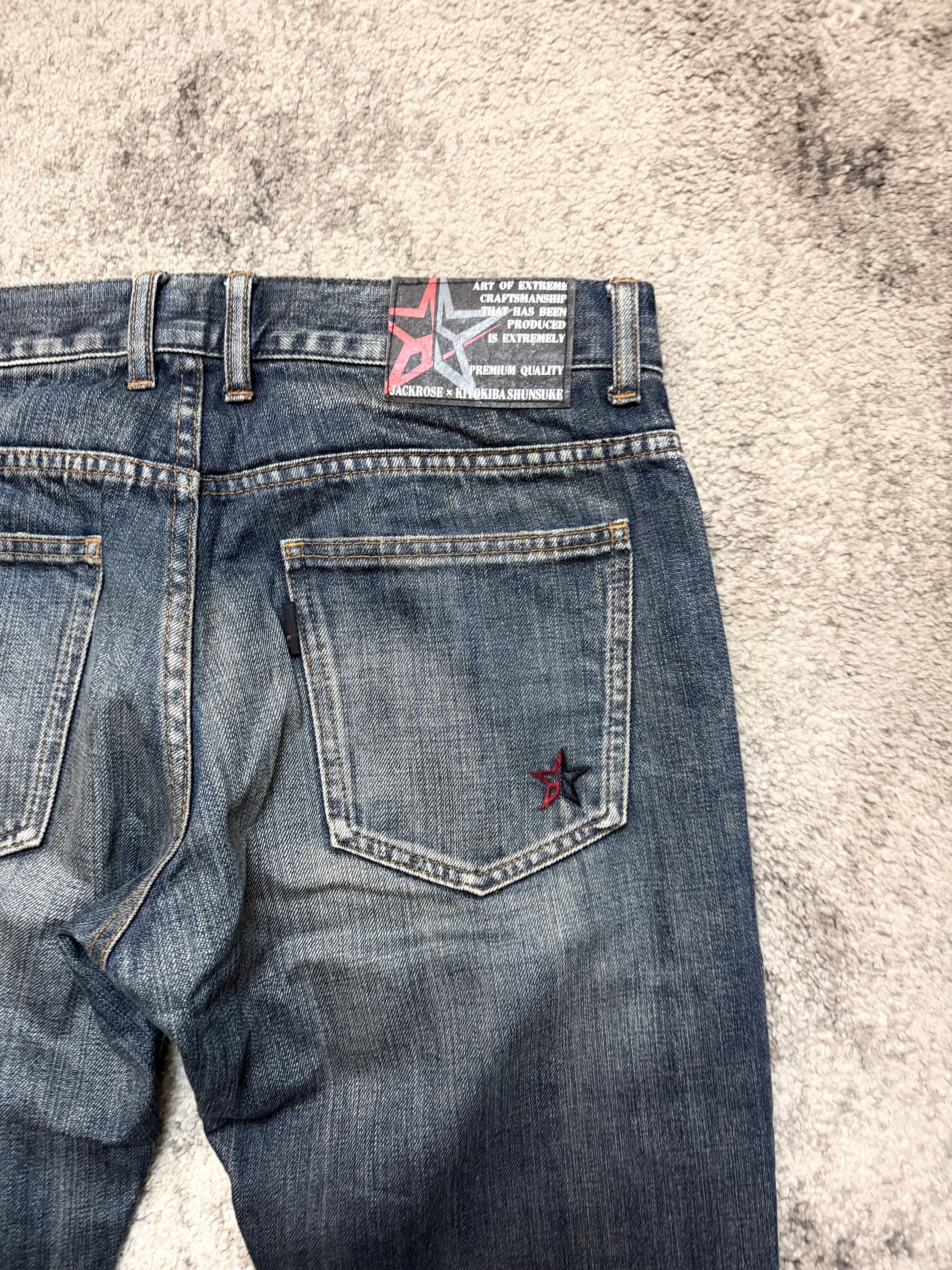 Crafted from high-quality Japanese cotton denim, they deliver a clean straight silhouette with subtle whiskering and gentle distressing. The signature detail: a small embroidered star on the back pocket, adding that quiet rebel touch JACKROSE is known for. Brass hardware, classic 5-pocket structure, and a refined mid-blue wash give them the perfect balance between rugged and understated.