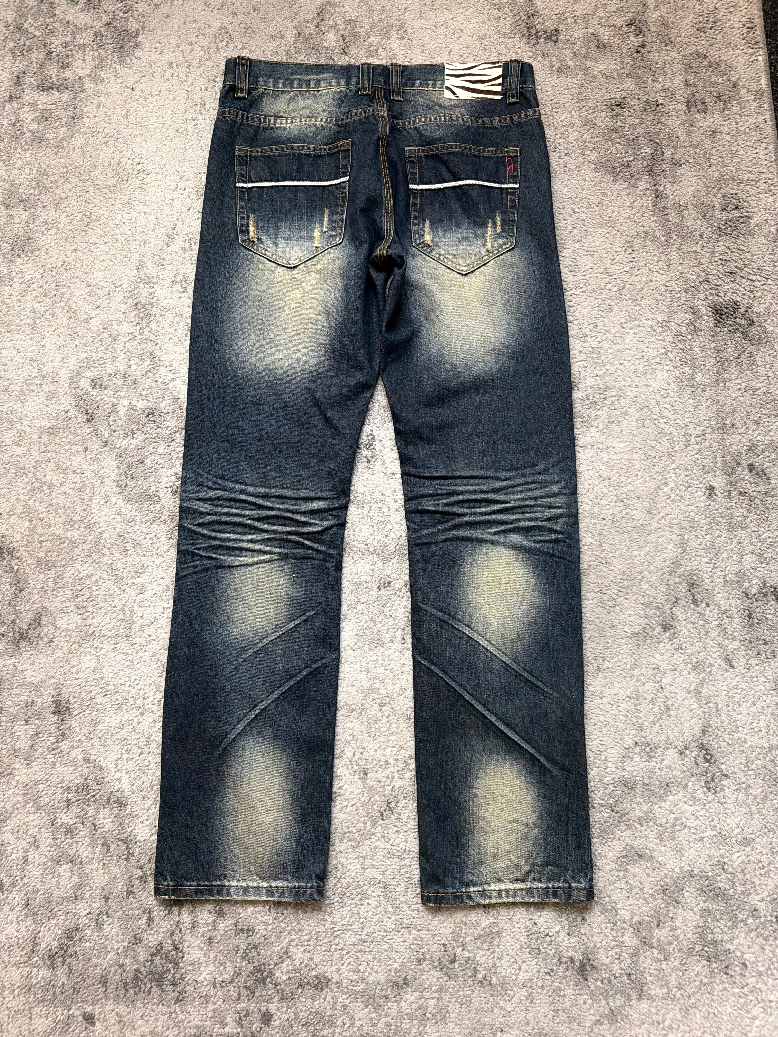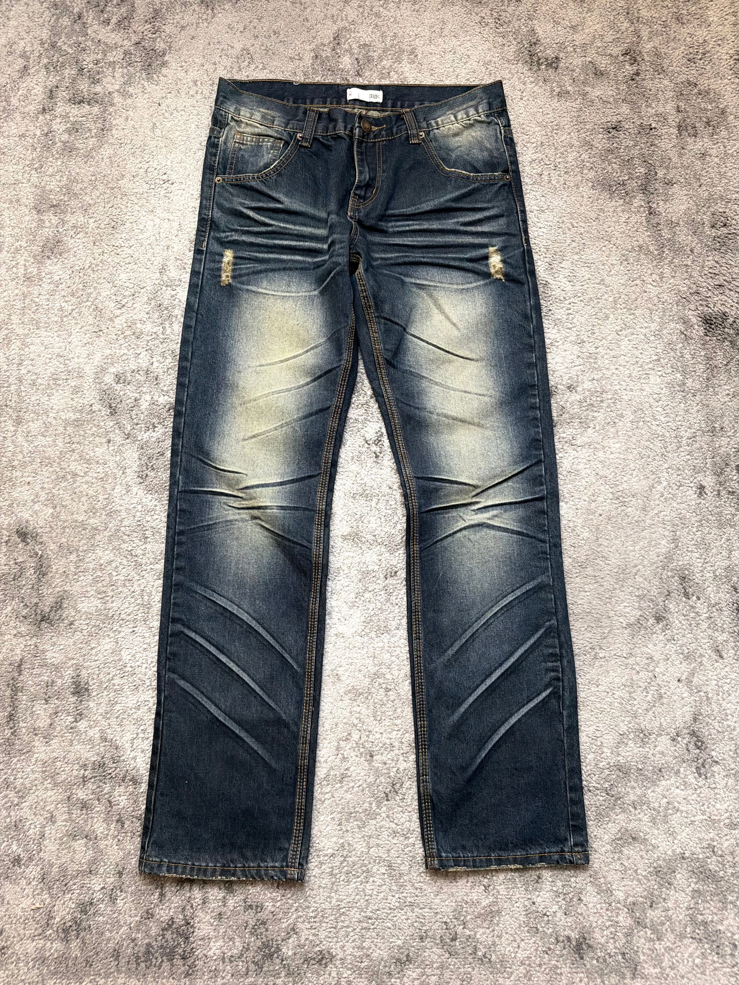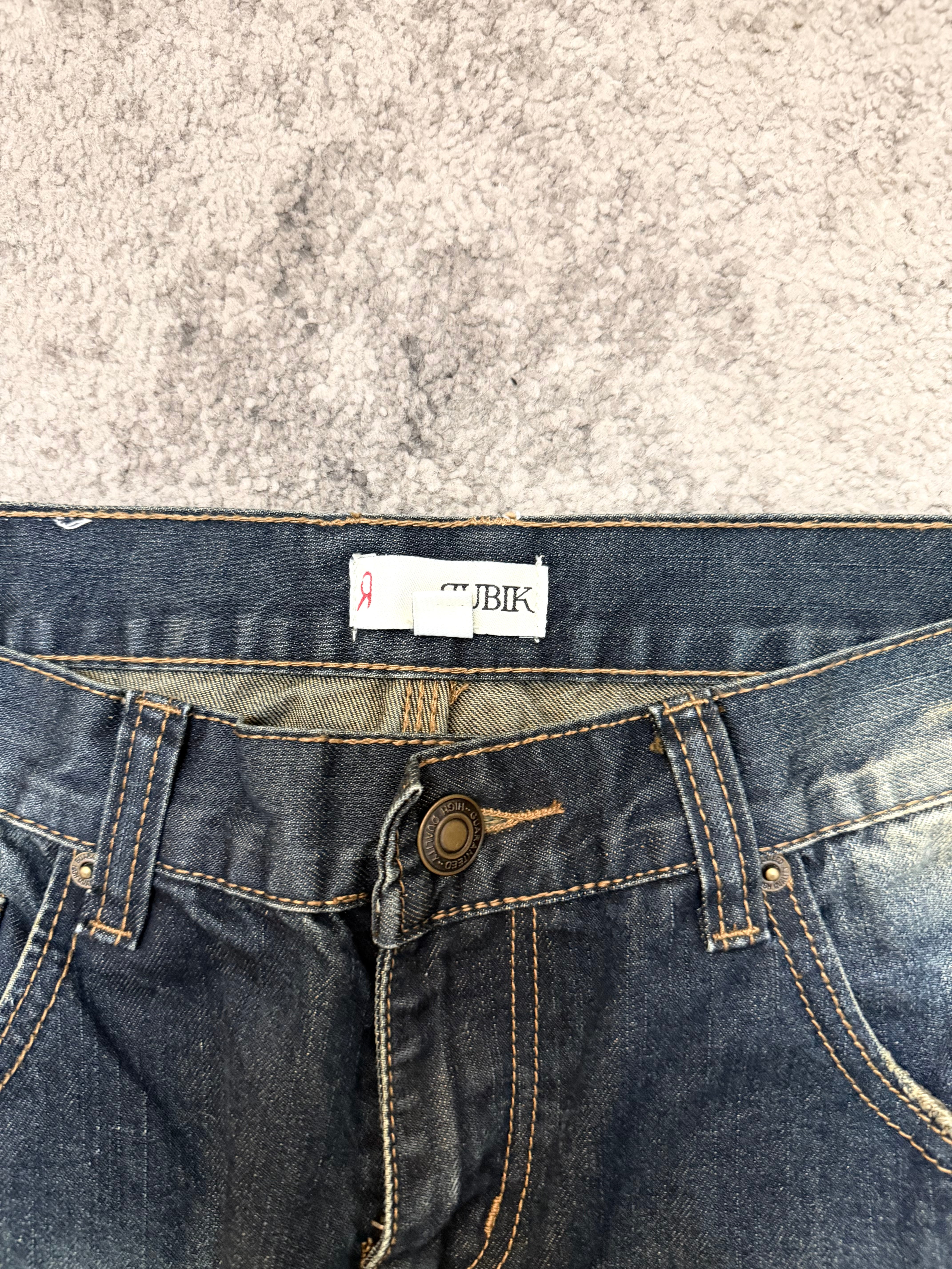 From the streets of Tokyo to the archives of forgotten subcultures, this pair from RUBIK embodies raw movement and quiet rebellion. The sharp whiskering and deep fading create a sculptural pattern — like tension captured in fabric. Minimal branding, just attitude.