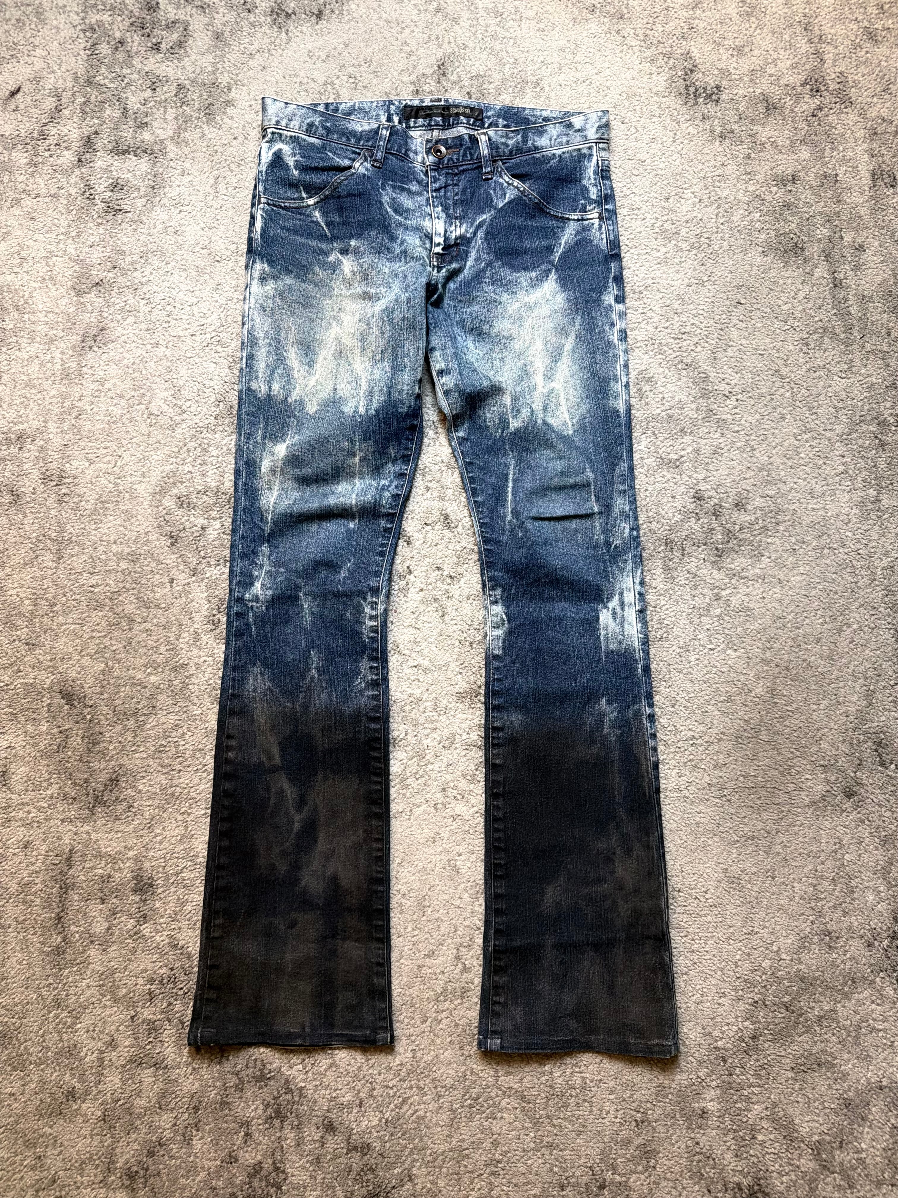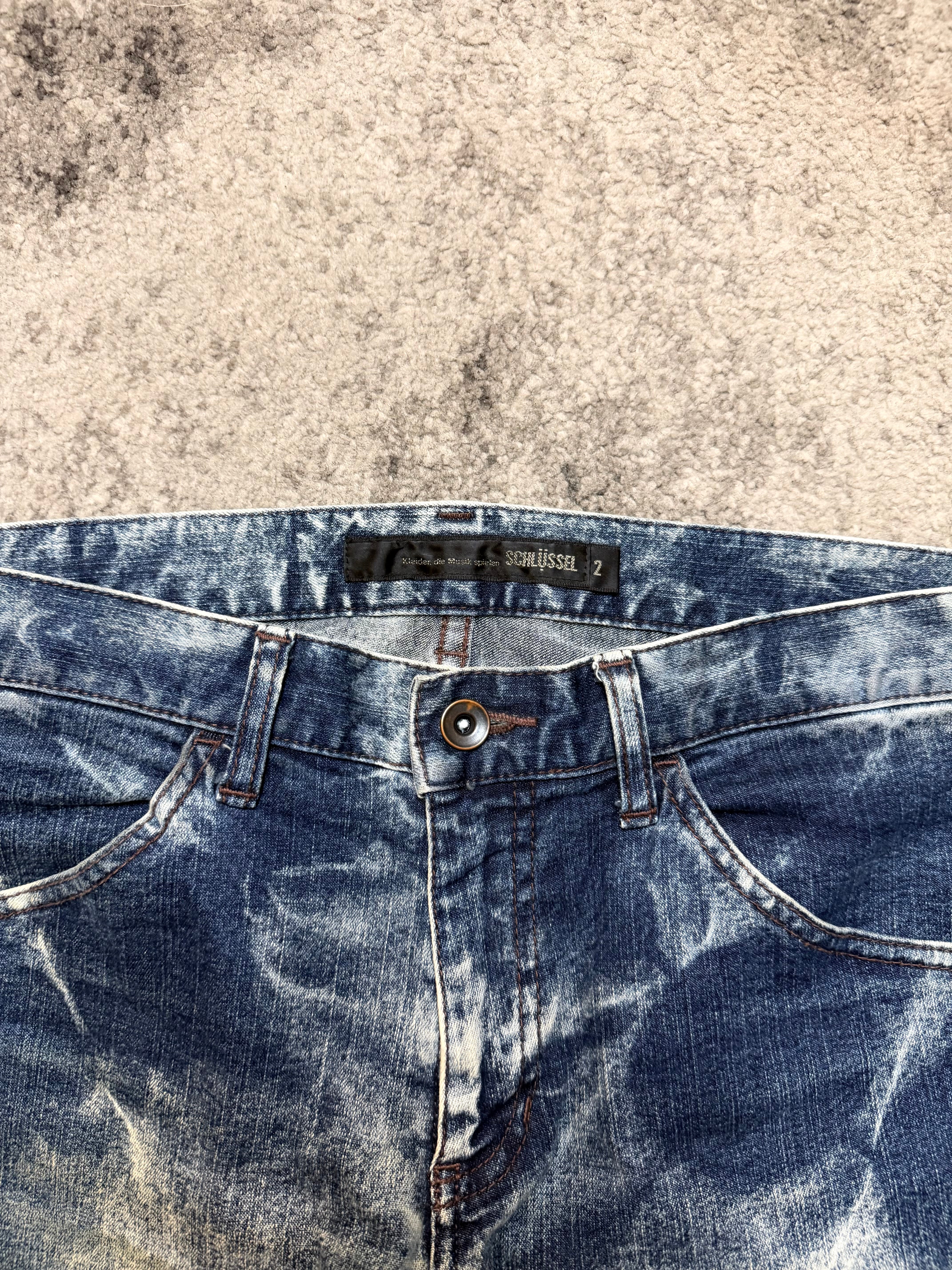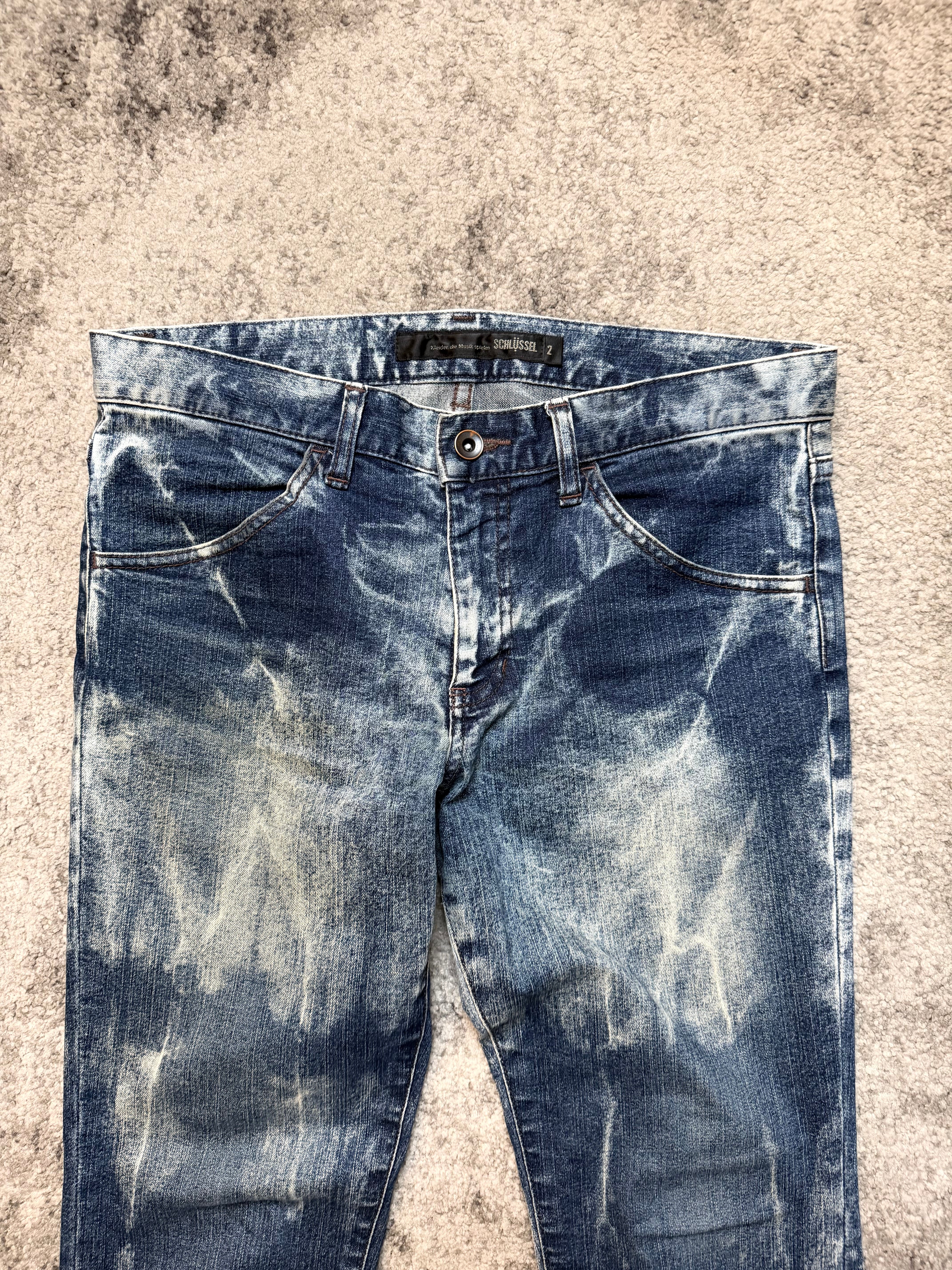A raw, electric pair of Japanese archive denim that feels like it was pulled straight from a Number (N)ine backstage rack. SCHLÜSSEL delivers a wild, storm-washed gradient—icy bleach bursts on top, fading into a deep, inky black bottom. It’s chaotic, it’s rebellious, and it’s unmistakably Japanese.