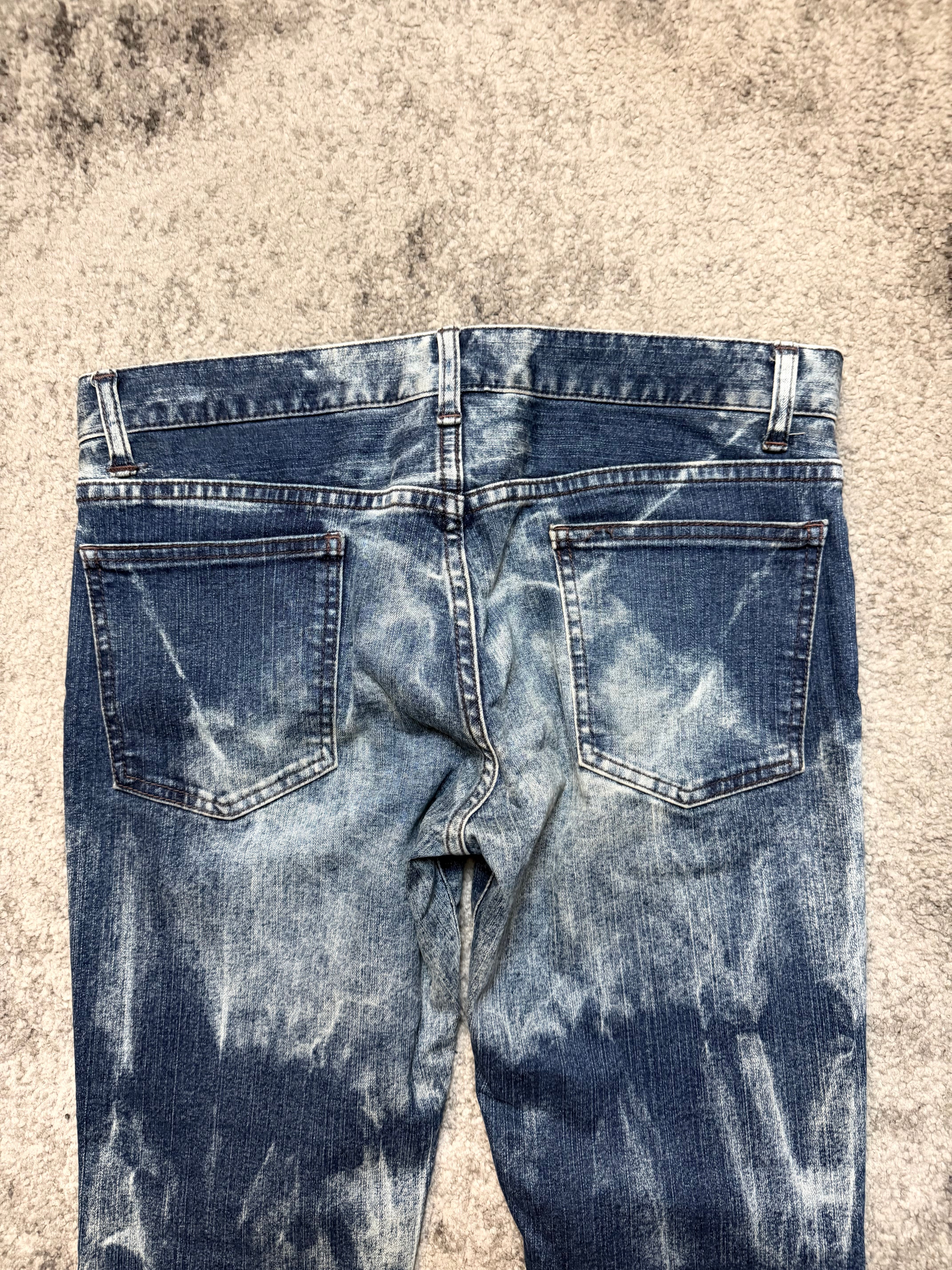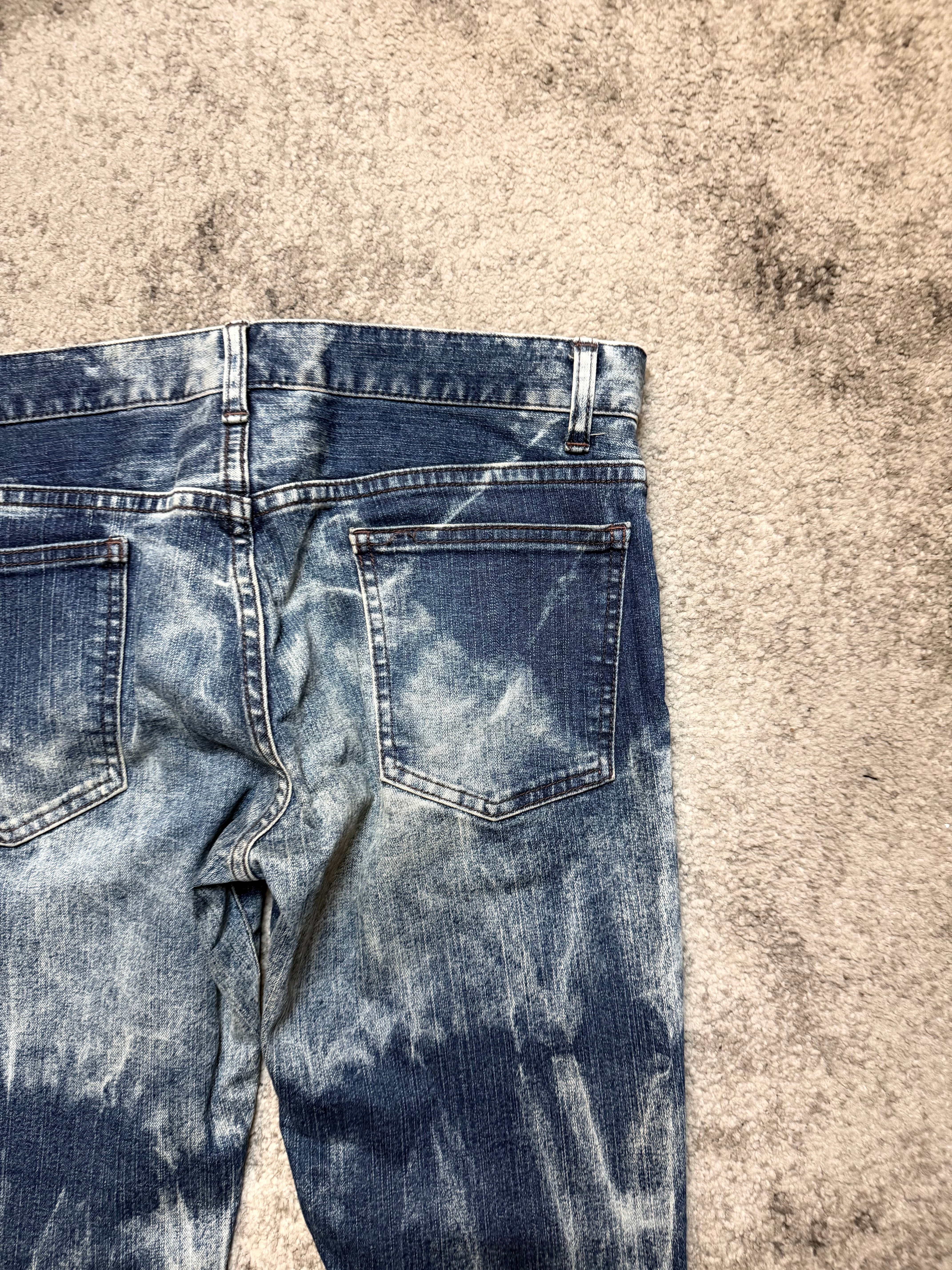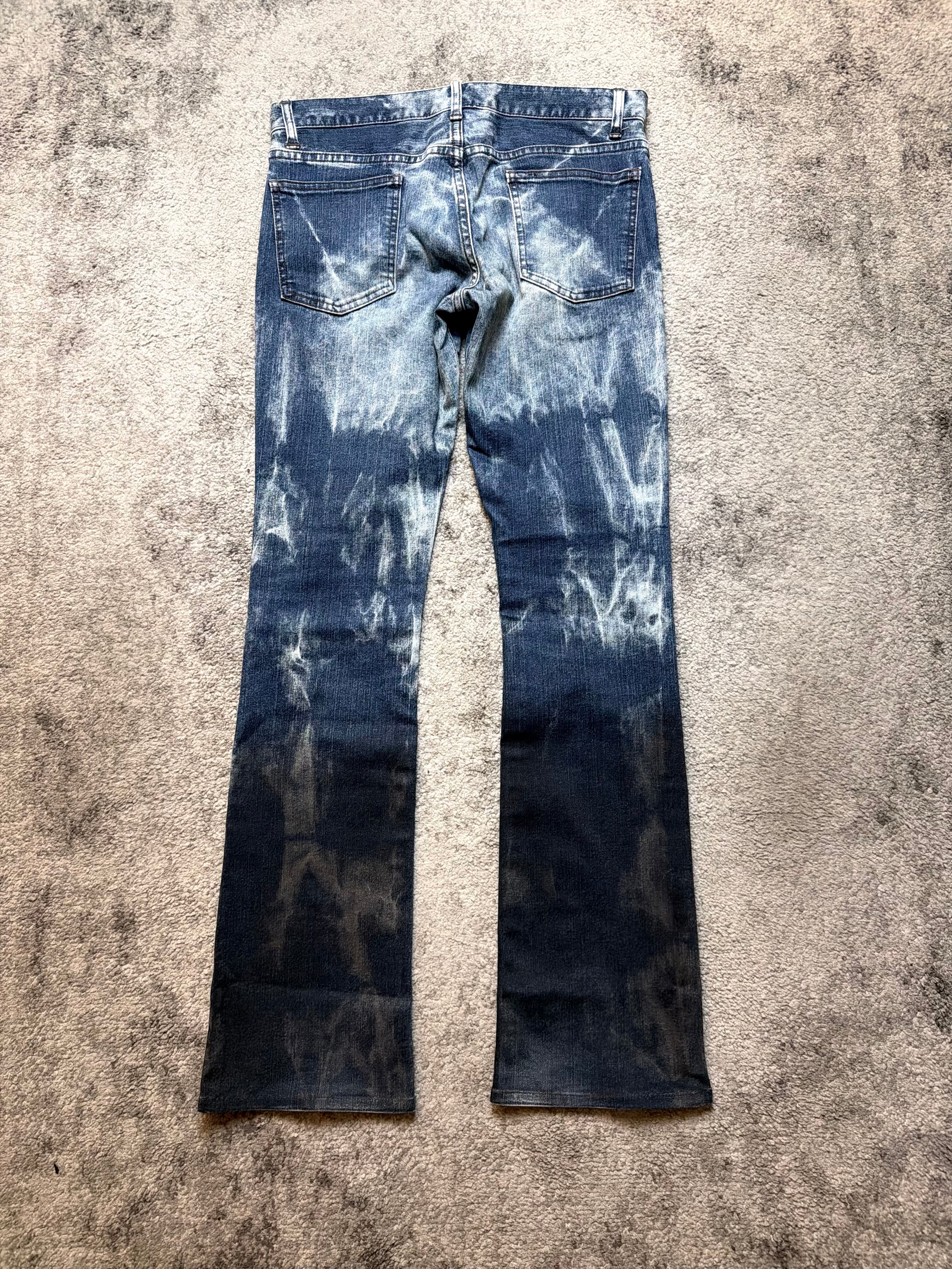 A raw, electric pair of Japanese archive denim that feels like it was pulled straight from a Number (N)ine backstage rack. SCHLÜSSEL delivers a wild, storm-washed gradient—icy bleach bursts on top, fading into a deep, inky black bottom. It’s chaotic, it’s rebellious, and it’s unmistakably Japanese.