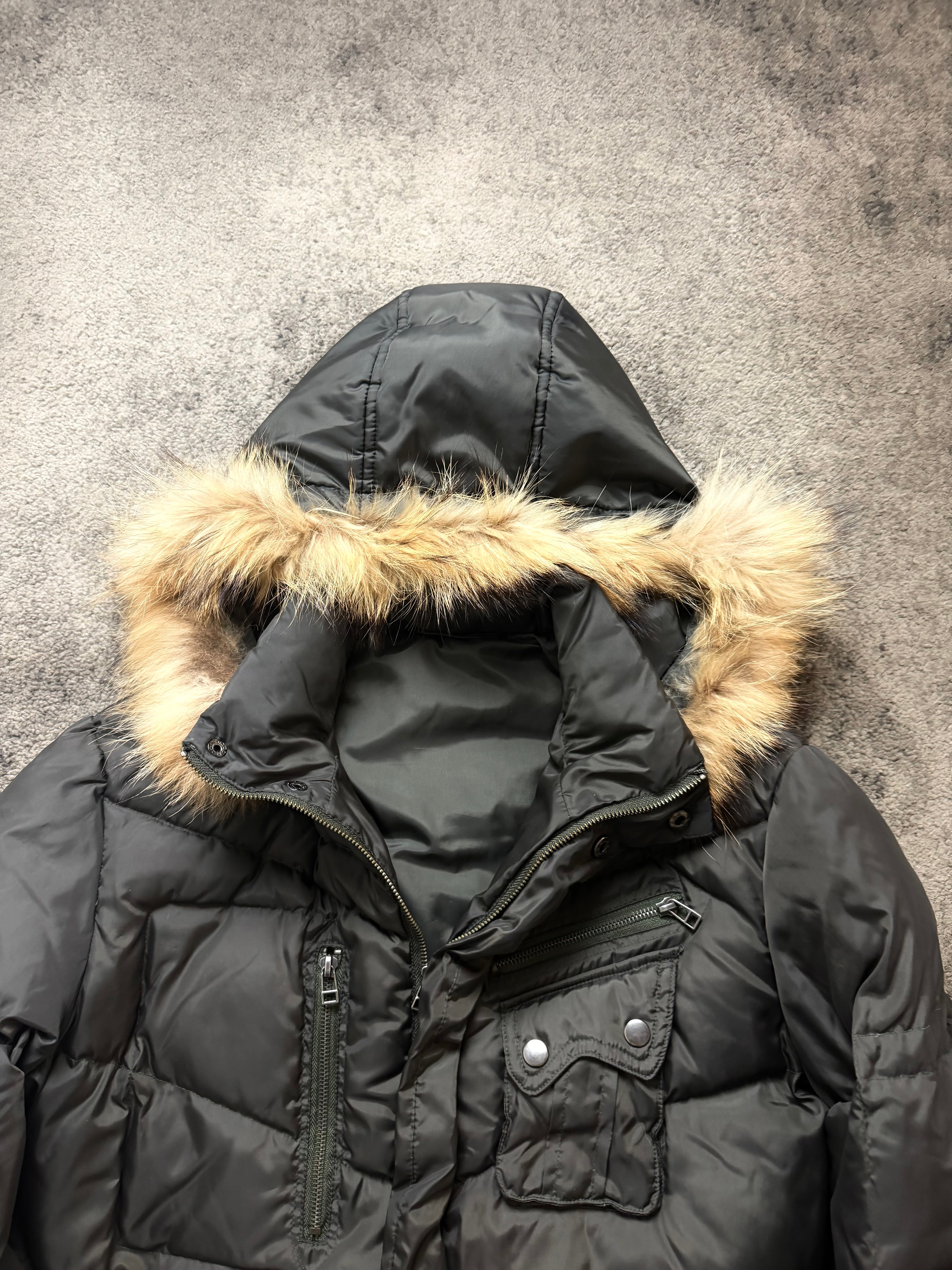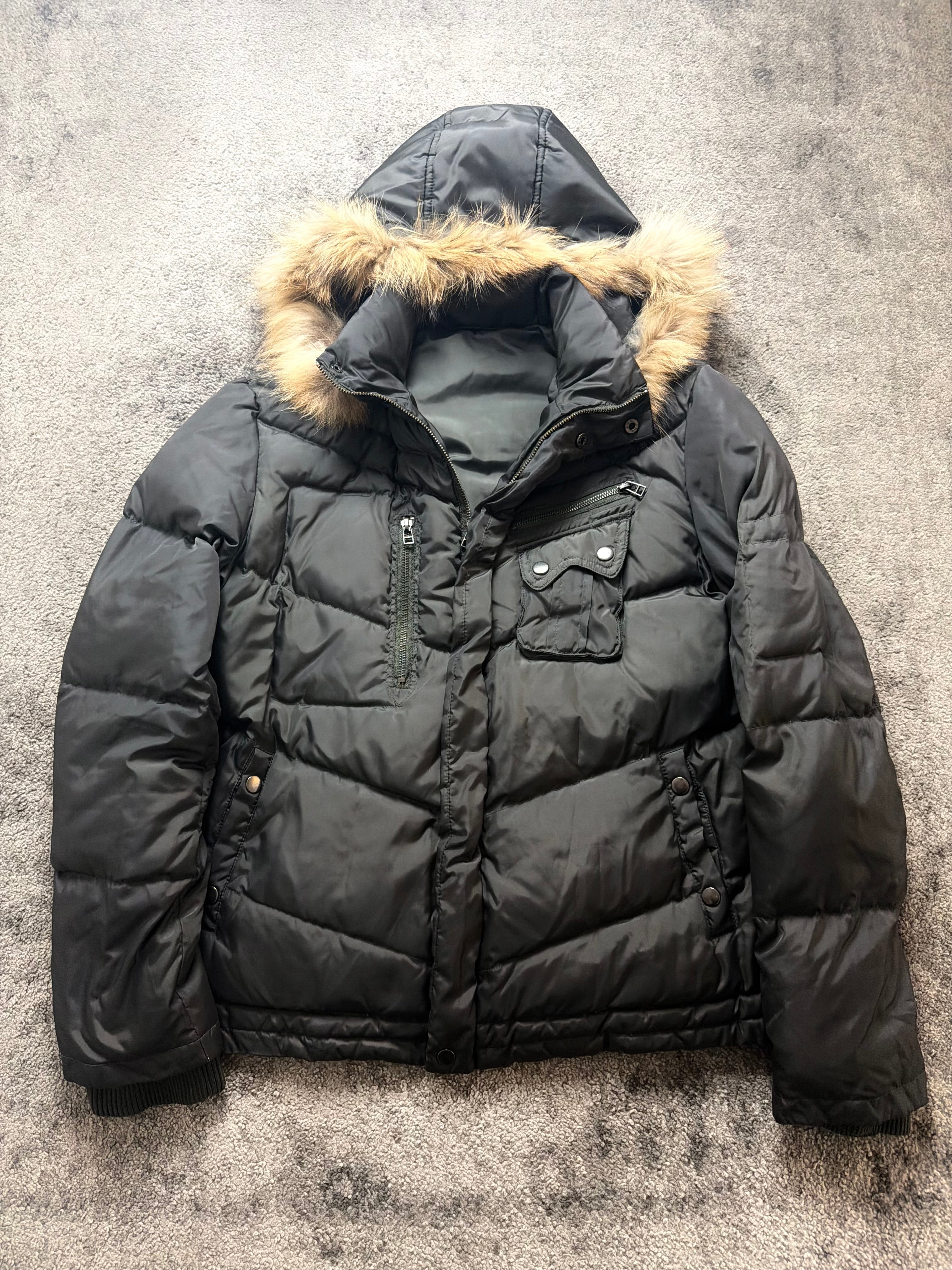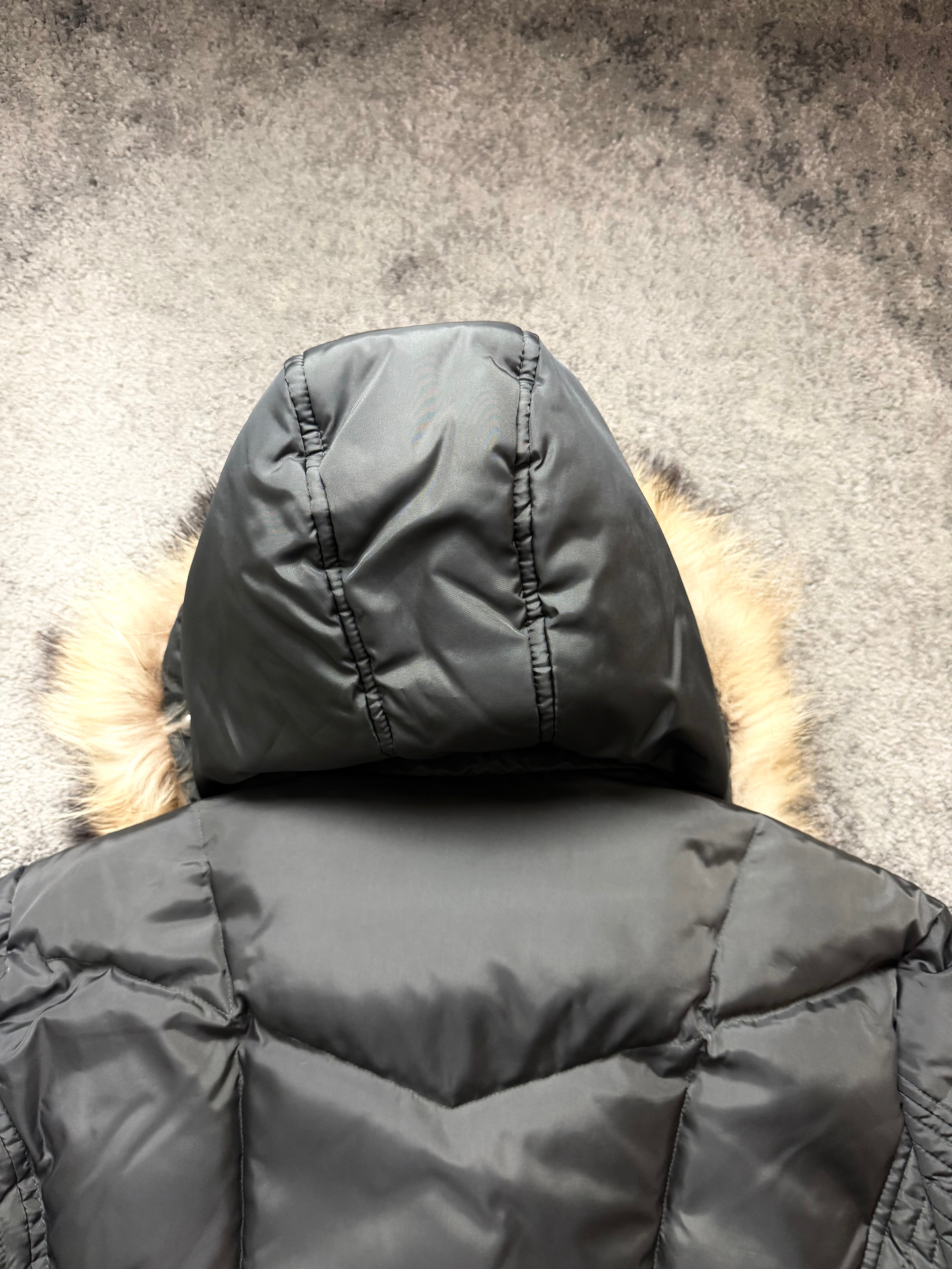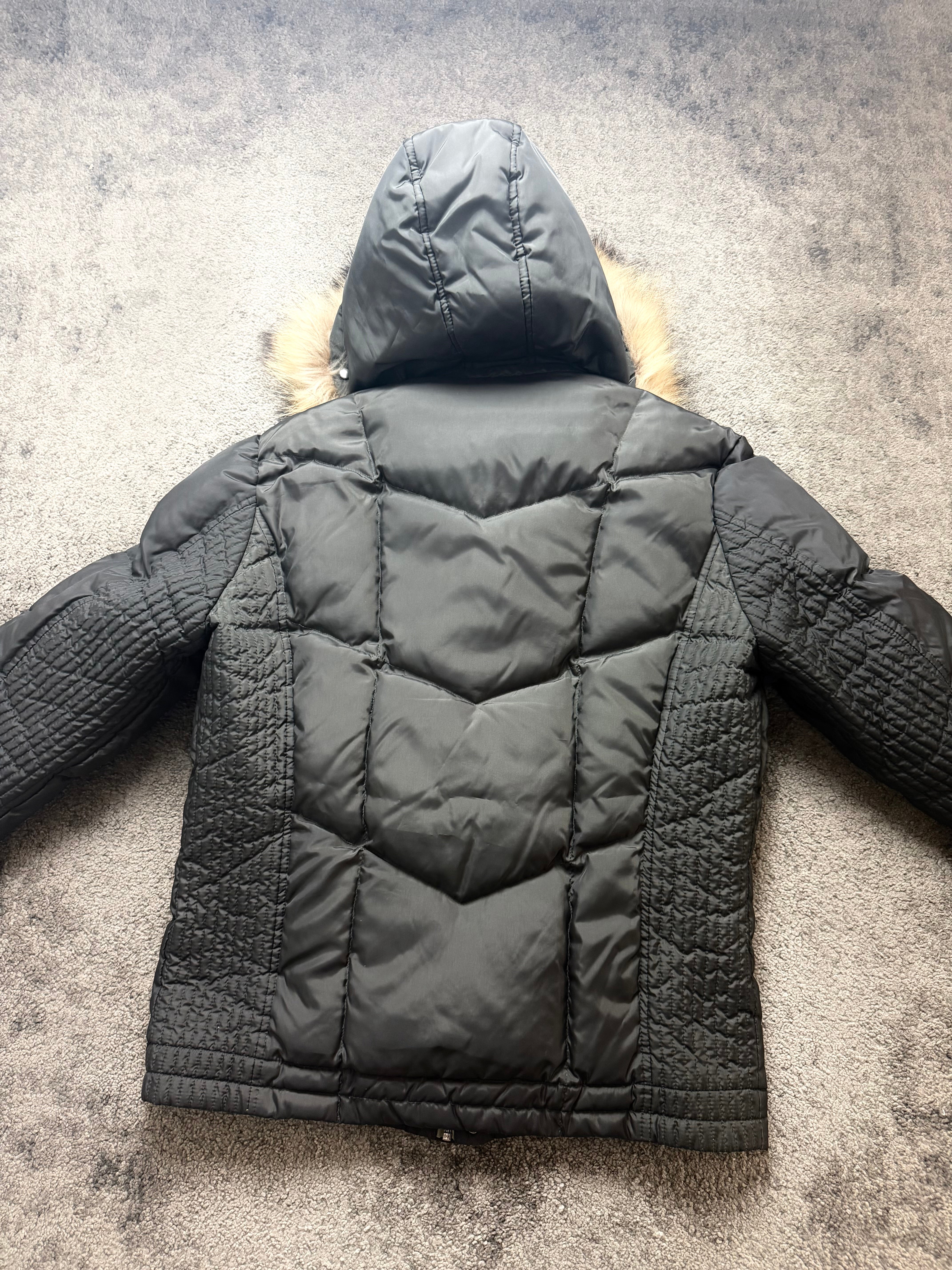 Material: Padded synthetic down with a matte black shell. Smooth inner lining, ribbed cuffs, and a fur-trim hood for warmth and presence.
