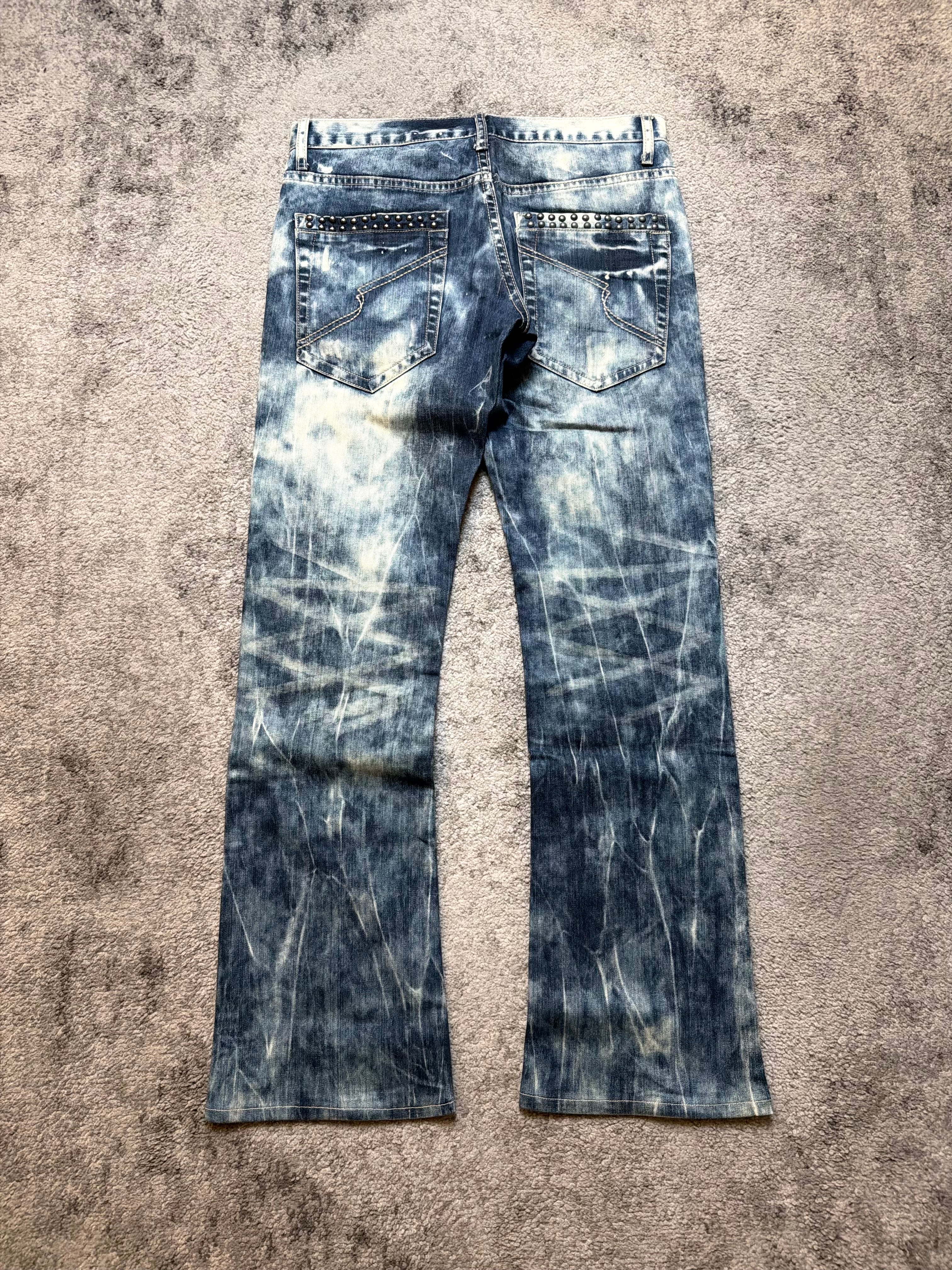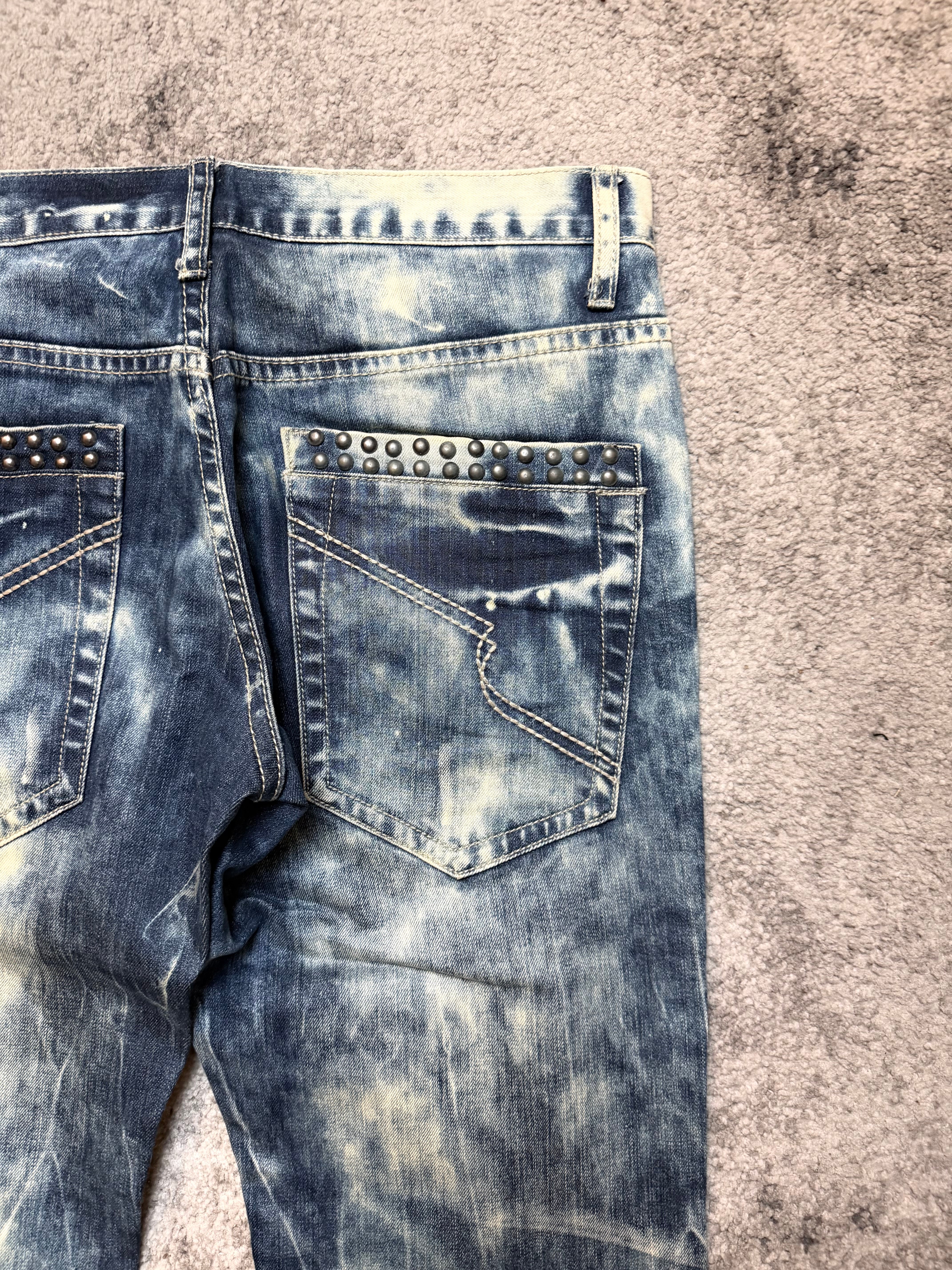 Crafted from mid-weight Japanese cotton denim, these pants have that unmistakable washed-out, streaked patterning—almost like frozen lightning across the legs. The back pockets feature tonal stitching and subtle metal detailing, giving it that underground Harajuku energy.