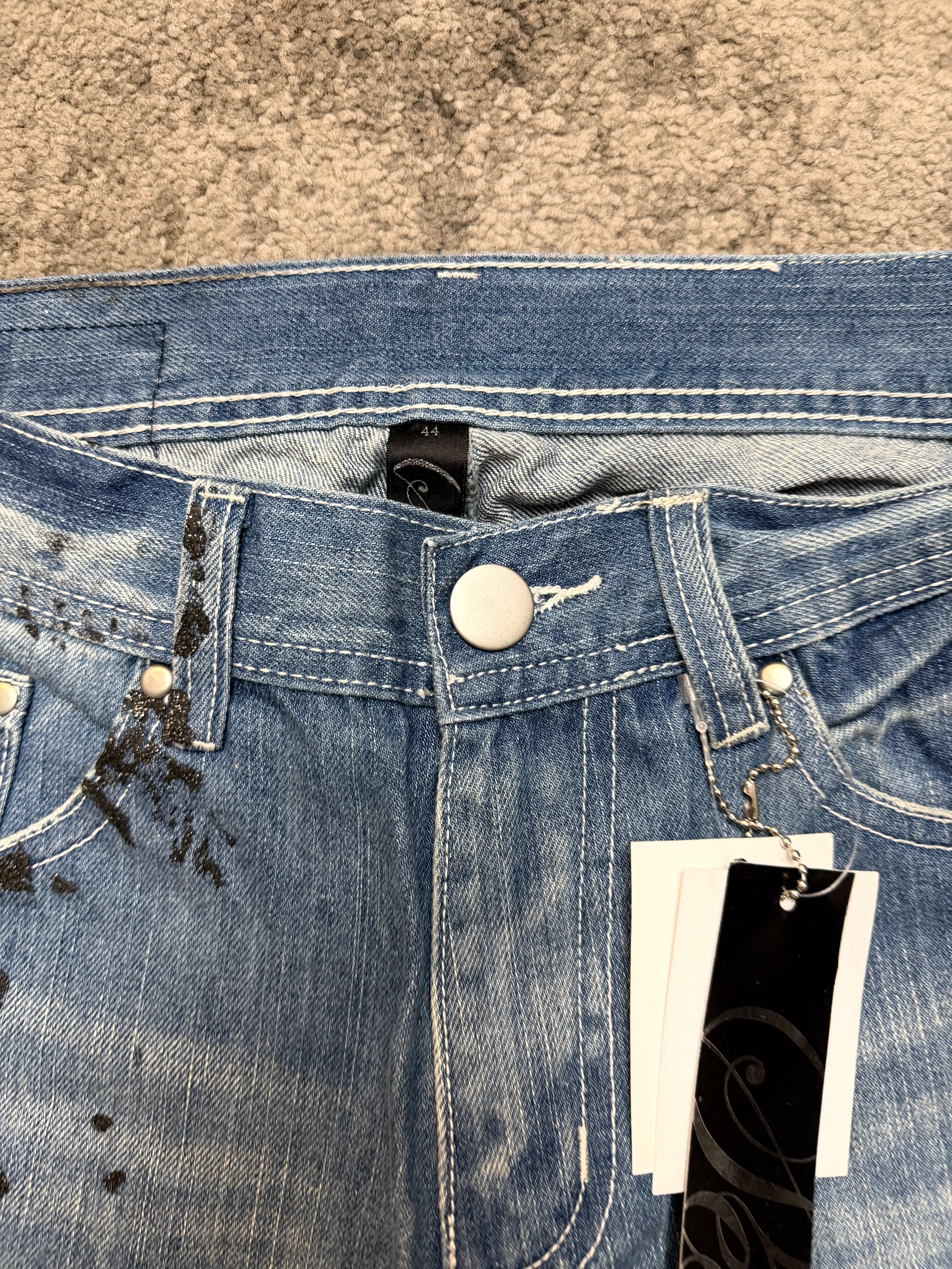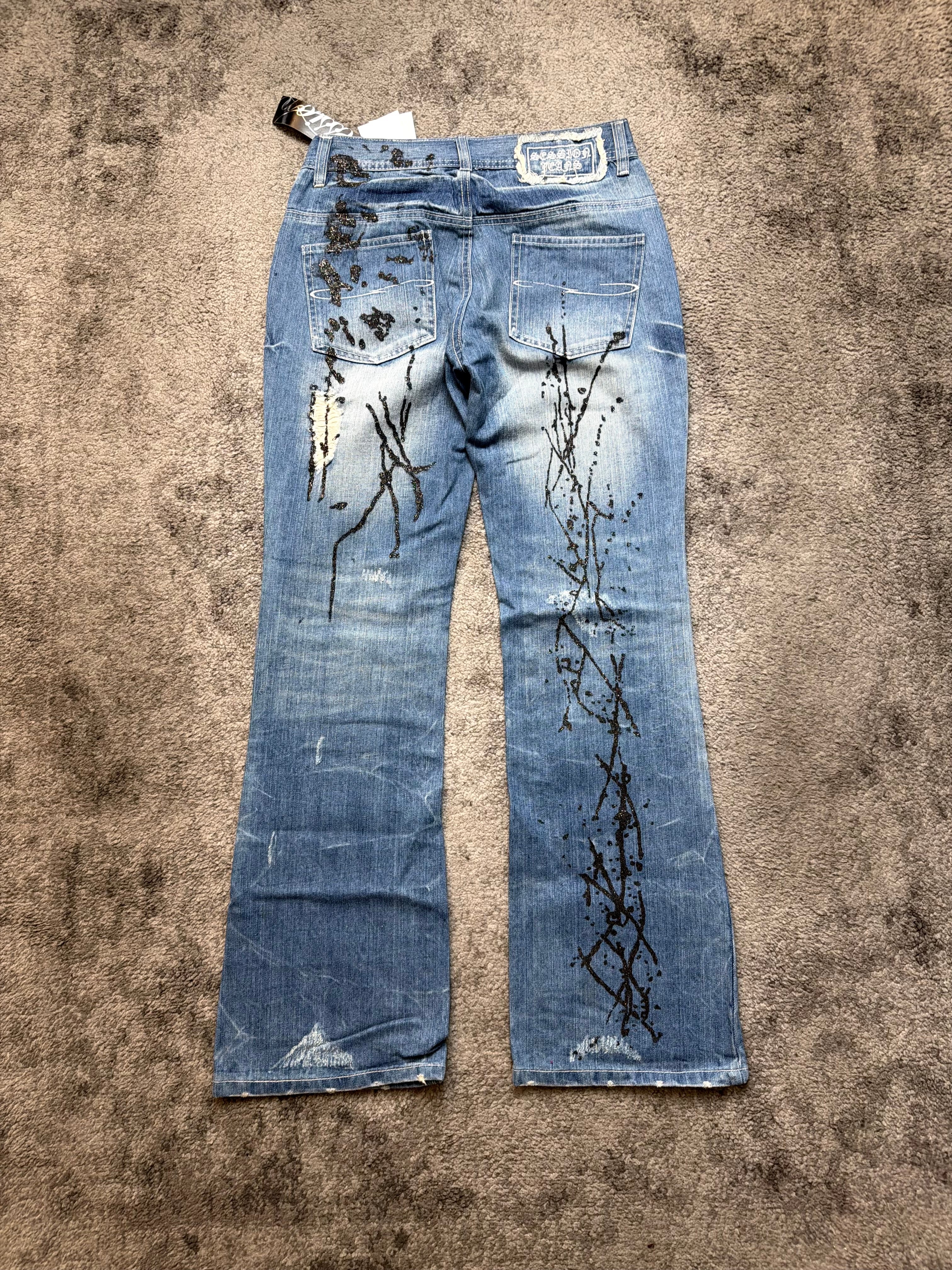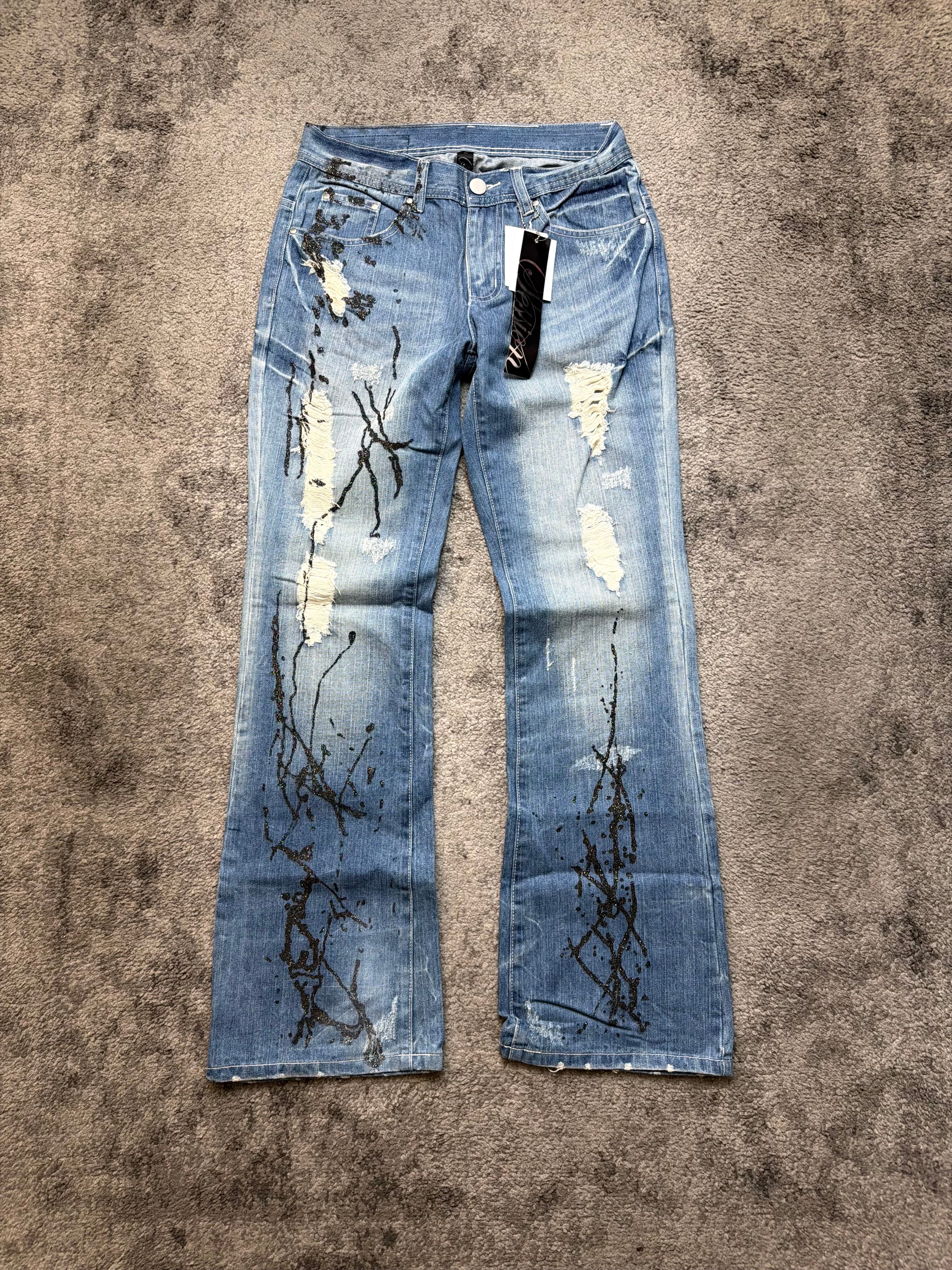 The silhouette sits in that perfect S–M zone: a straight cut with subtle flare, giving you that effortless 2000s Tokyo street silhouette. Back pockets carry the same paint-splatter narrative, creating a 360° art piece rather than just a pair of jeans.