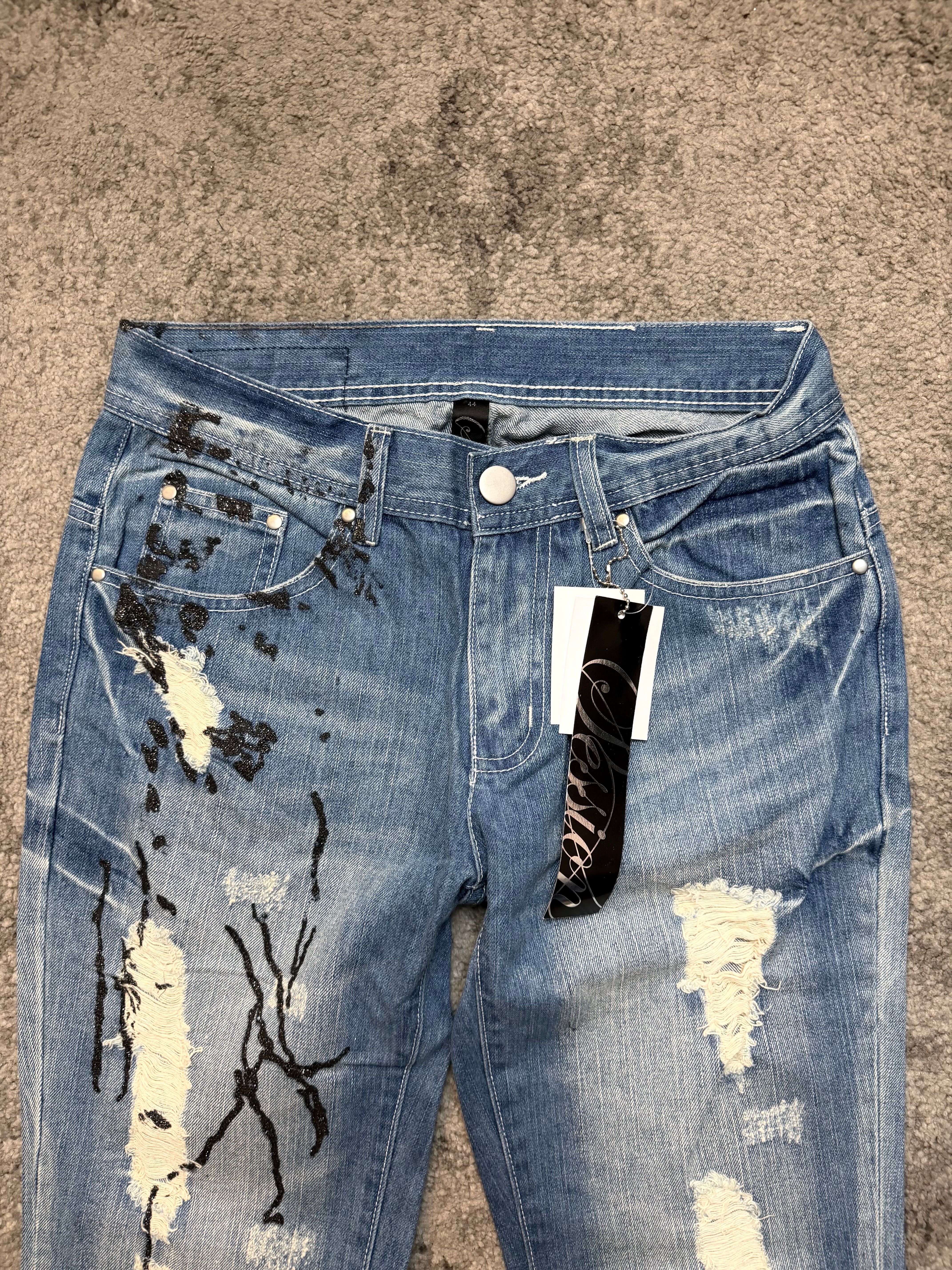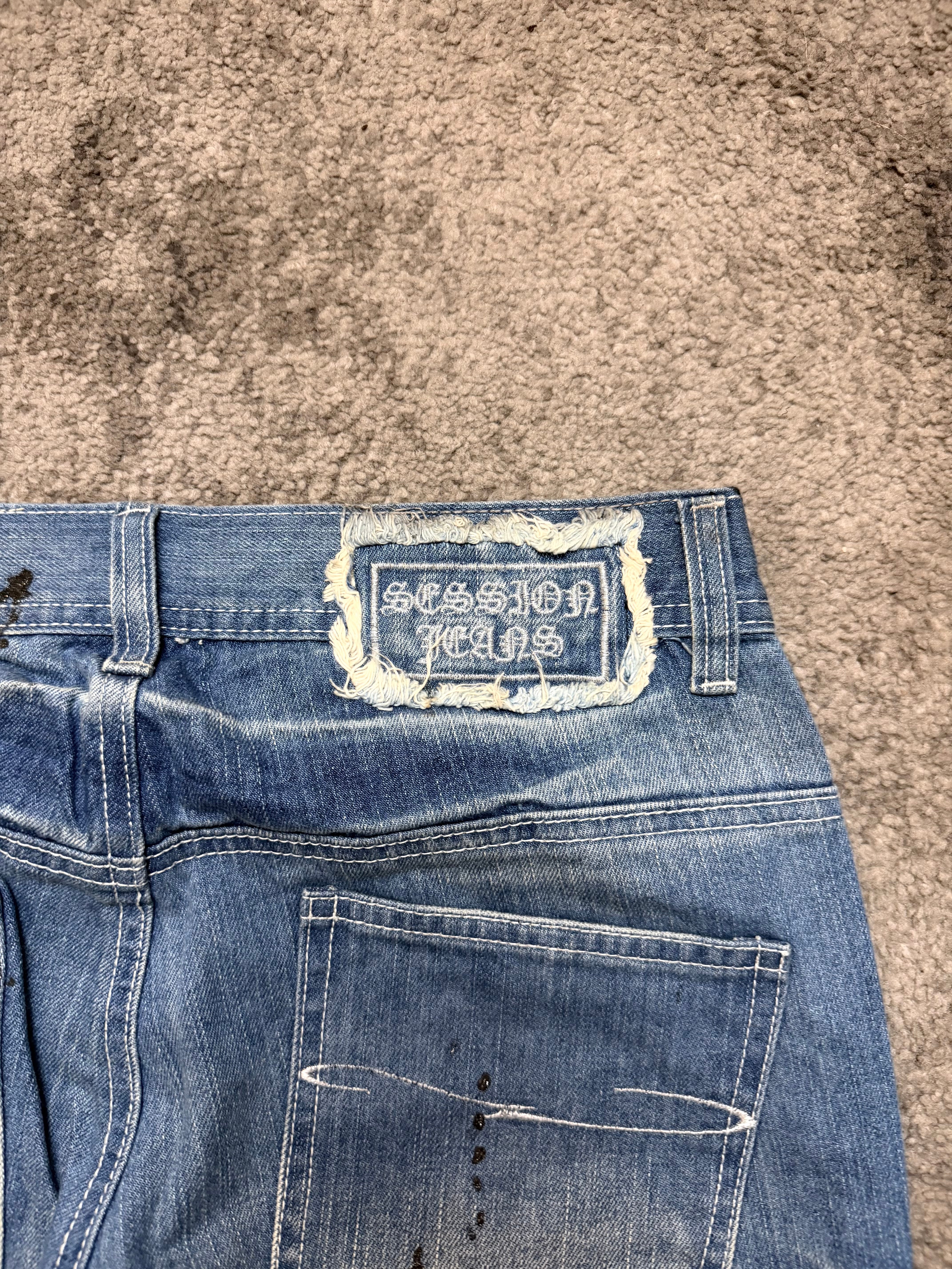 A raw, untamed expression of Japanese archive energy — these SESSION jeans channel that Number (N)ine / ifsixwasnine outsider spirit with a vivid, almost painterly destruction. The icy blue wash is splashed with dramatic black paint drips, layered over shredded distressing and natural wear patterns that feel lived-in, never manufactured.