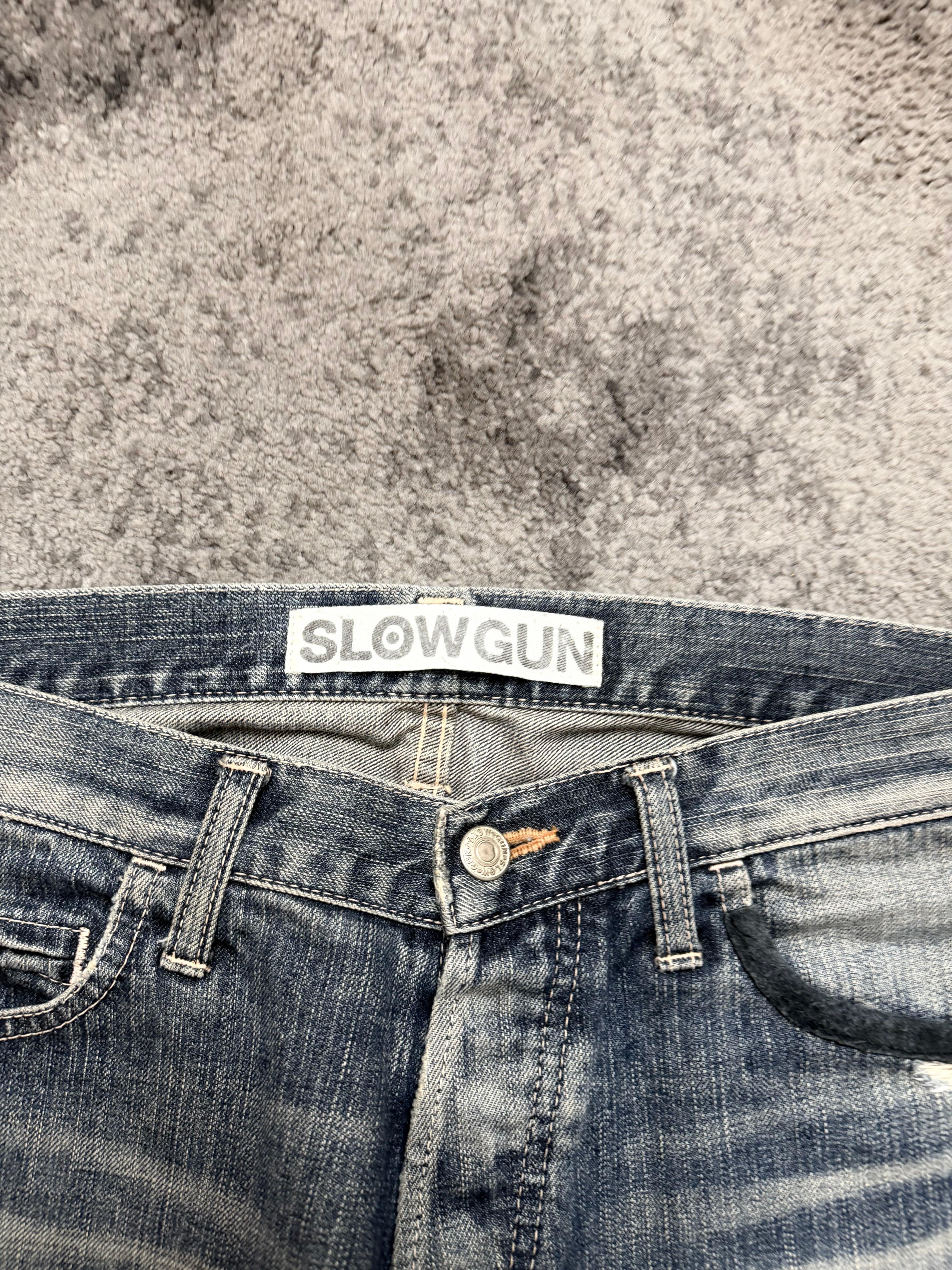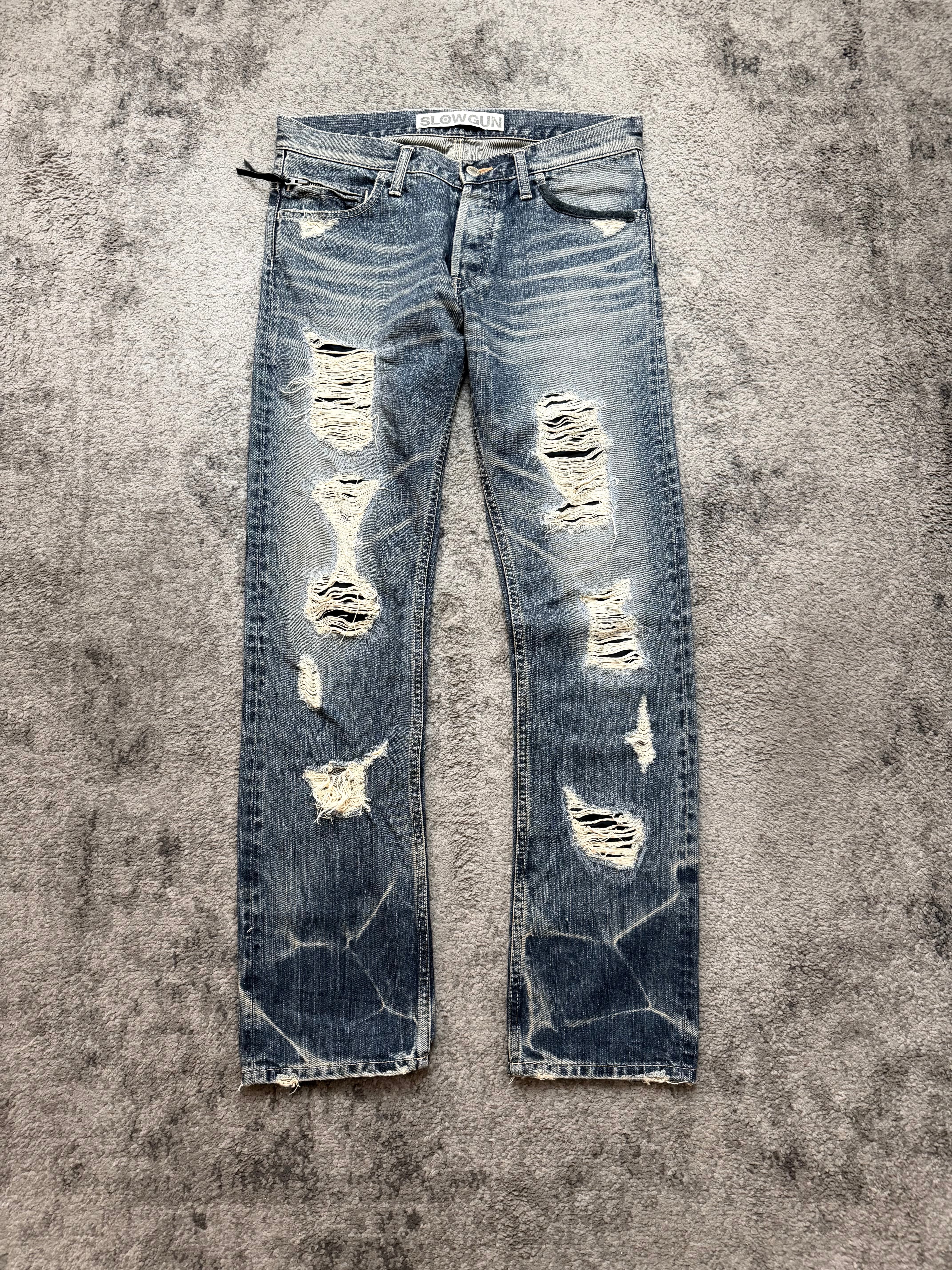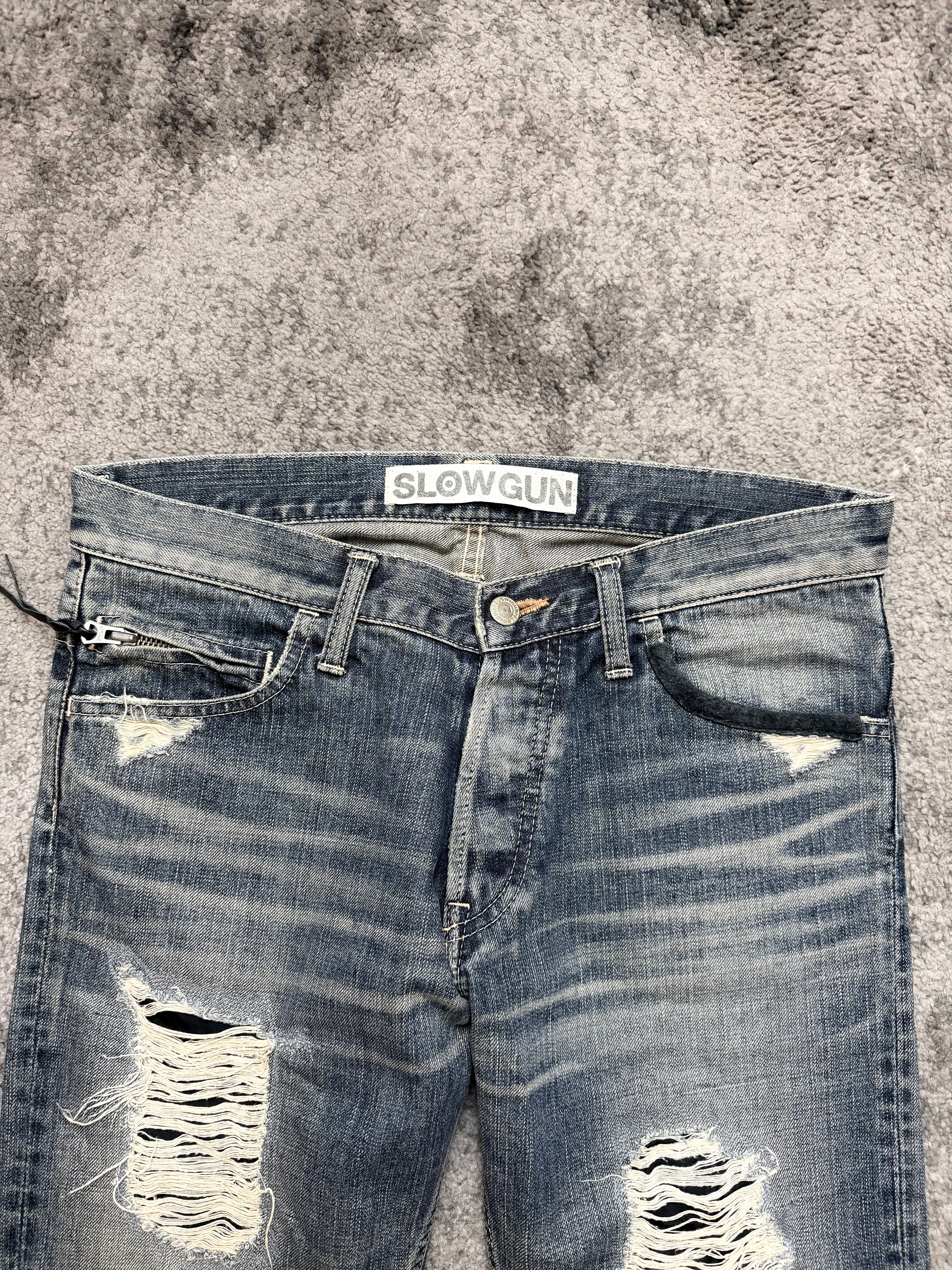 Slowgun “Shattered Lovers” Distressed Denim – broken dreams stitched into midnight blue.