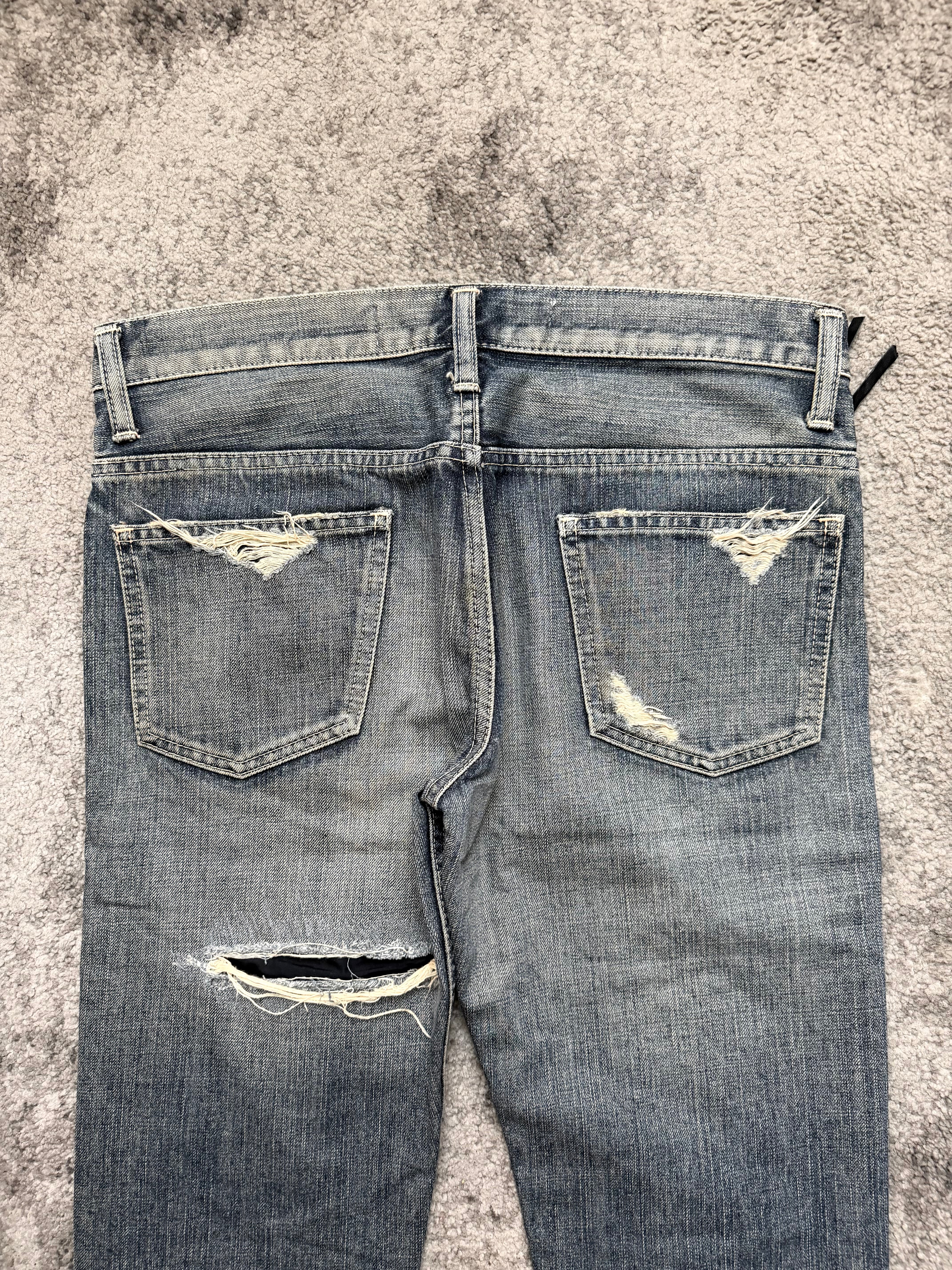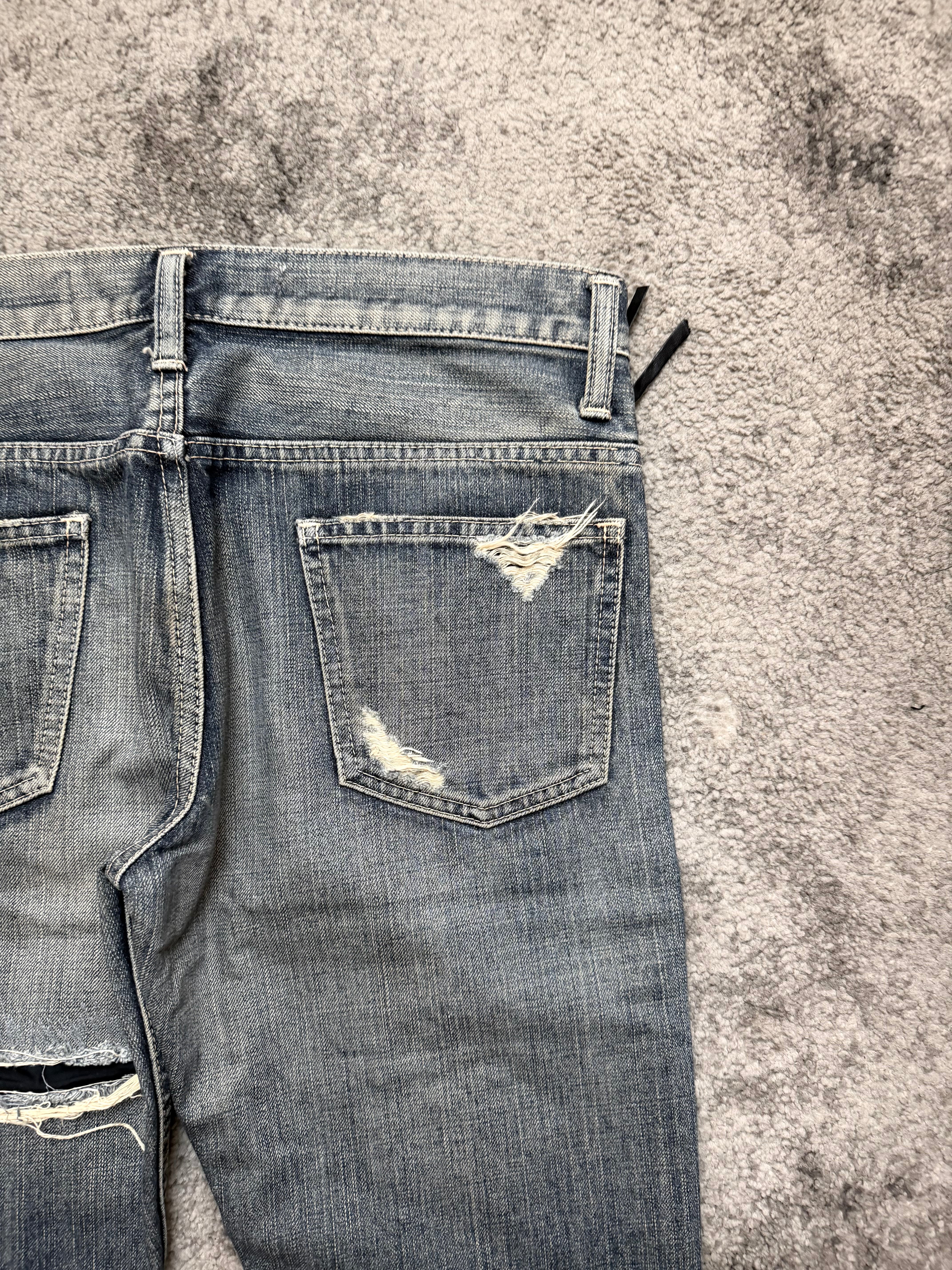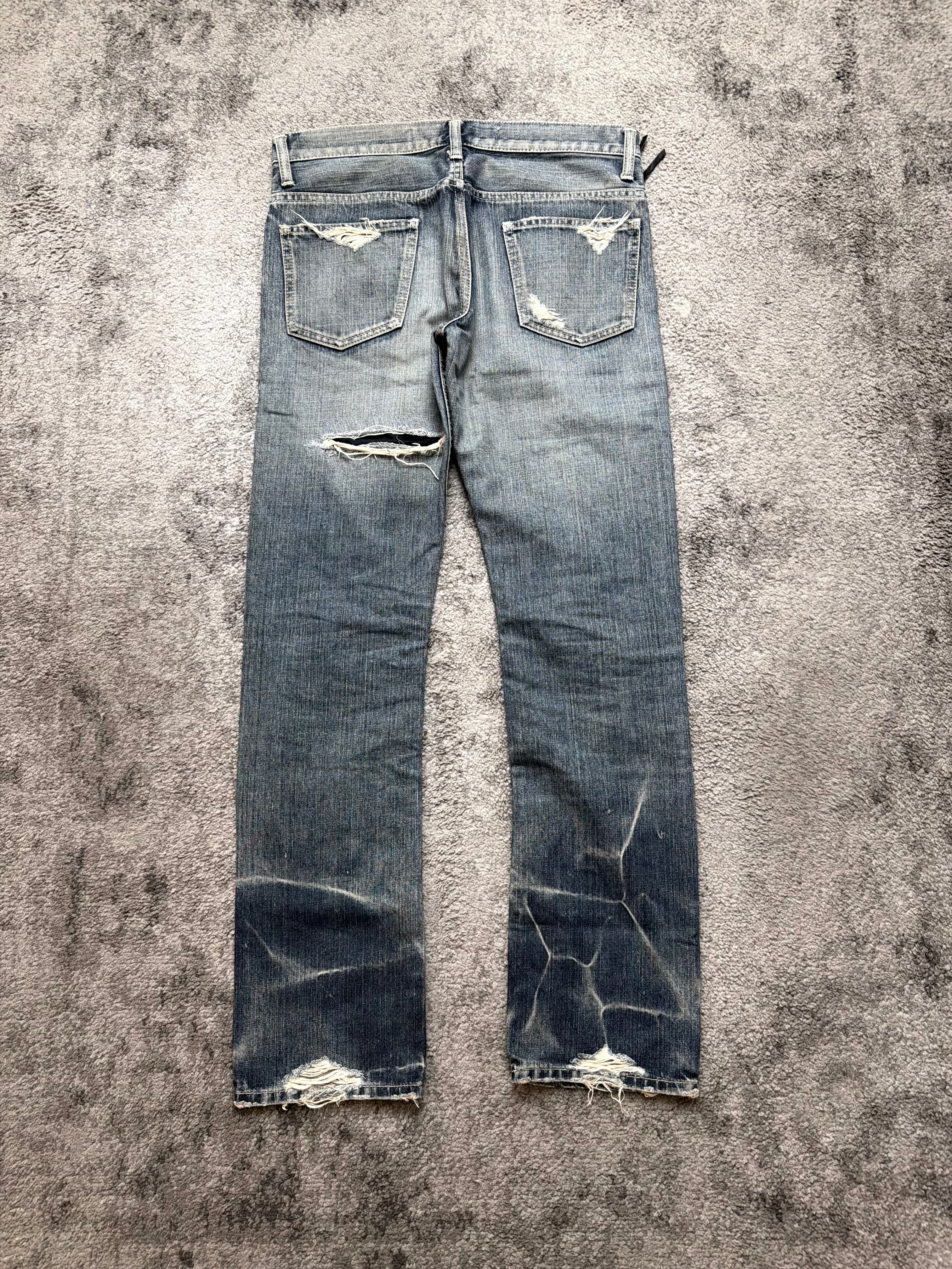 Heavily distressed and intentionally destroyed – every tear earned, every fade authentic. Softened through wear but still structurally strong. True Japanese pre-loved character.