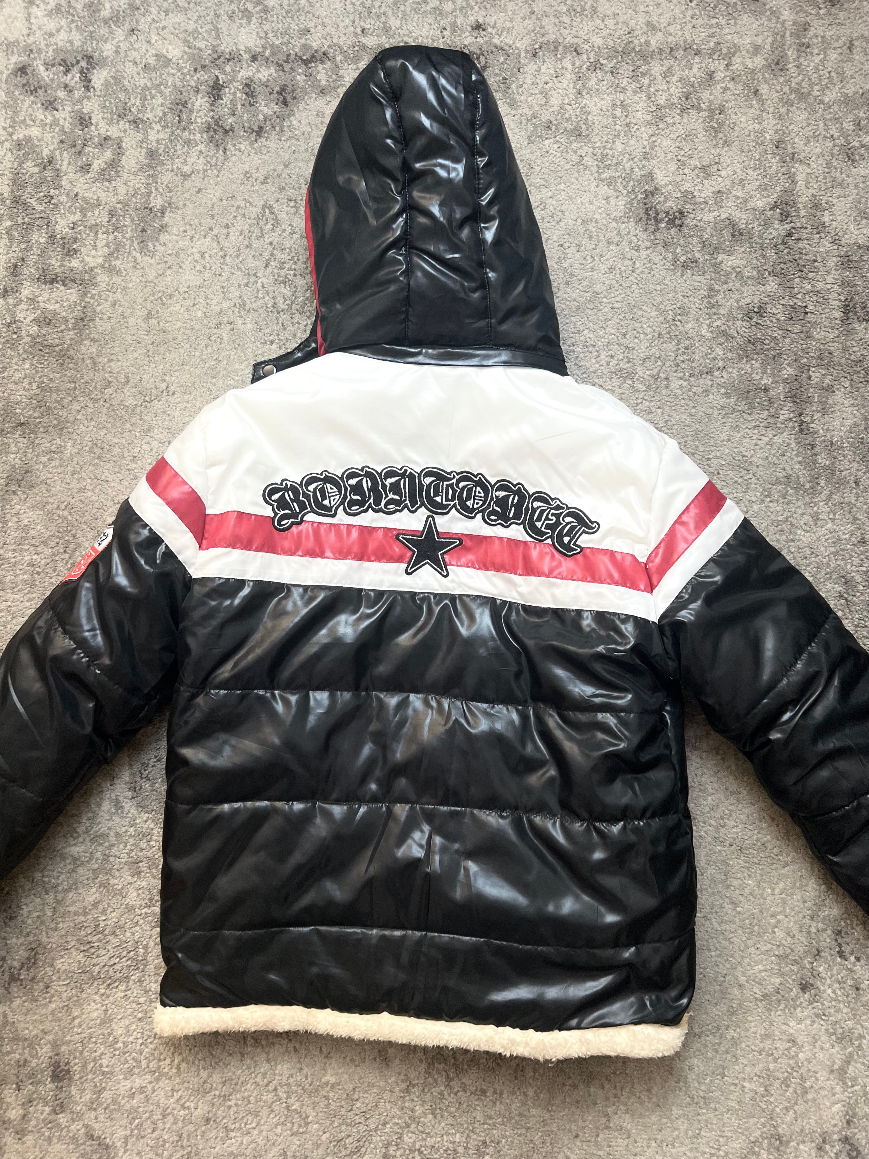 Lined with soft faux shearling for warmth and comfort, it’s finished with branded front patches, a detachable hood, and signature “ROAD COMET” embroidery across the back. Built from high-shine nylon with a structured fit that feels distinctly Japanese — playful yet precise.