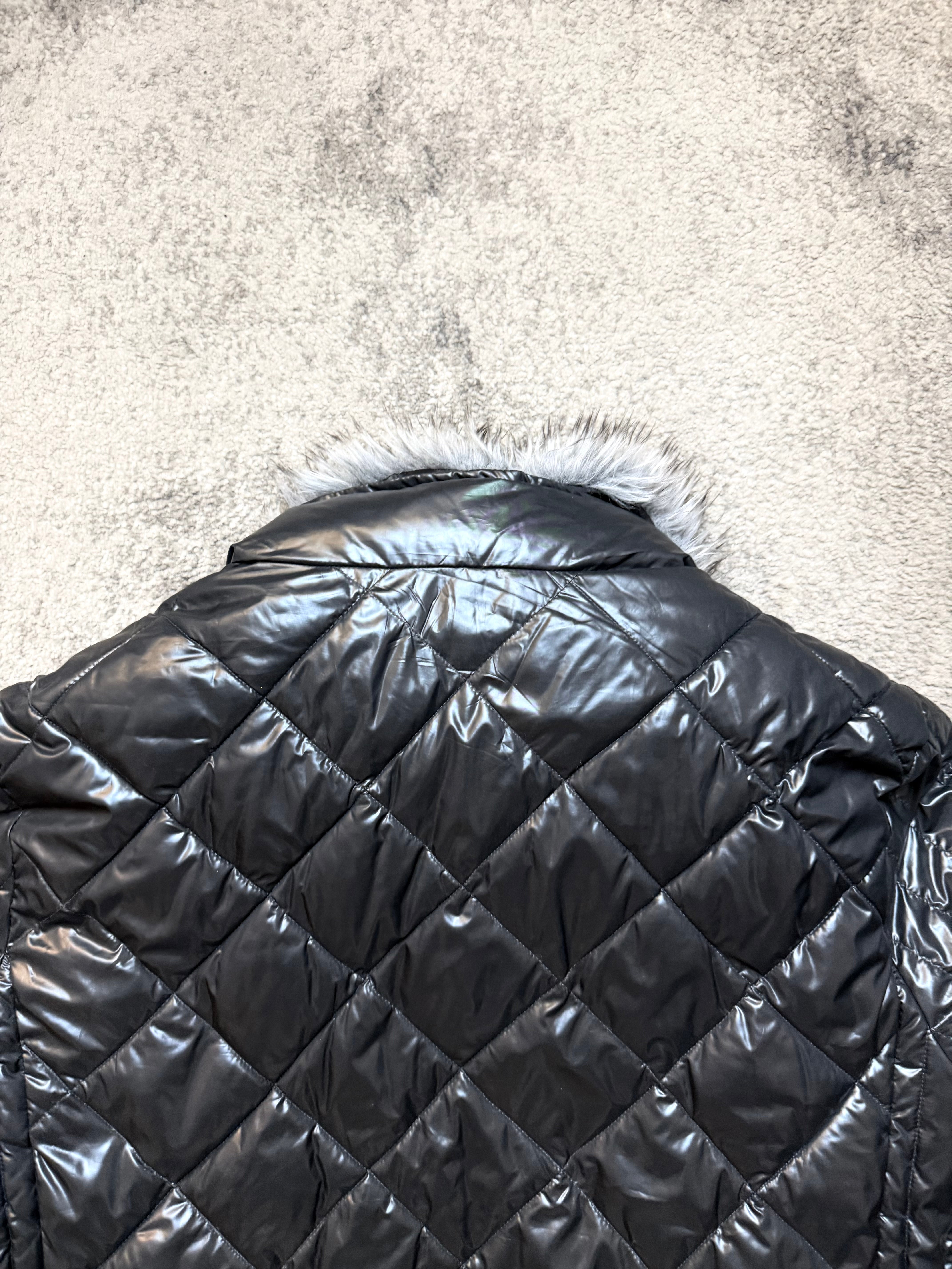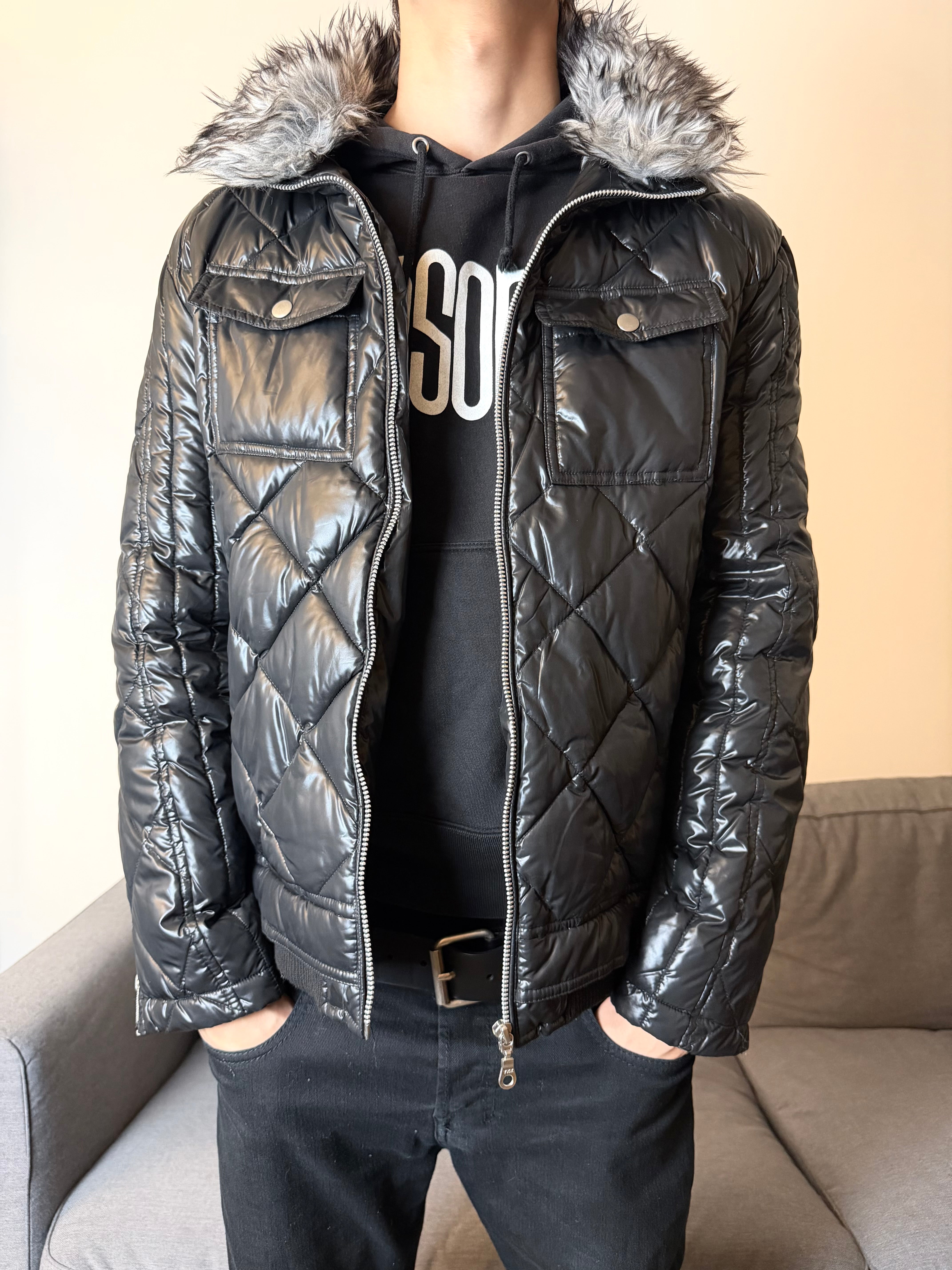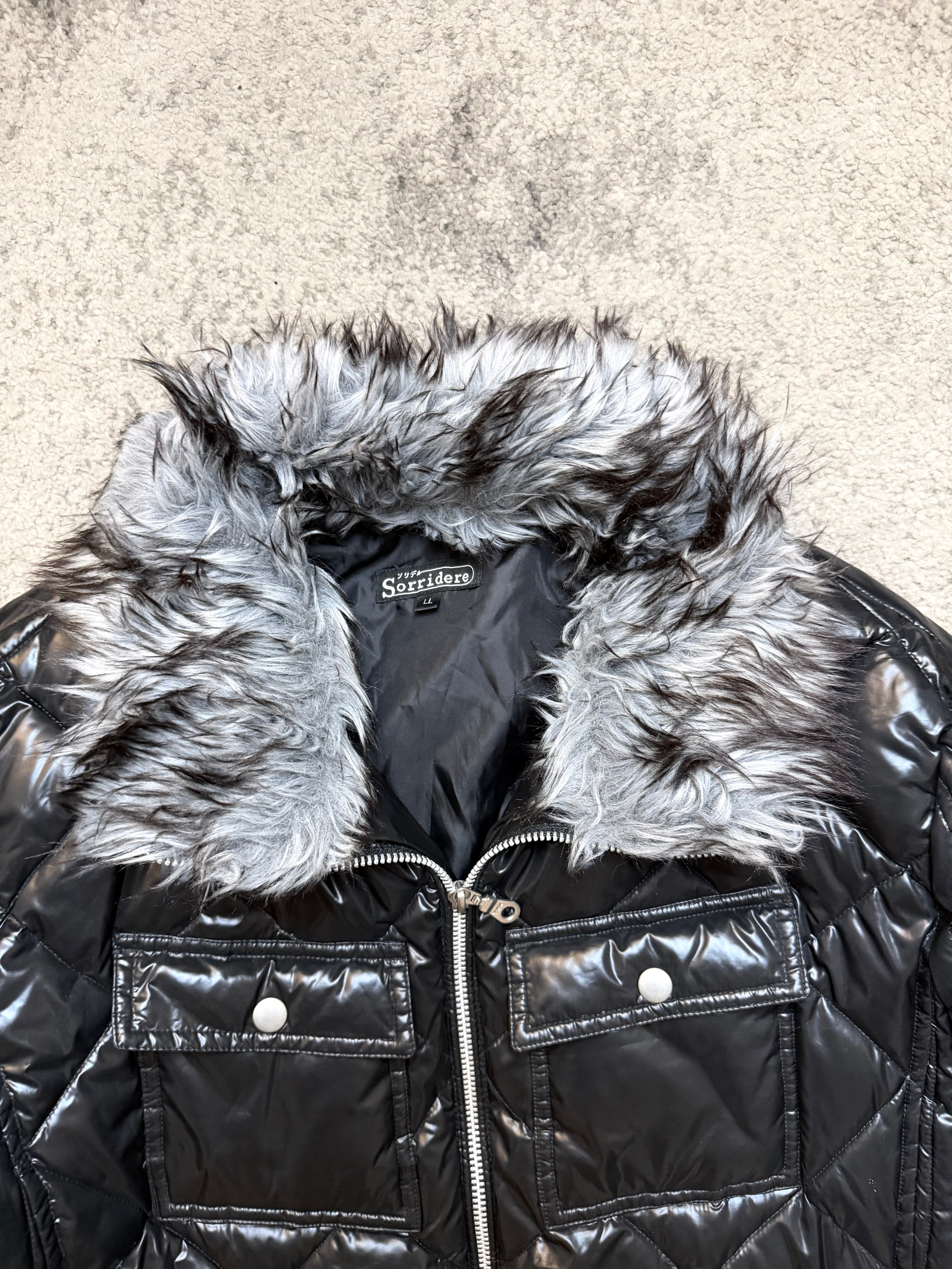 Material: Shiny quilted shell with thick padding — warm, structured, and slick like vinyl. Soft faux fur at the collar for that host-core drama.