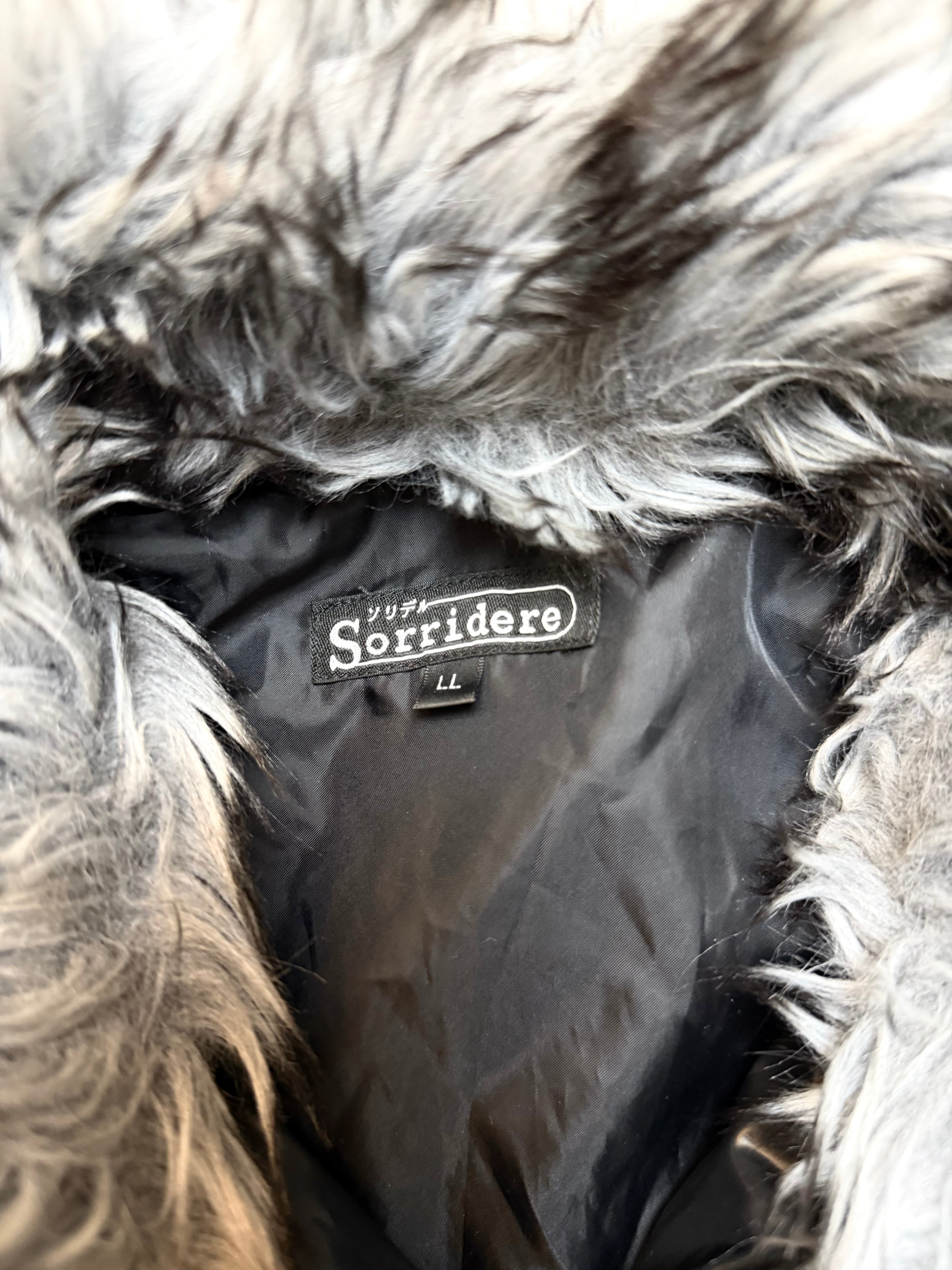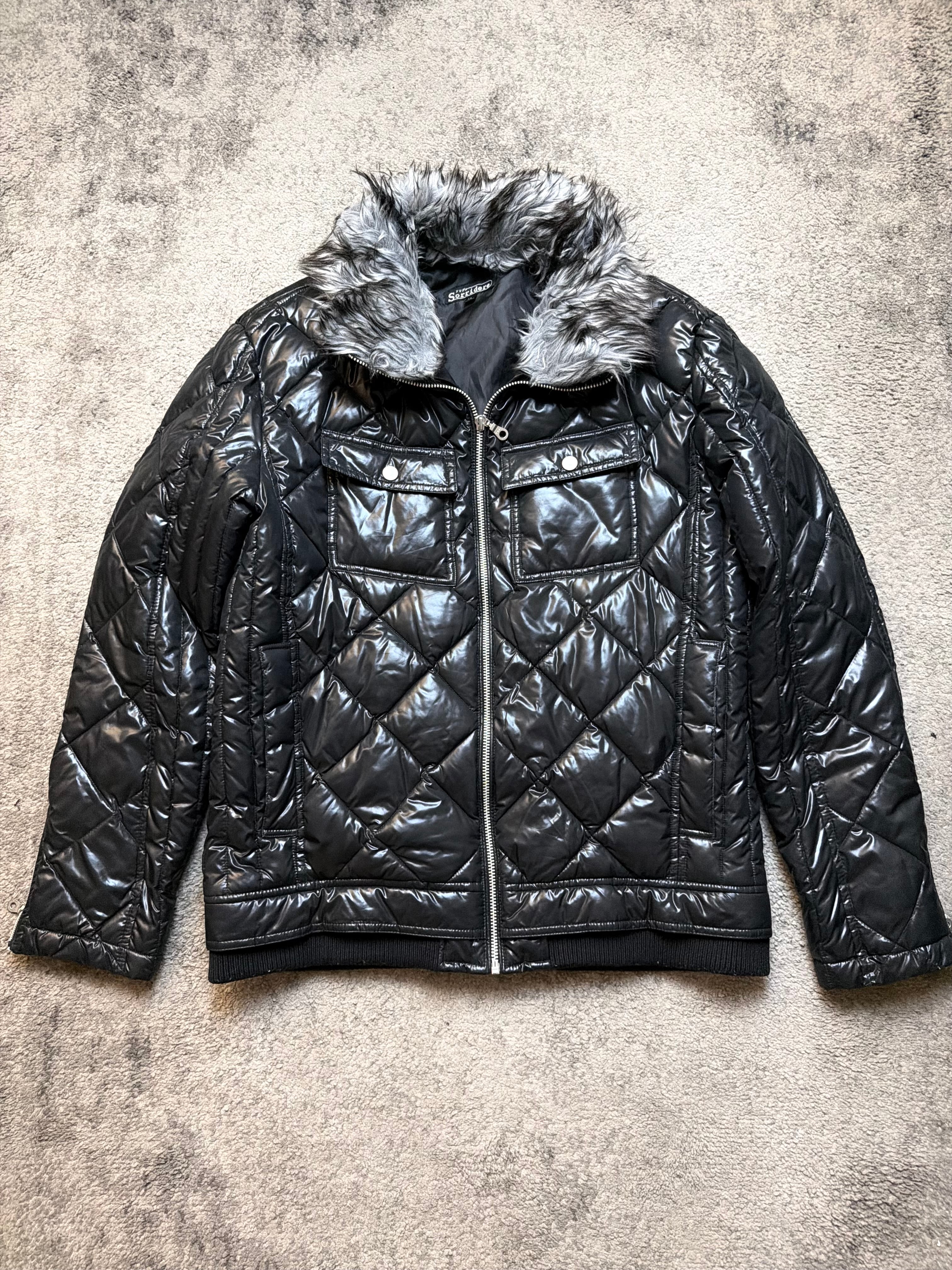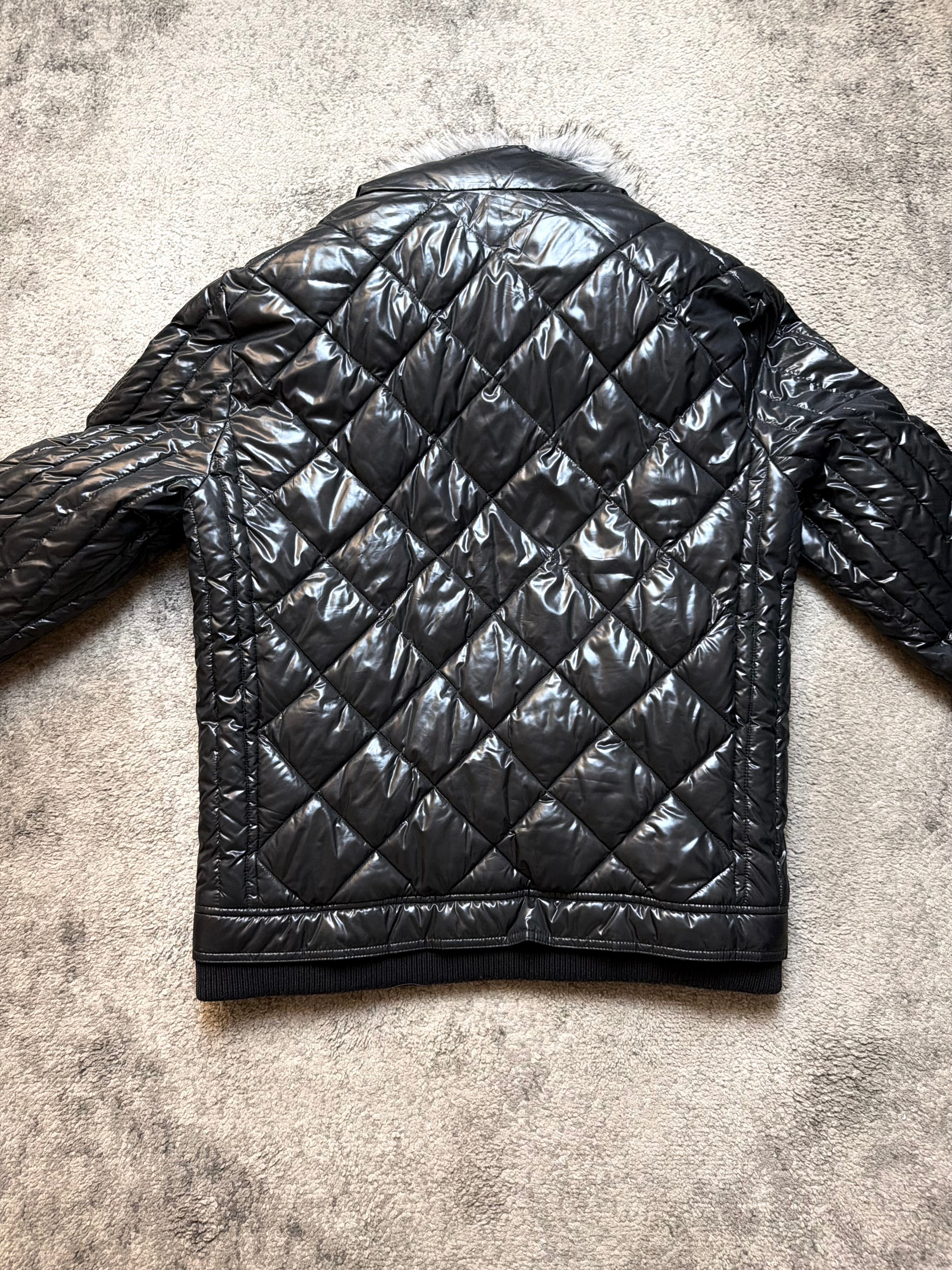 Material: Shiny quilted shell with thick padding — warm, structured, and slick like vinyl. Soft faux fur at the collar for that host-core drama.