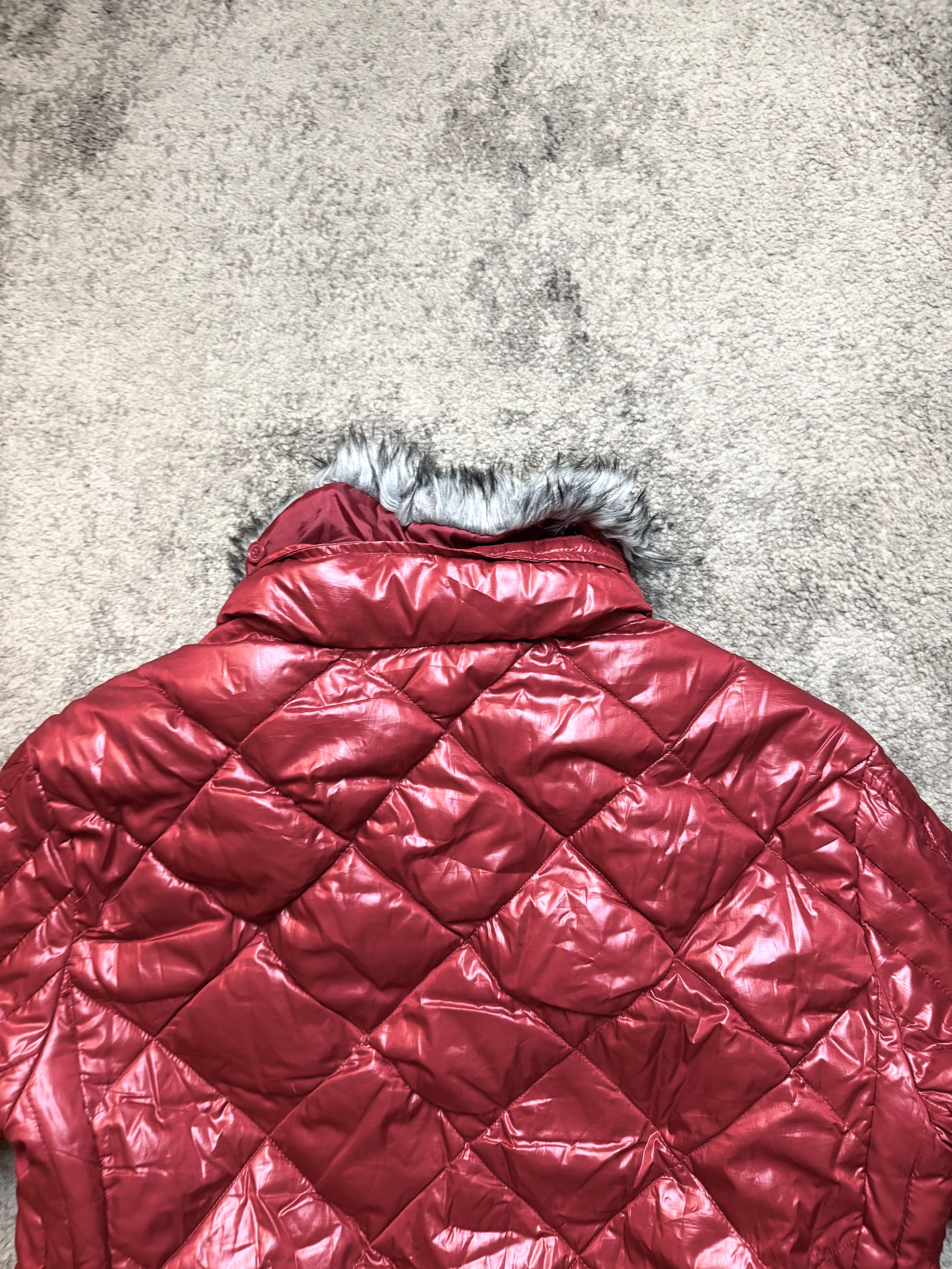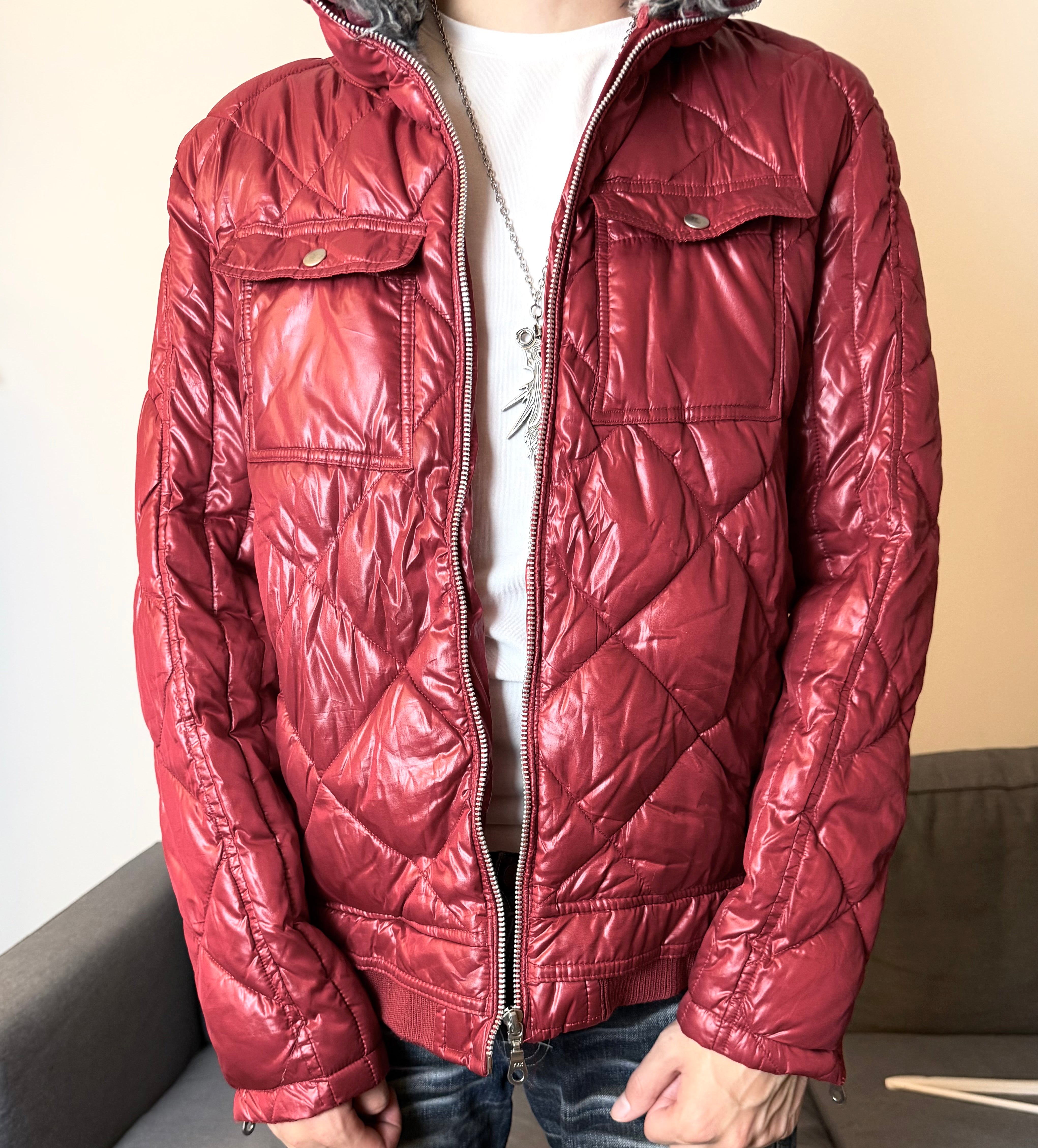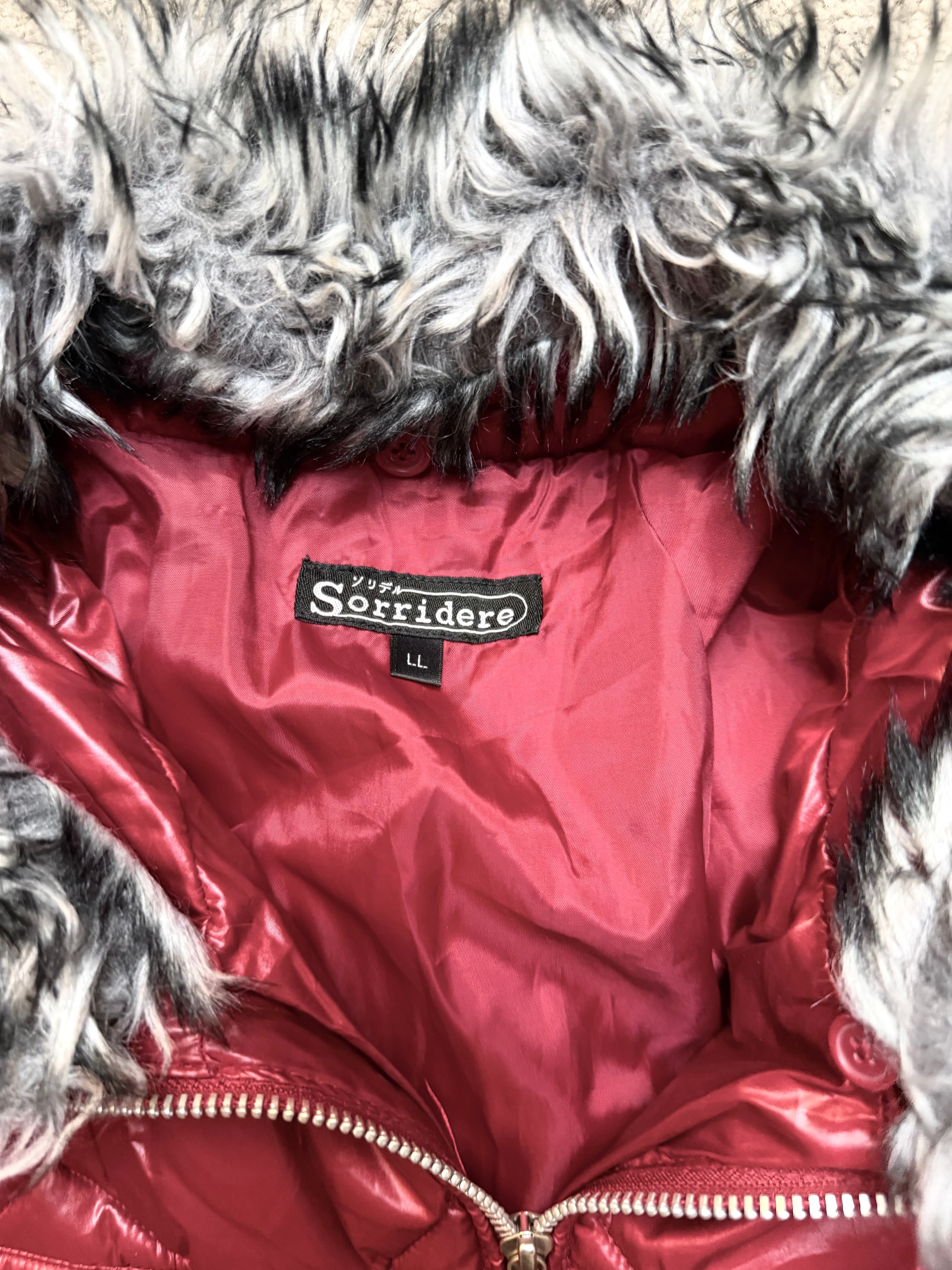 A bold, archive-coded winter piece—high-shine crimson shell, dramatic quilt lines, and a smoke-grey faux-fur collar that adds just the right touch of winter drama. Bright, confident, and undeniably Japanese Y2K in spirit.