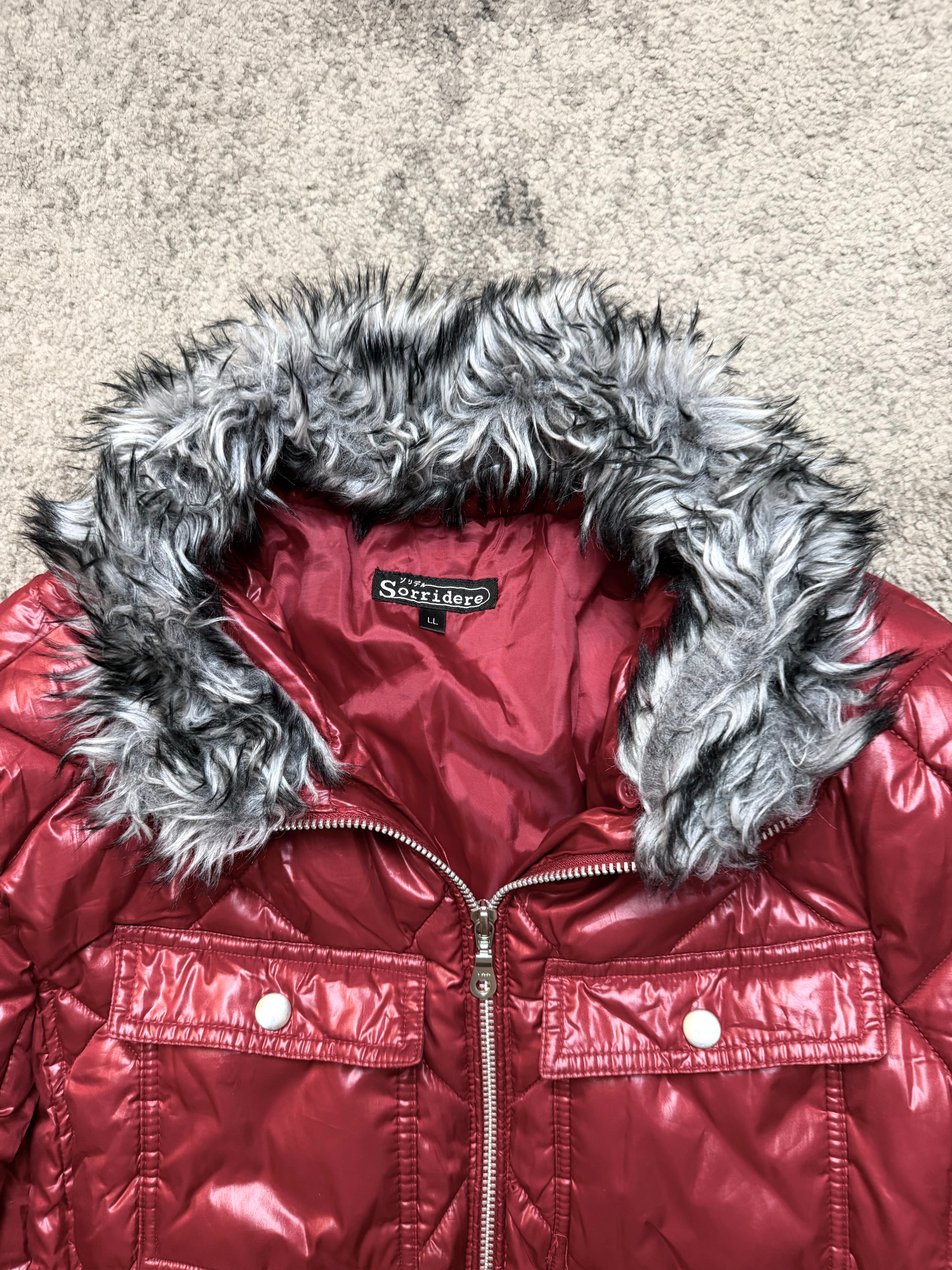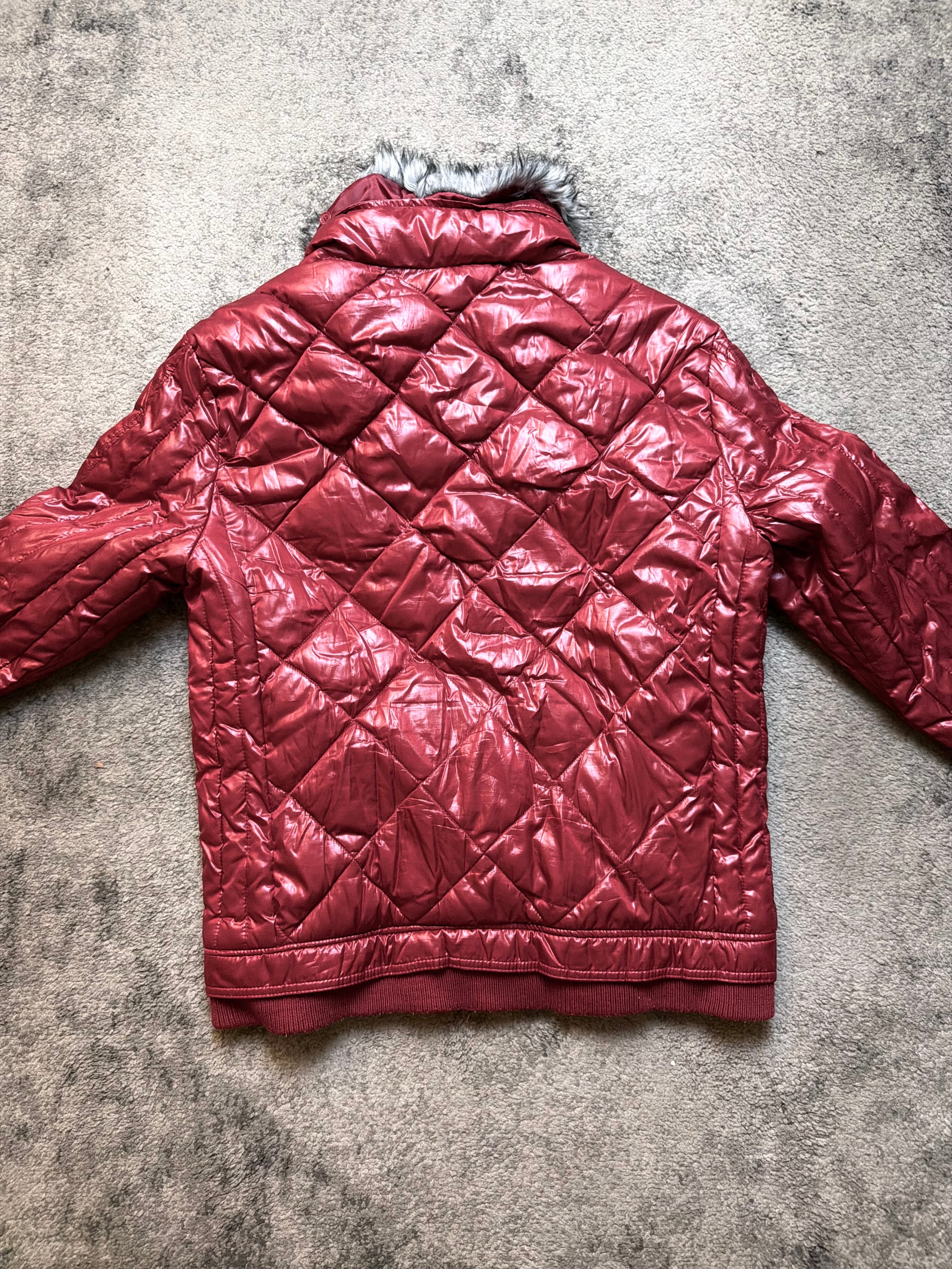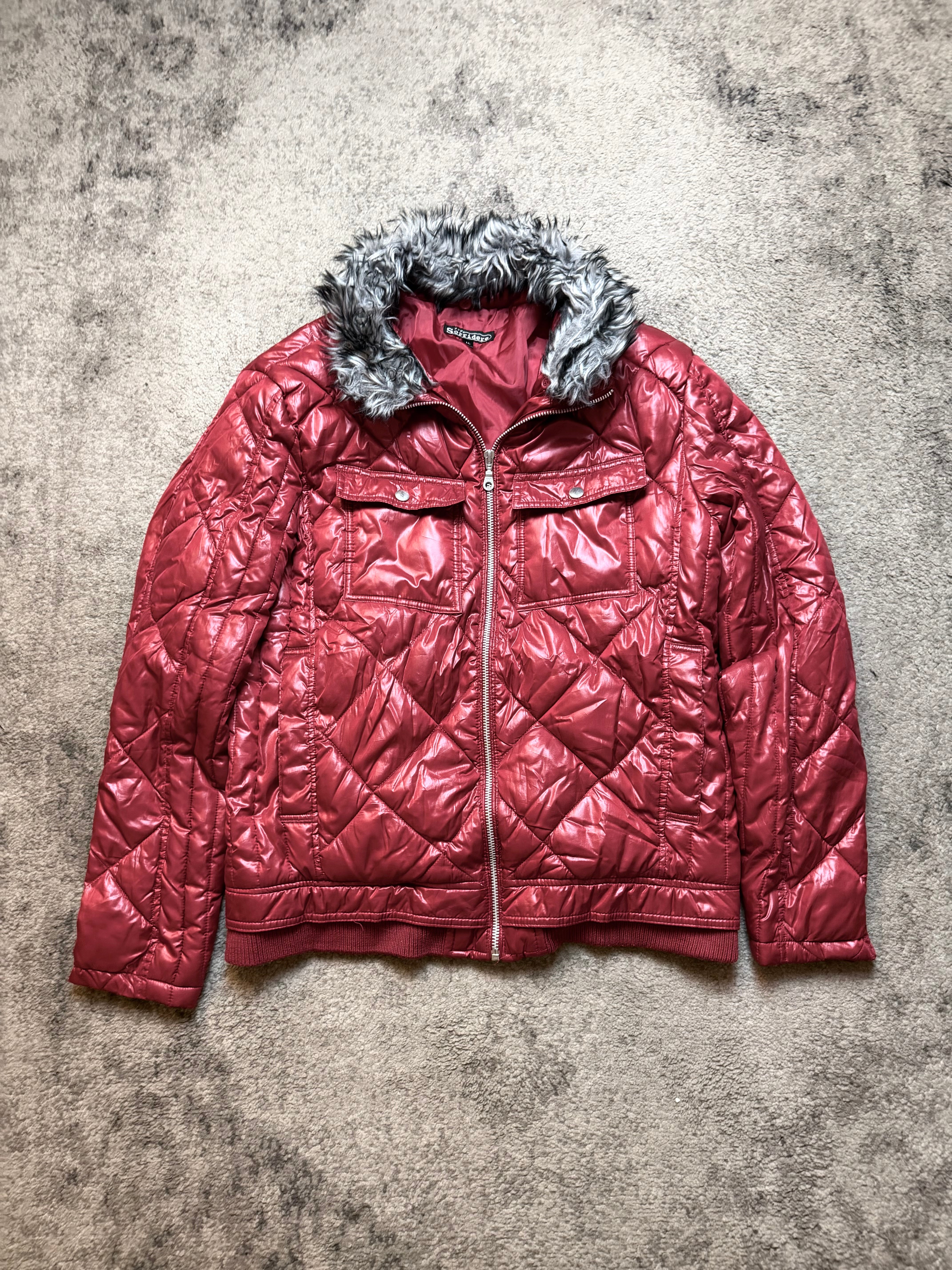 A bold, archive-coded winter piece—high-shine crimson shell, dramatic quilt lines, and a smoke-grey faux-fur collar that adds just the right touch of winter drama. Bright, confident, and undeniably Japanese Y2K in spirit.