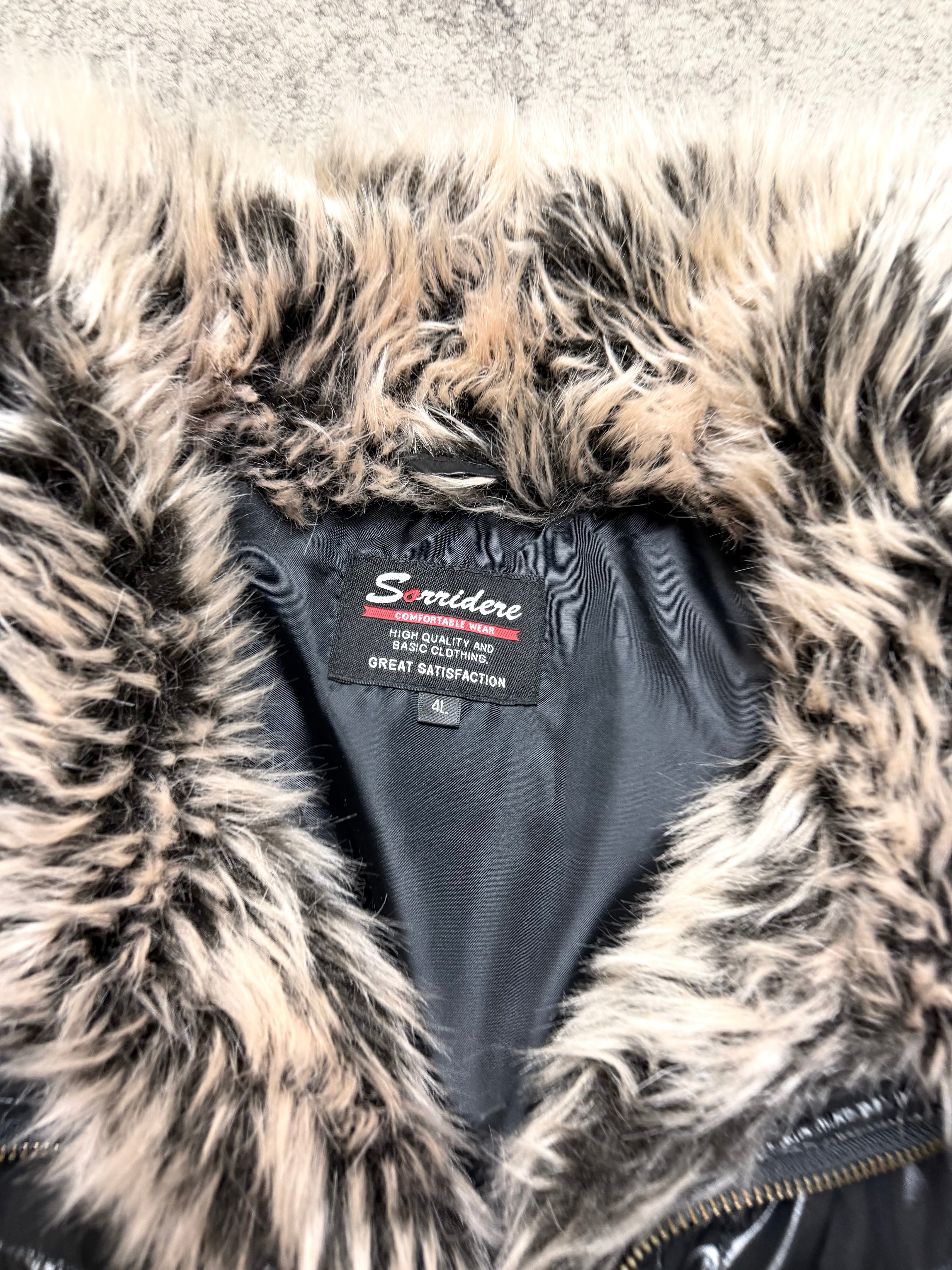 Material: Glossy synthetic outer with warm padded insulation; soft faux-fur details for comfort and visual depth.