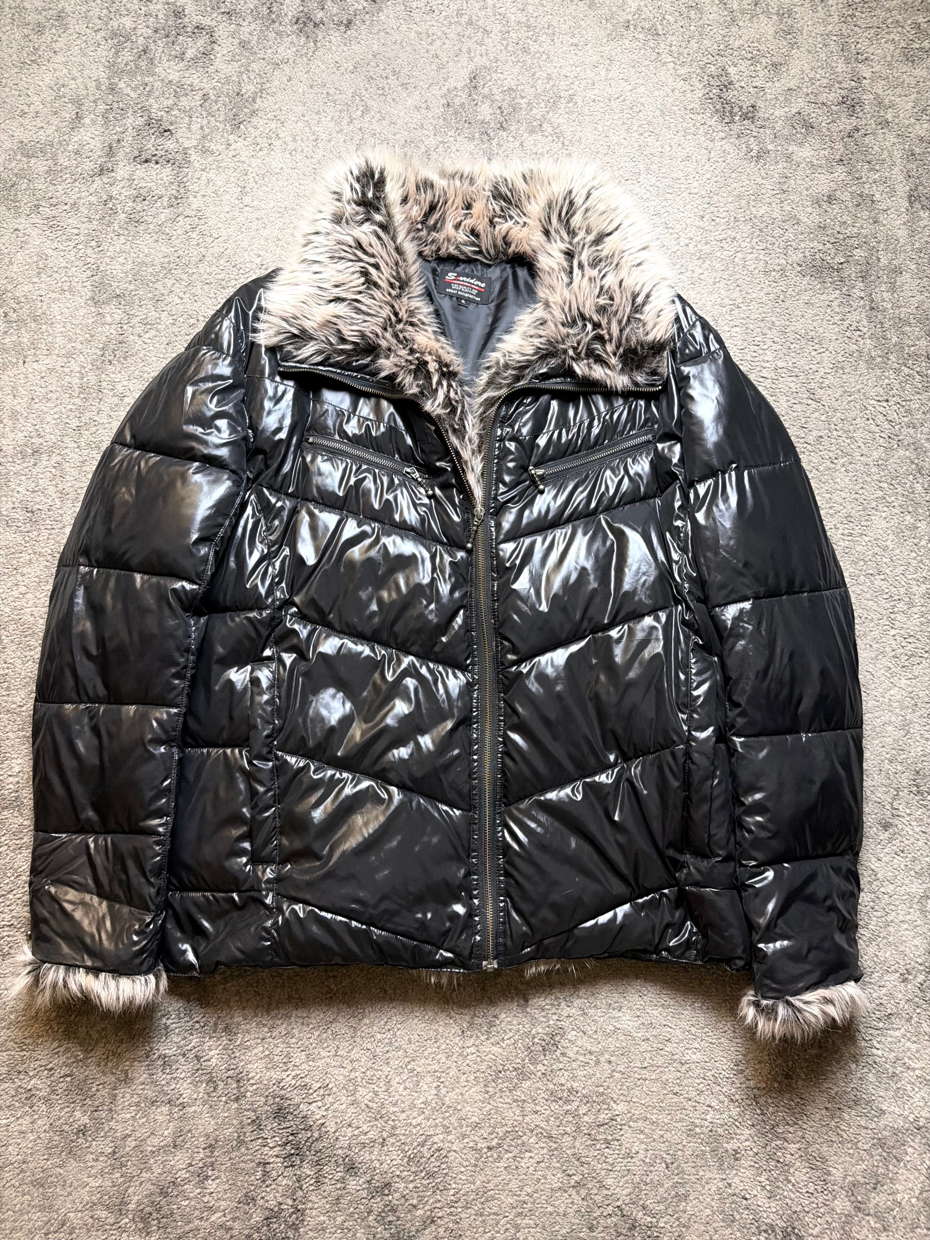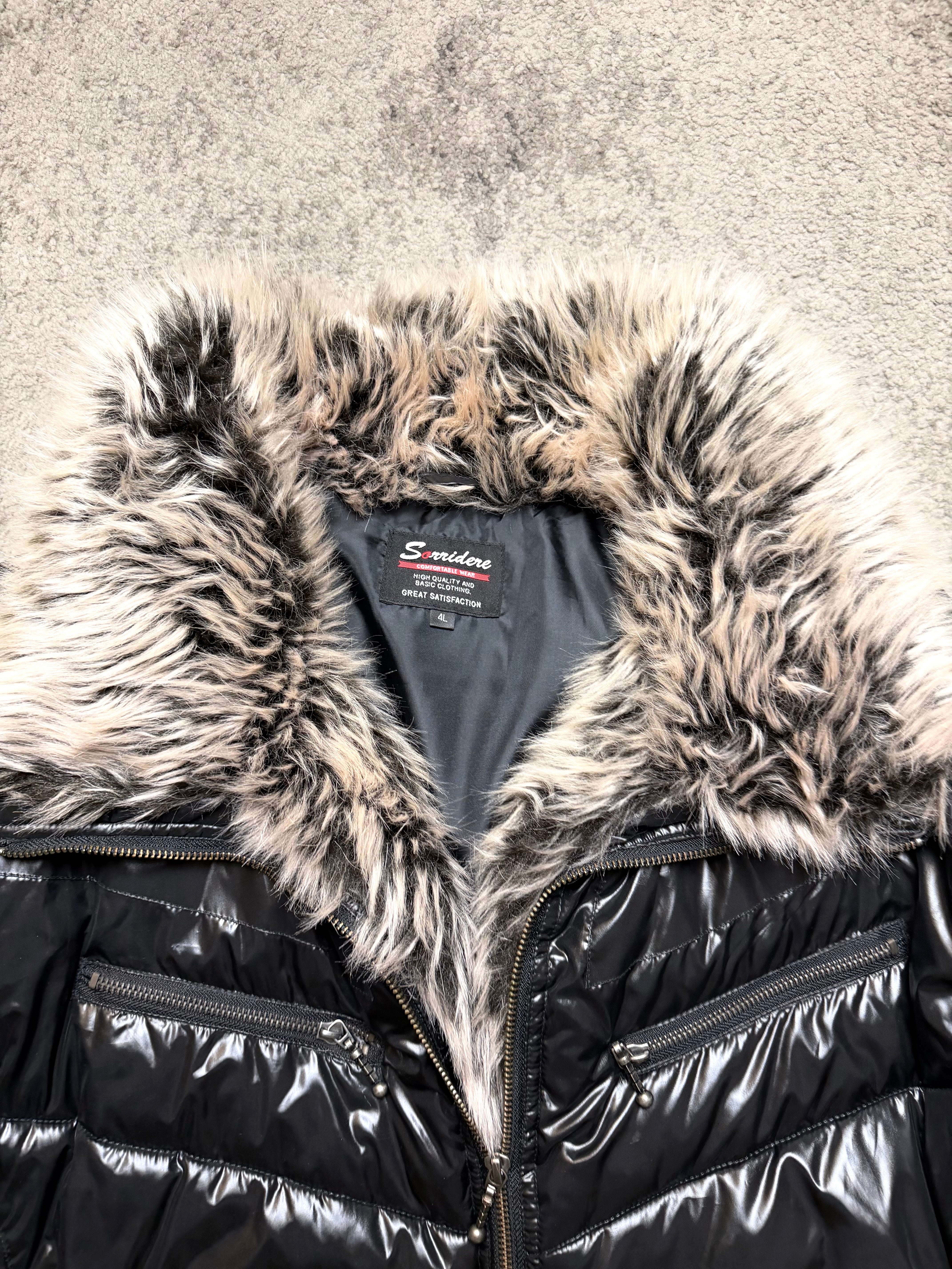 A striking SORRIDERE archive puffer that perfectly captures the dark, emotional side of Japanese street fashion. The high-gloss black shell contrasts beautifully with the plush faux-fur collar and cuffs, giving this piece a cold-city, late-night Tokyo energy.