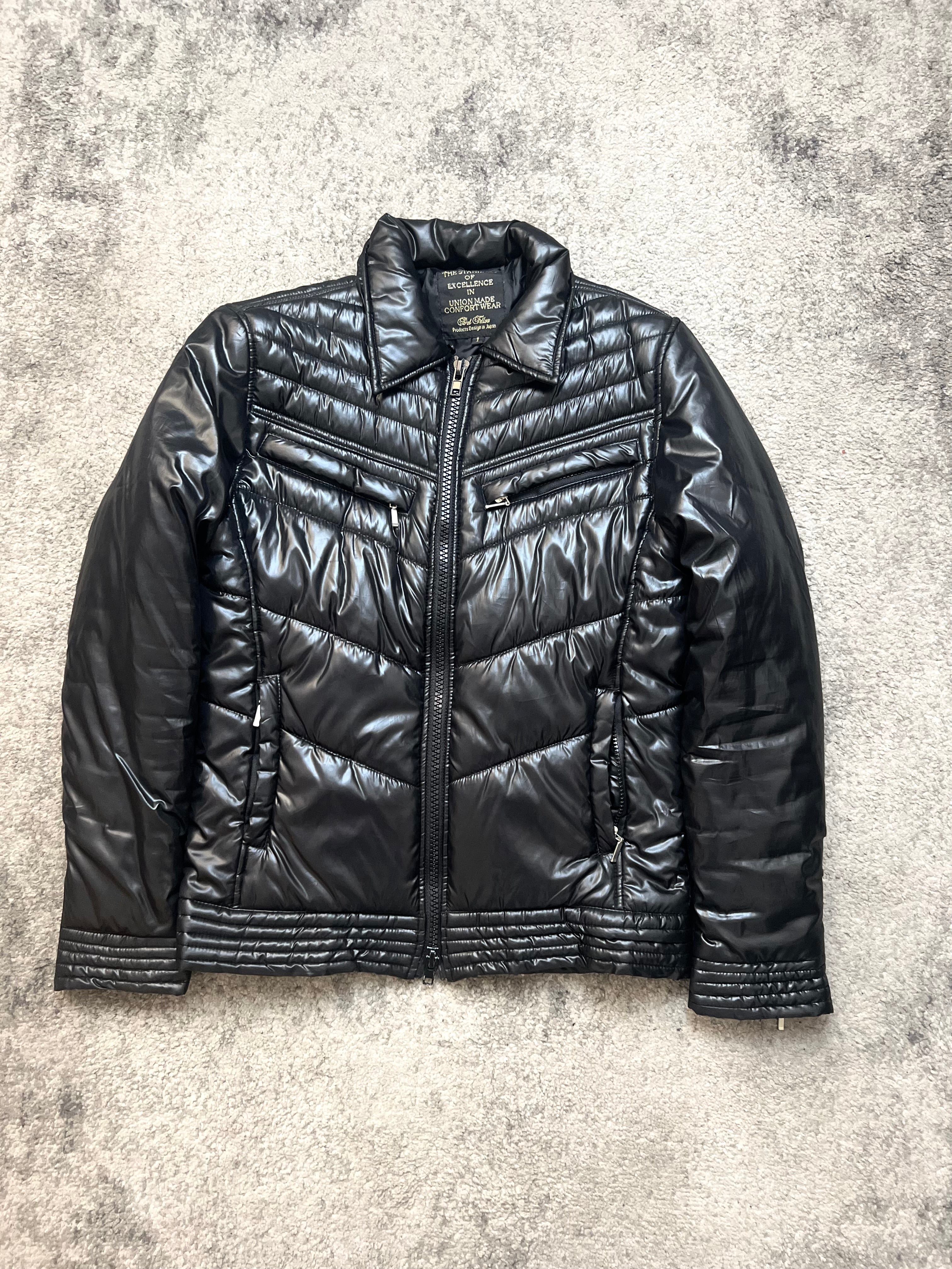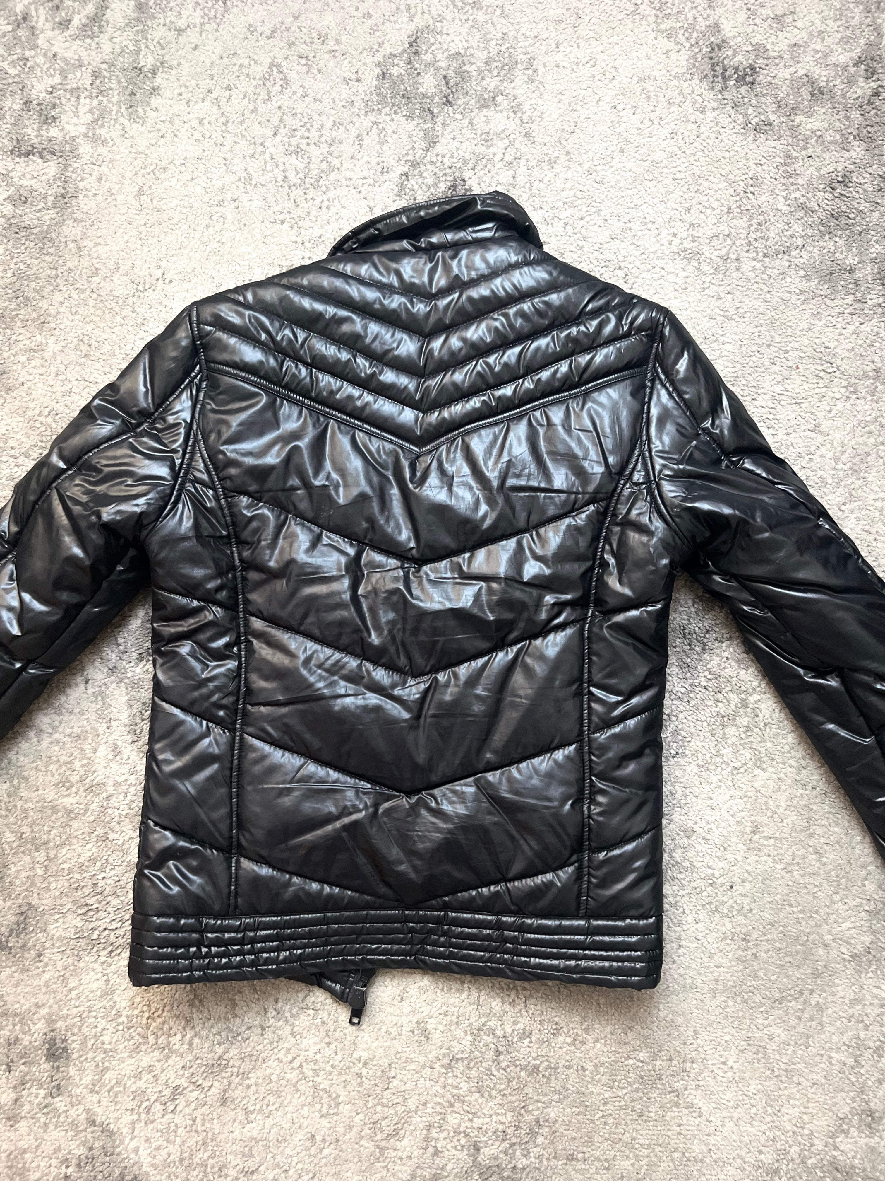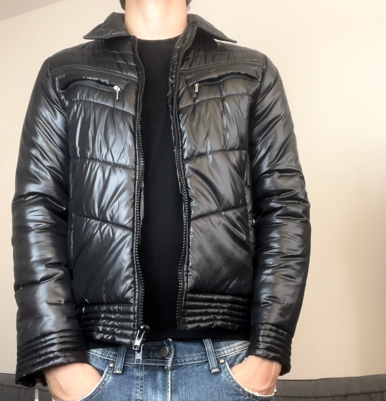 Crafted from glossy nylon with soft padding for lightweight warmth and comfort. Features include dual chest zip pockets, polished hardware, and a sharp collar design that adds edge to the silhouette. The overall look feels effortlessly cool — part utility, part underground style statement.