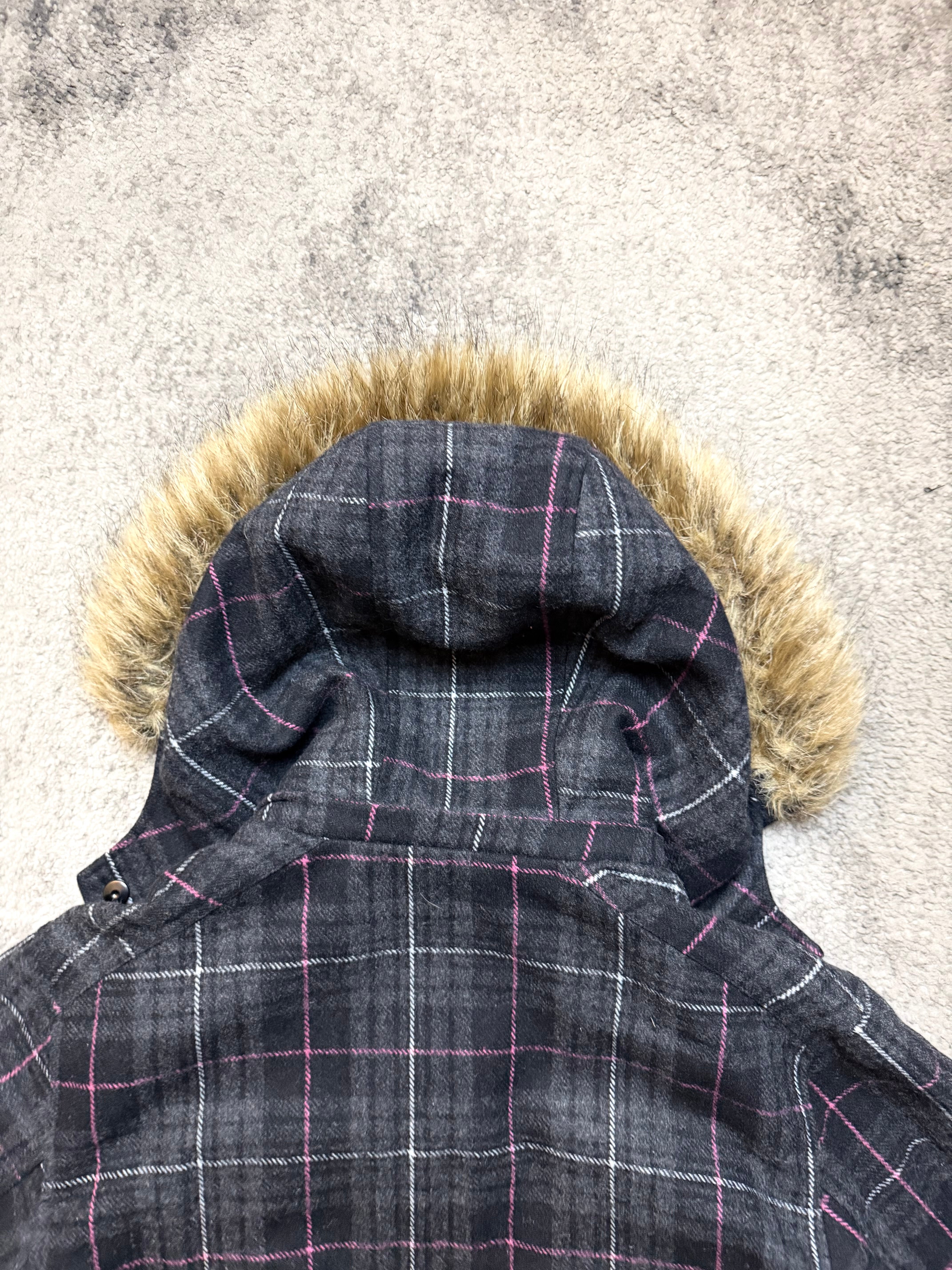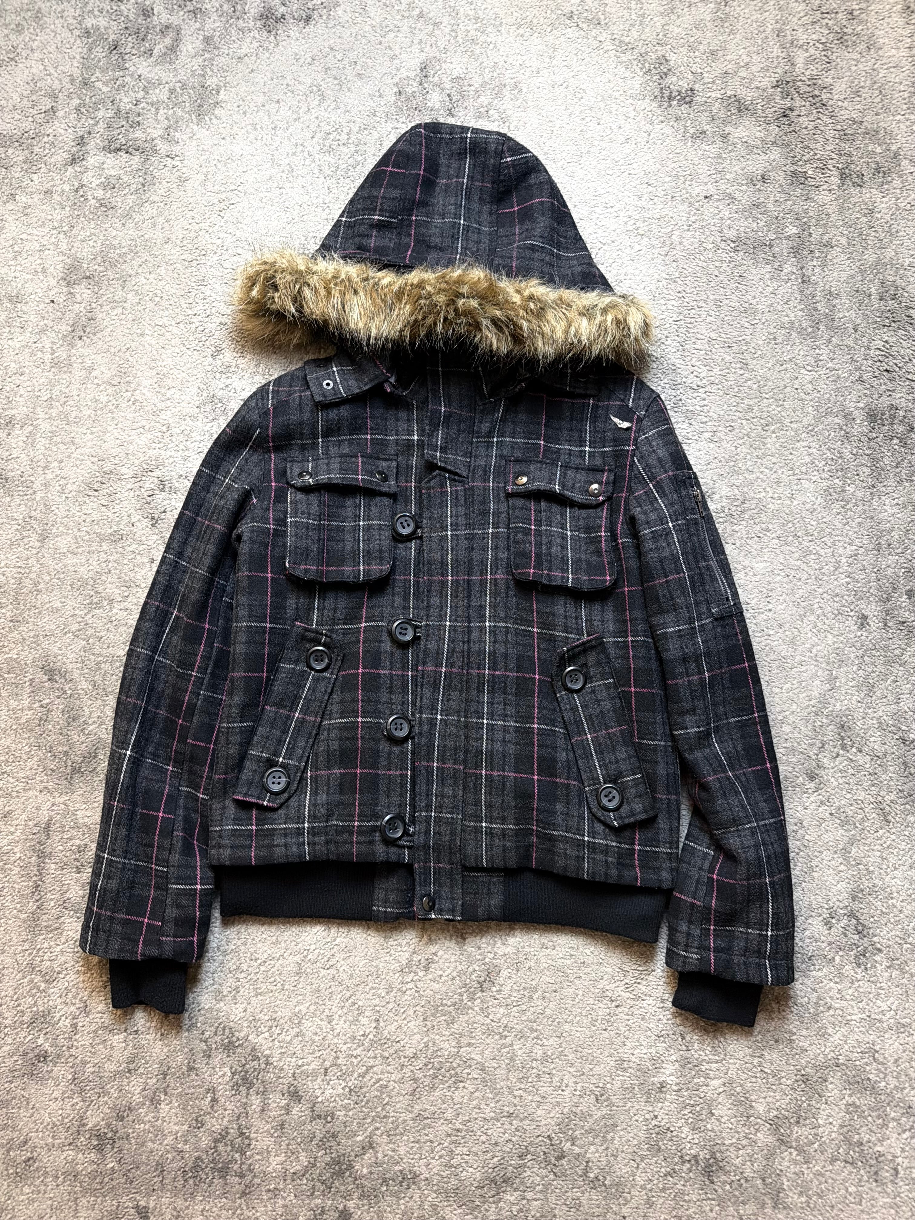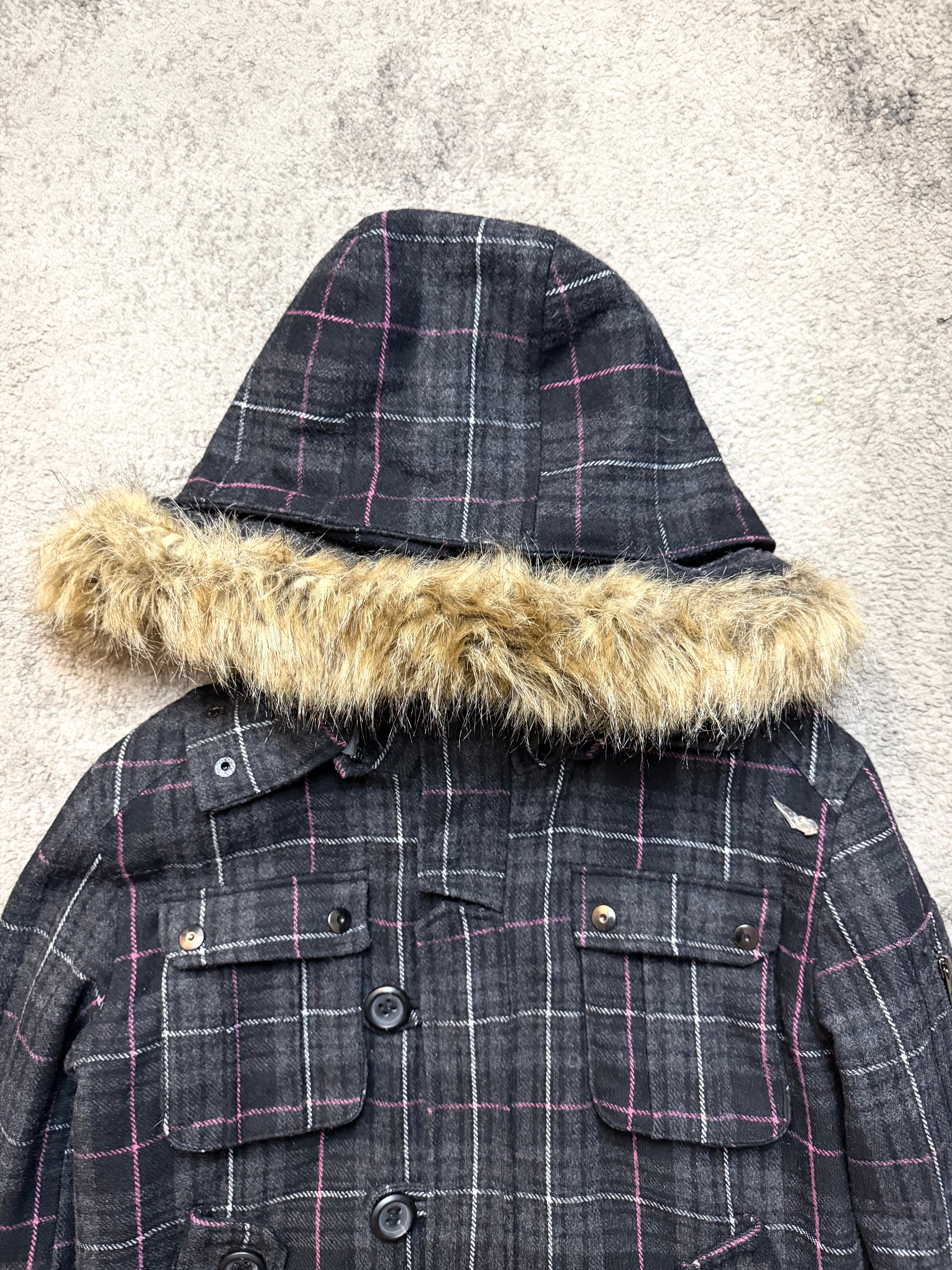 A moody outerwear piece that leans fully into Japanese archive sensibility. Dark plaid, fur-trimmed hood, and military-inspired structure give this jacket that late Number (N)ine atmosphere with a restrained ifsixwasnine edge — introspective, functional, and quietly strong.
