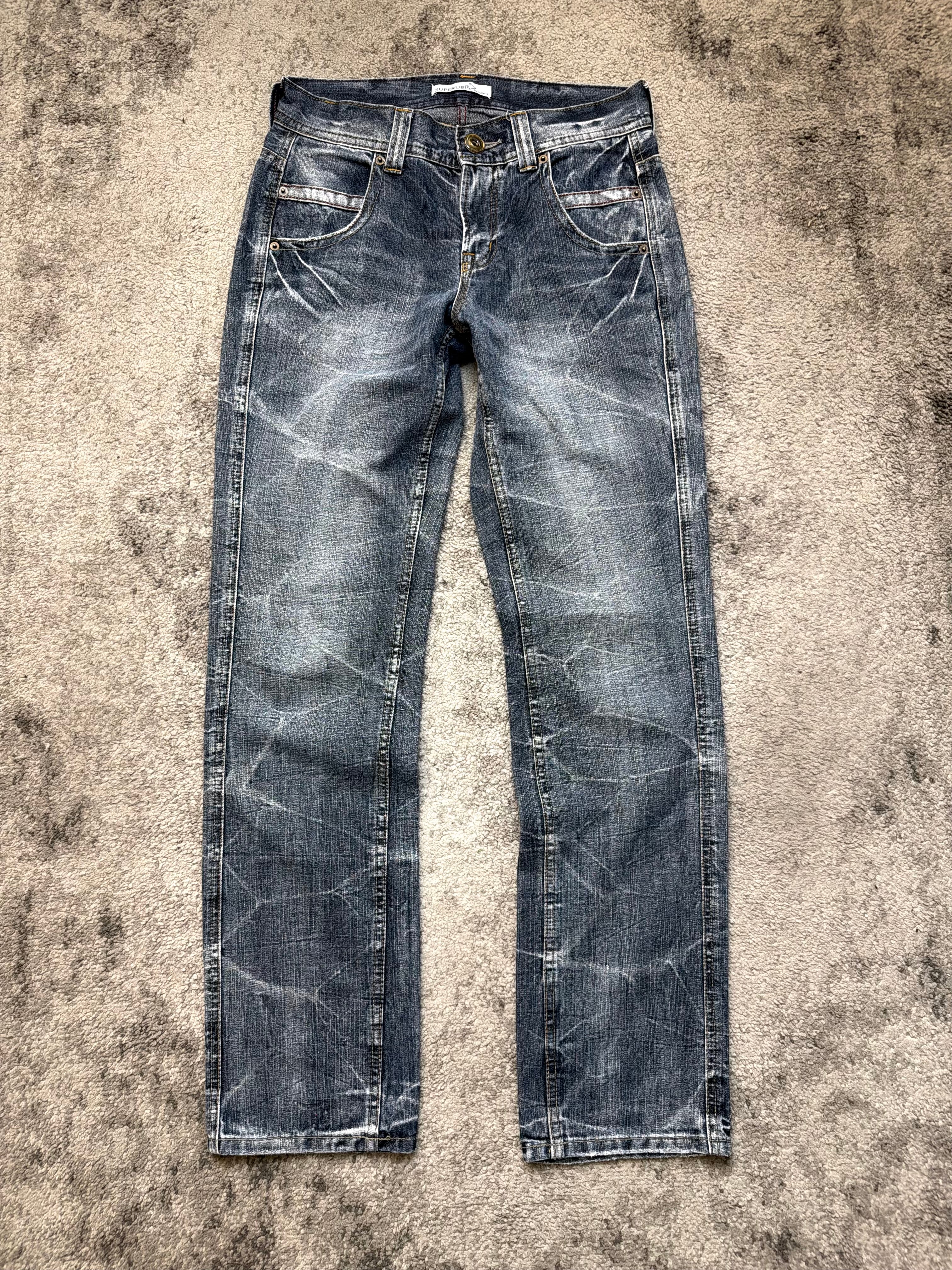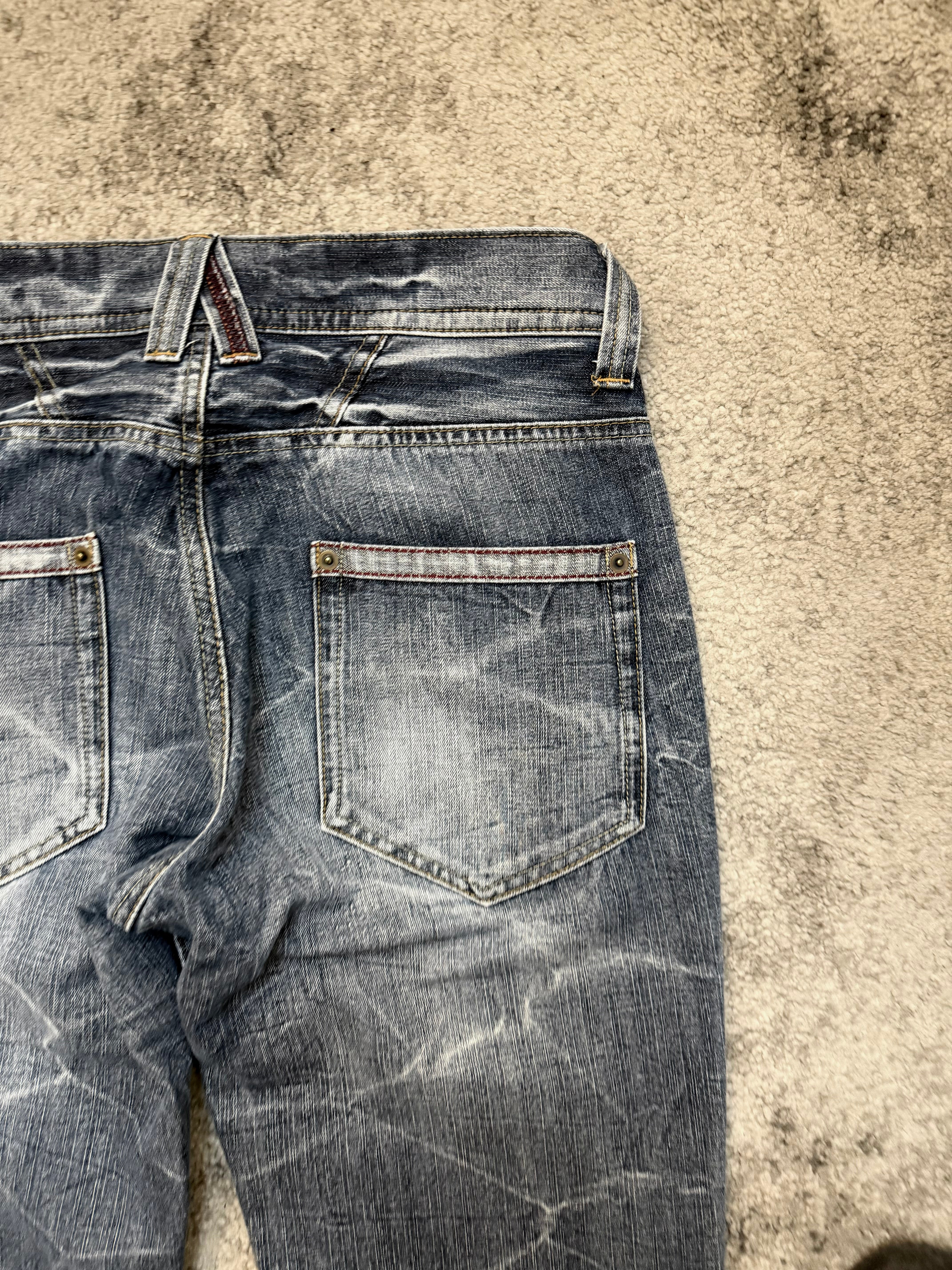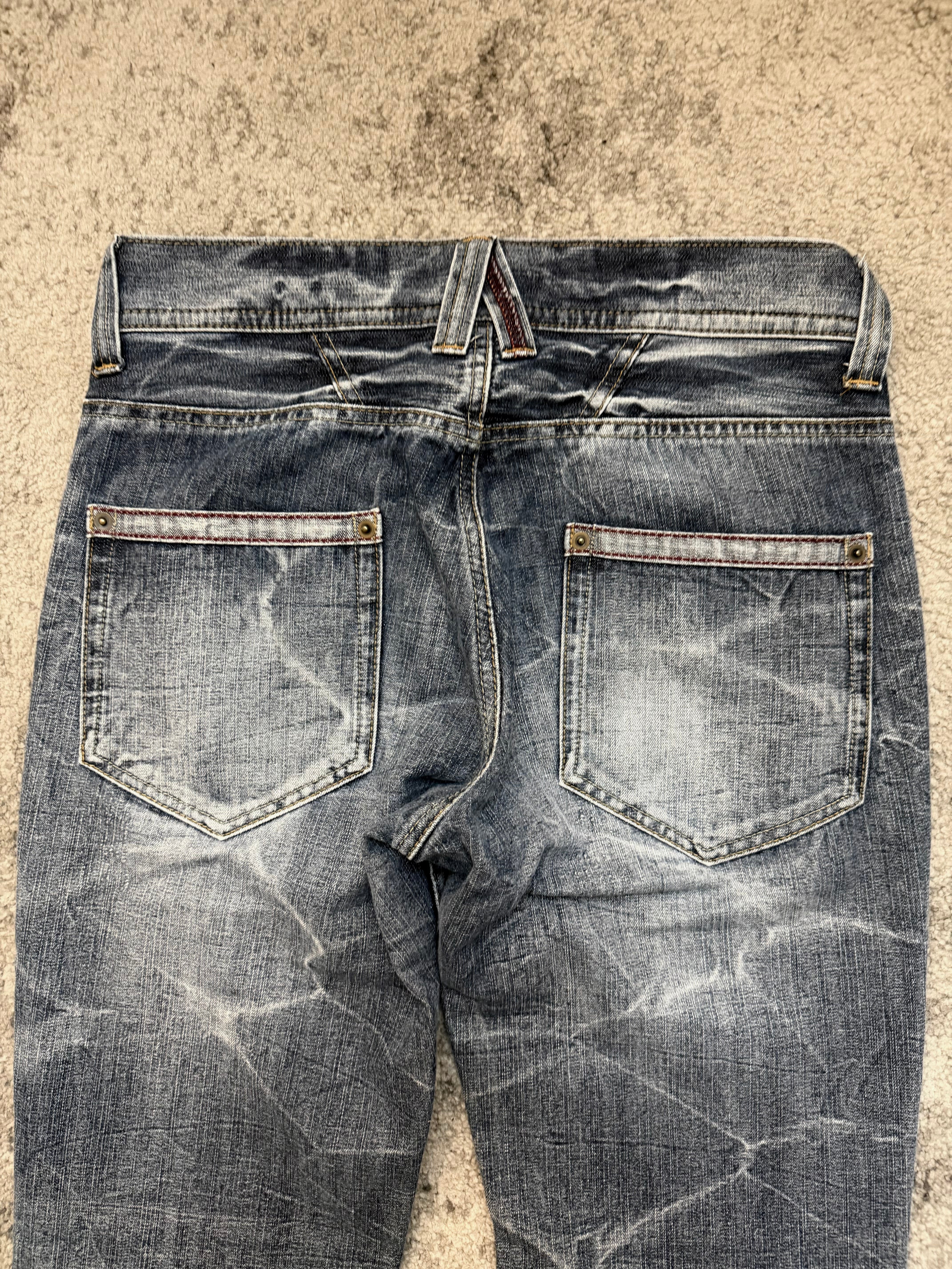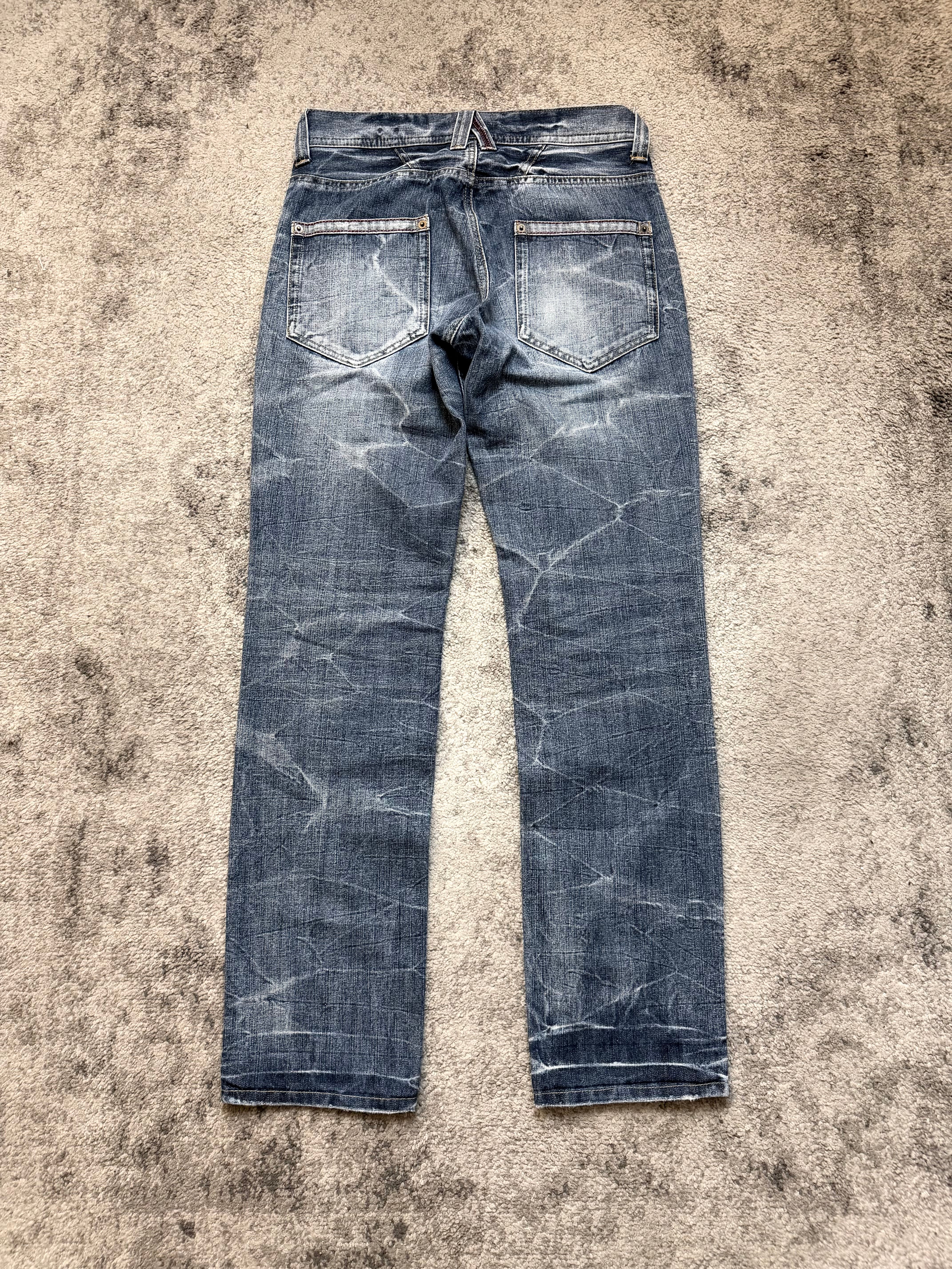 This rare piece from SUPERUBIS embodies the avant-garde side of Japanese denim design — experimental, structured, and beautifully imperfect. The unique cracked fade pattern across the fabric gives it a distinct visual rhythm, resembling shattered glass frozen in motion. It’s a bold statement, but one that stays grounded in quiet craftsmanship.