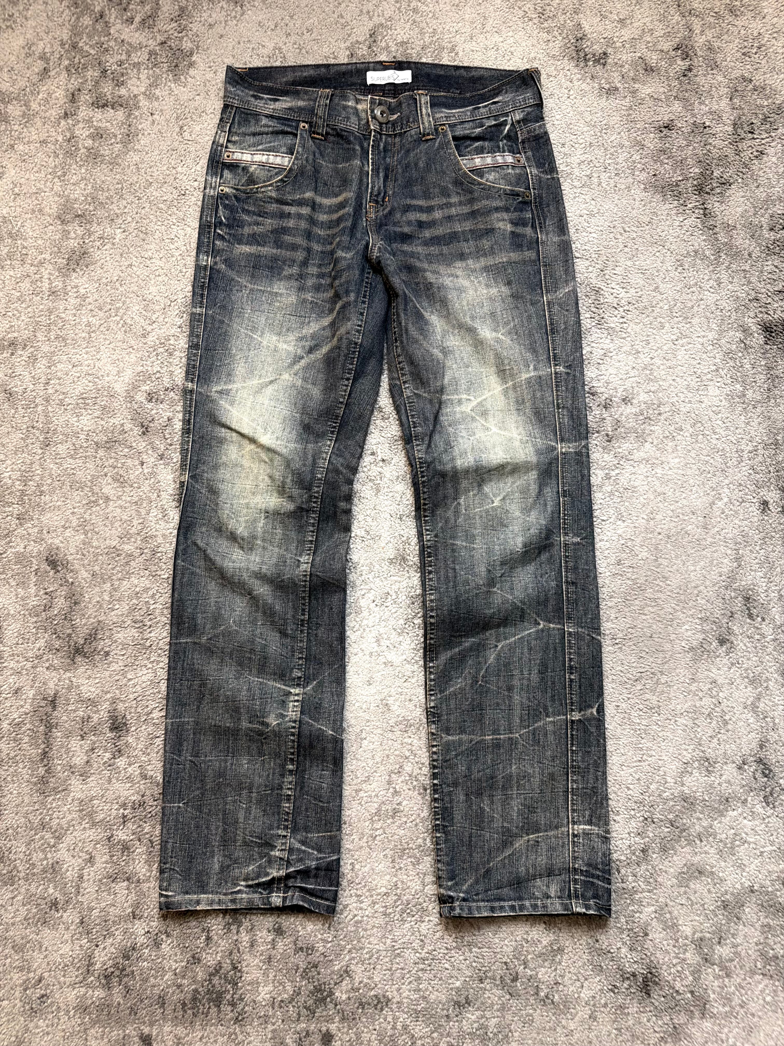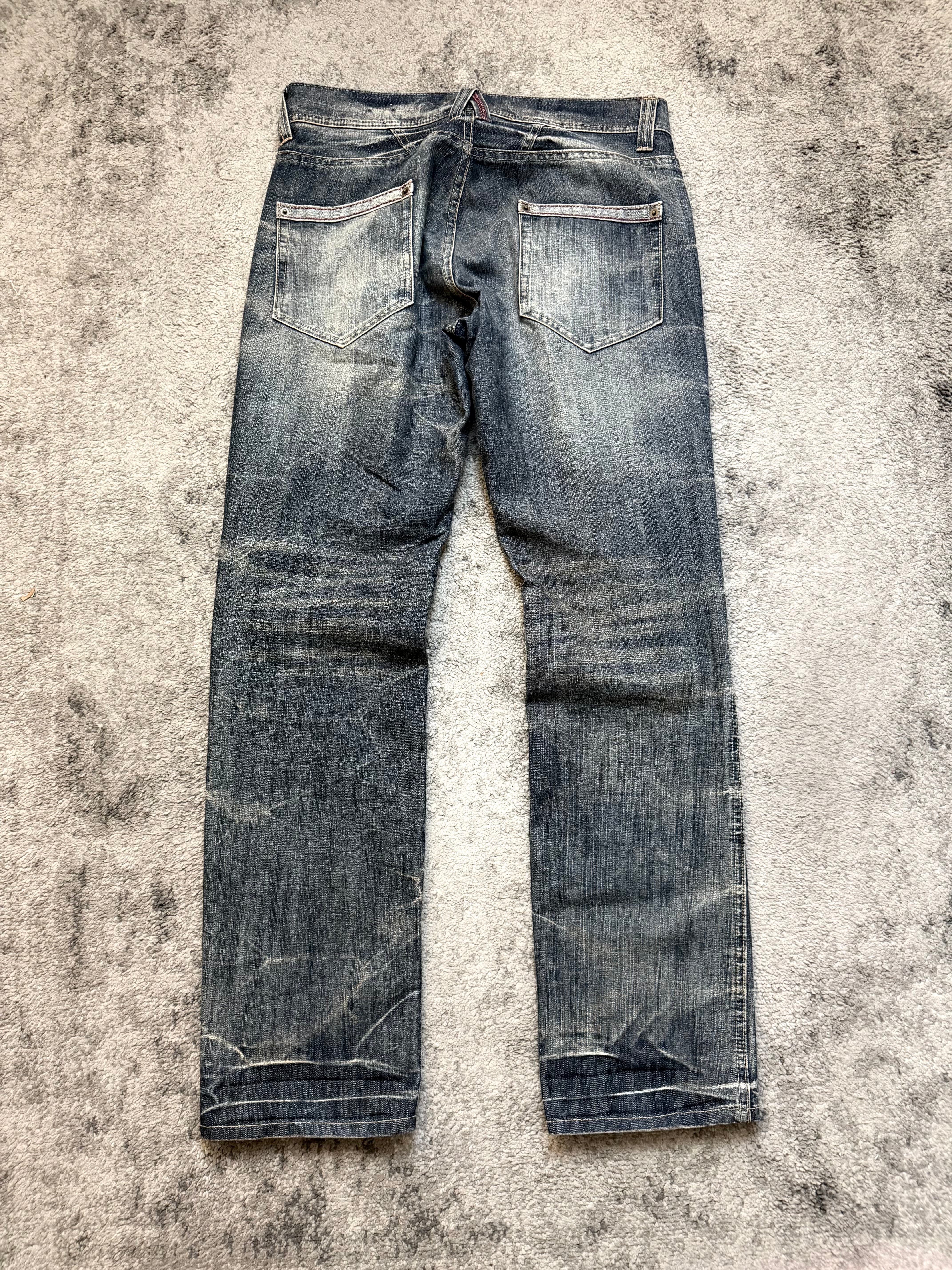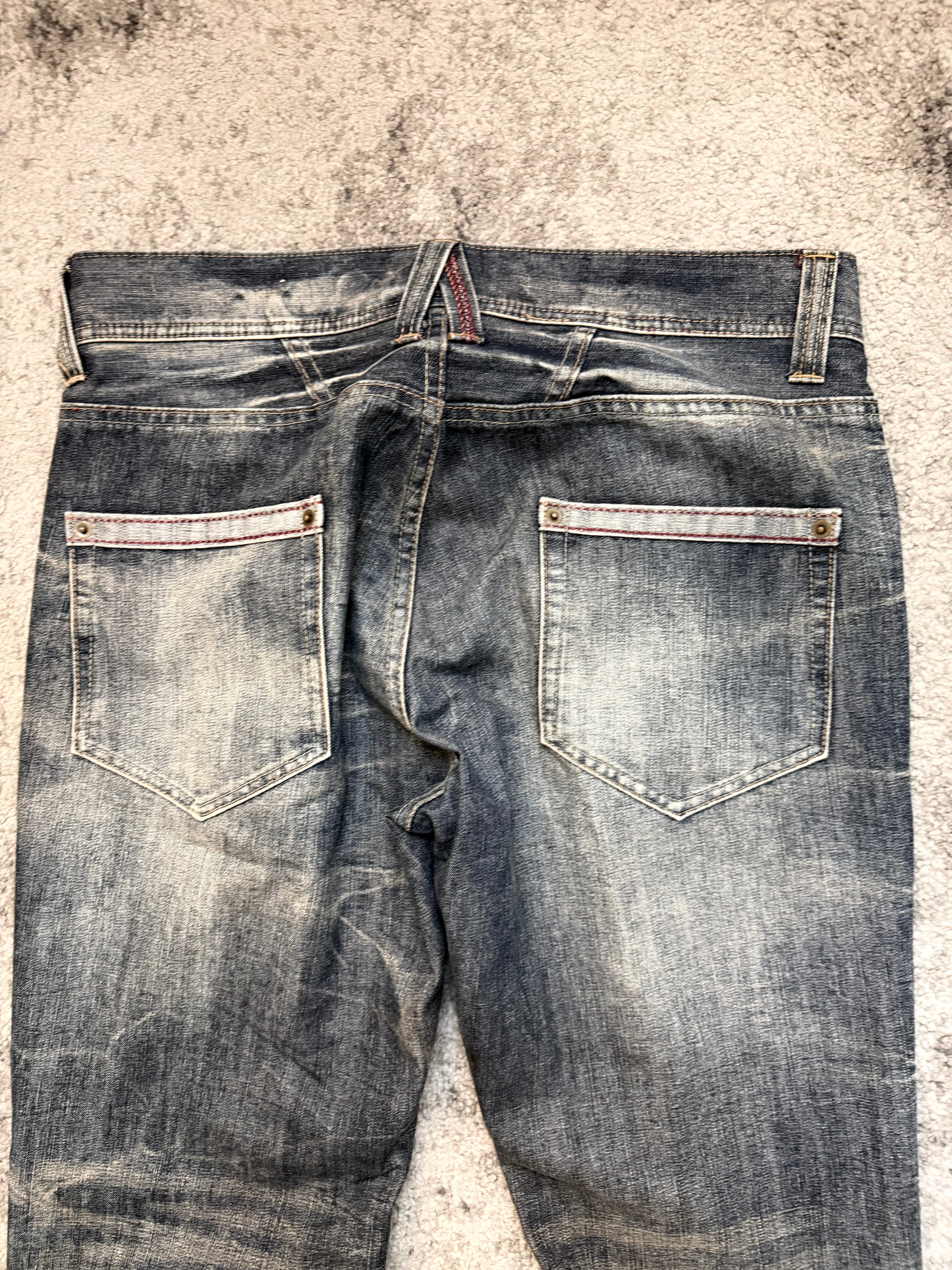 A standout from SUPERUBIS’ golden era, this denim embodies that distinct Japanese archive energy — experimental yet quietly intentional. The cracked marble fading, uneven whiskering, and textured wash create a hypnotic visual flow, as if the fabric itself carries motion.