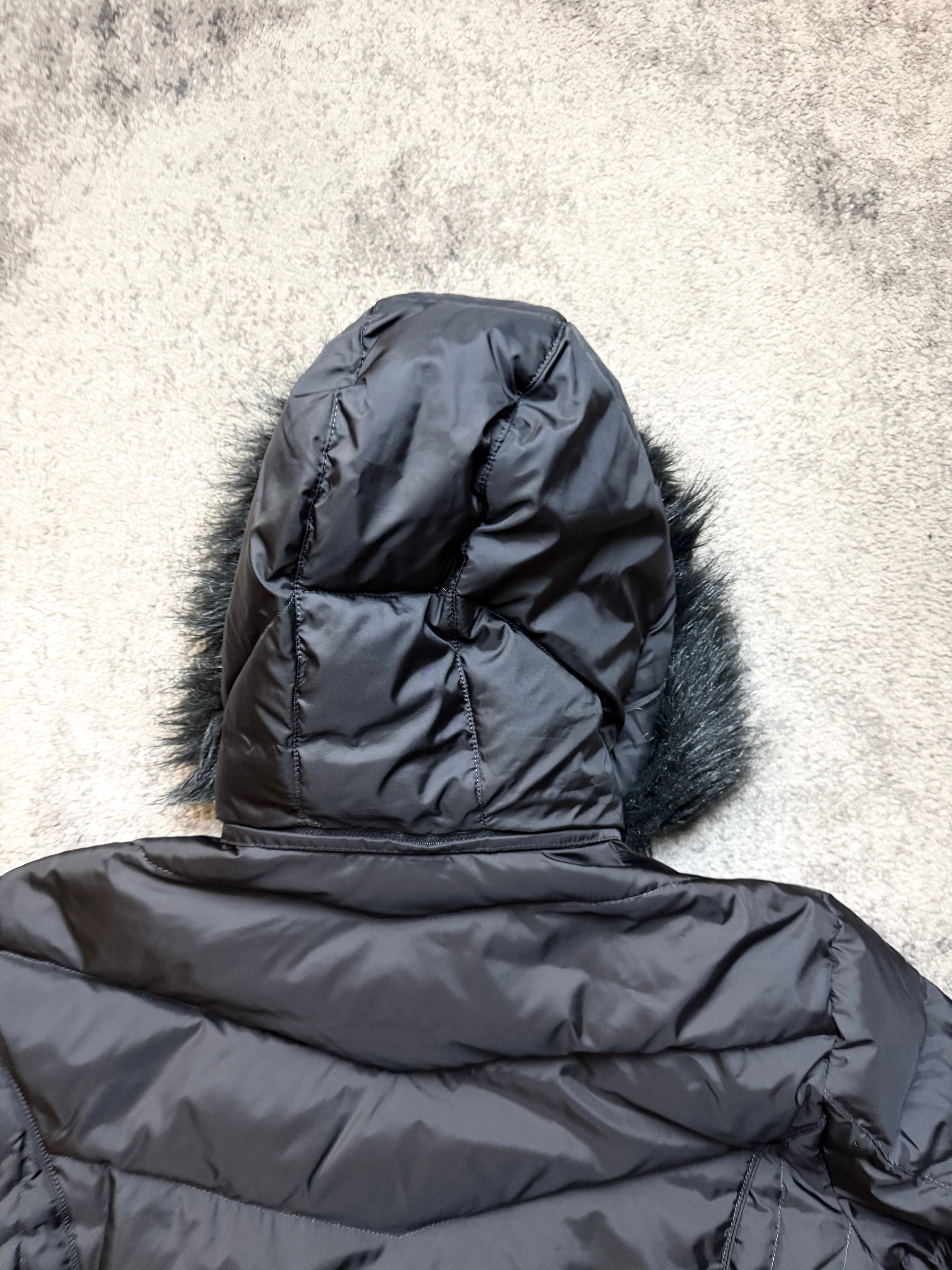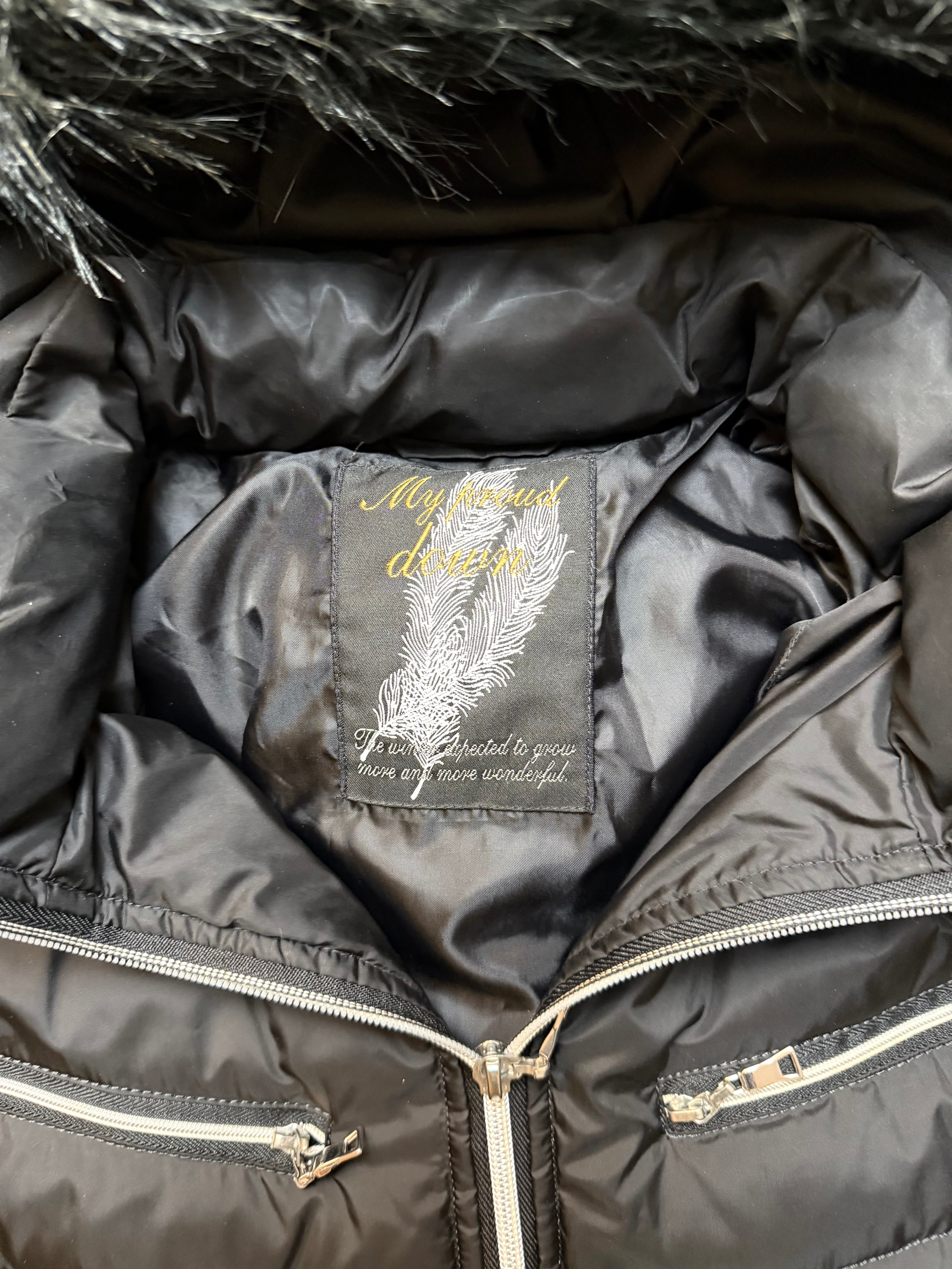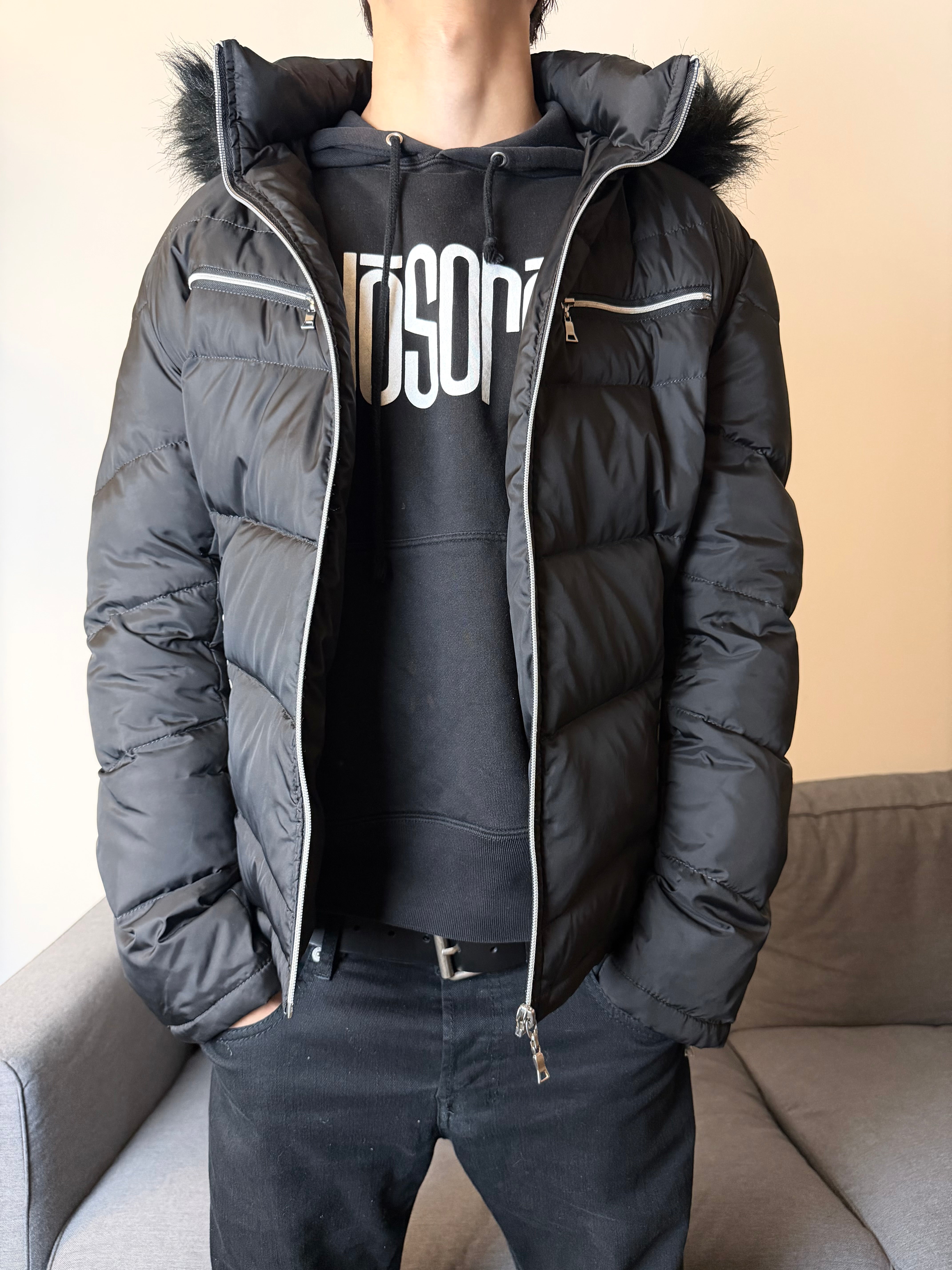 A sharp, winter-ready piece from Takeo Kikuchi—crafted with that signature Japanese precision. The jacket features a deep black nylon shell with a subtle matte sheen, structured quilting, and a detachable faux-fur hood trim for that unmistakable Tokyo-night attitude.