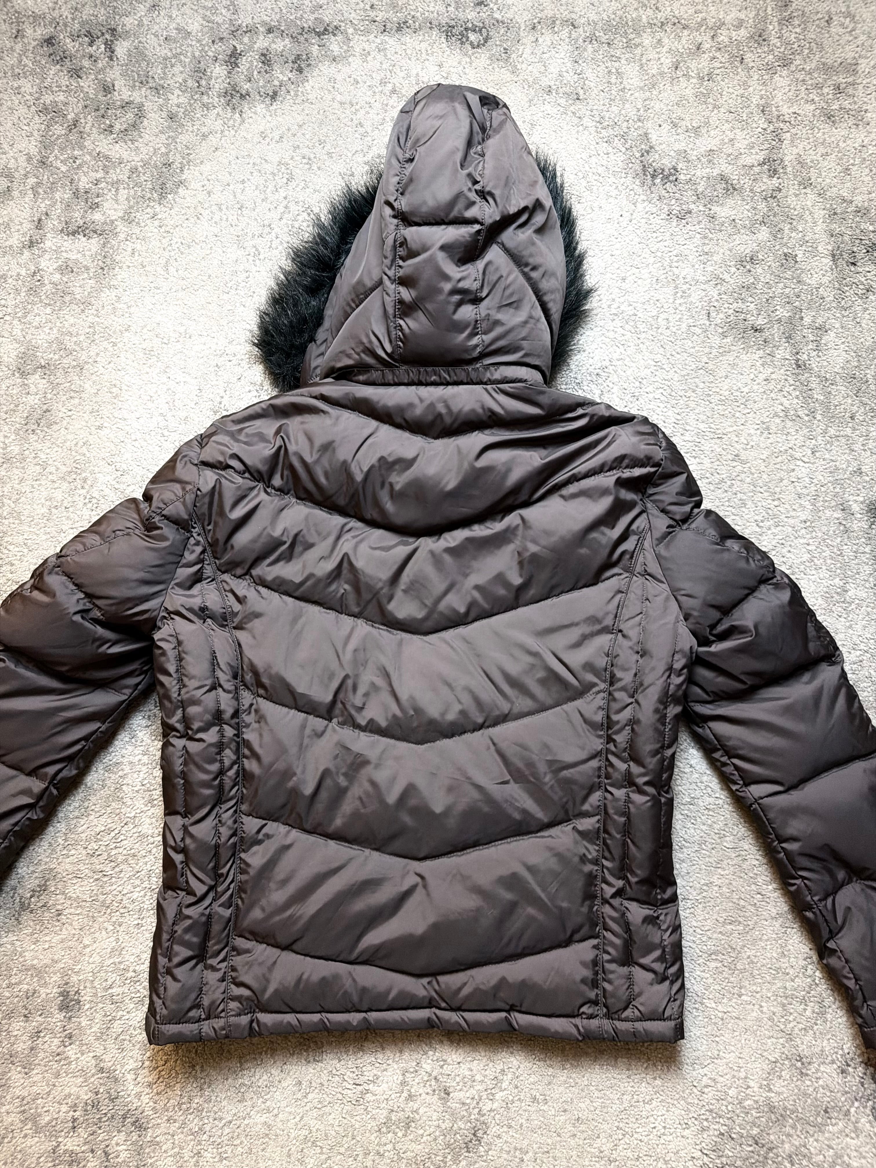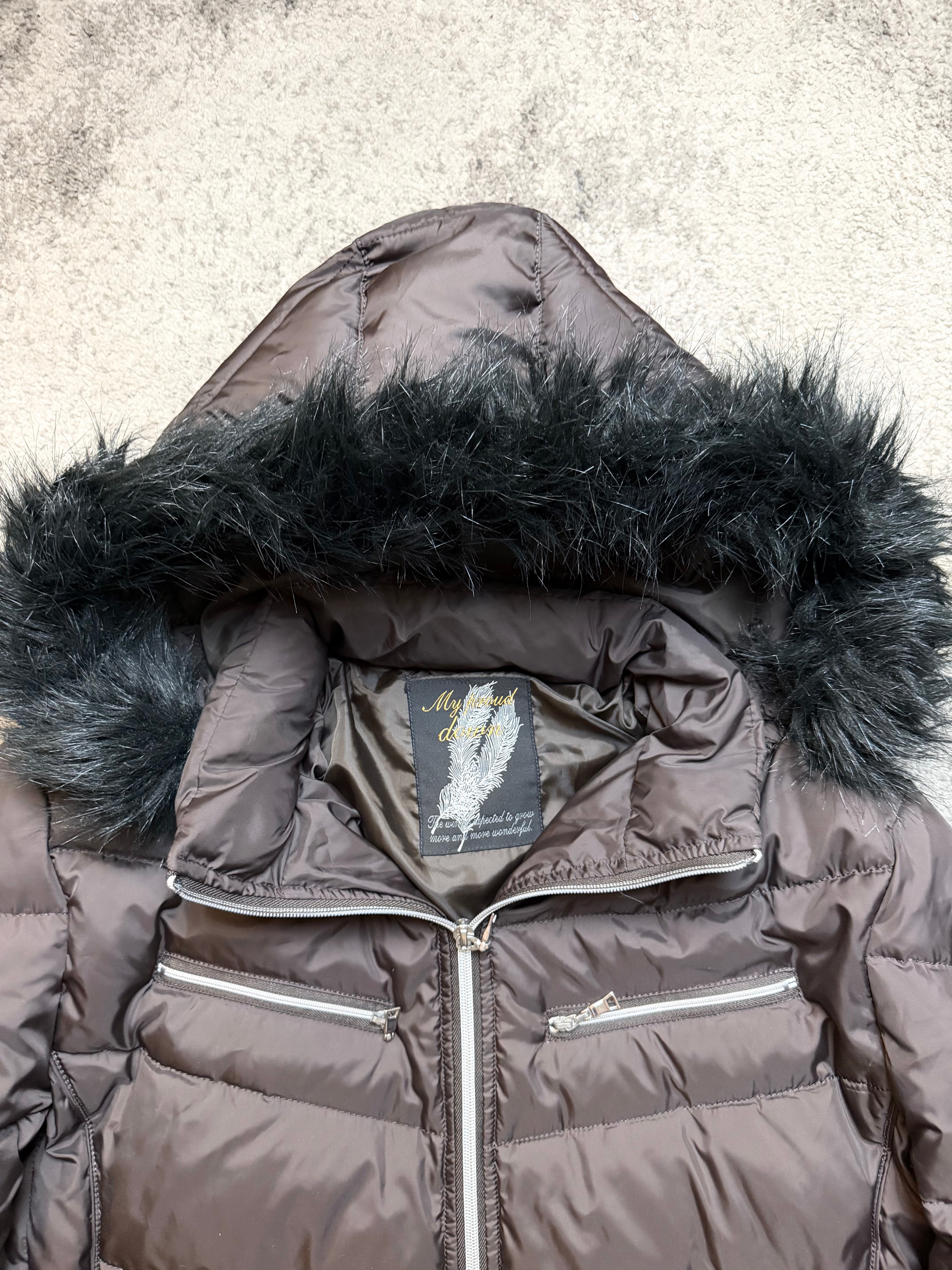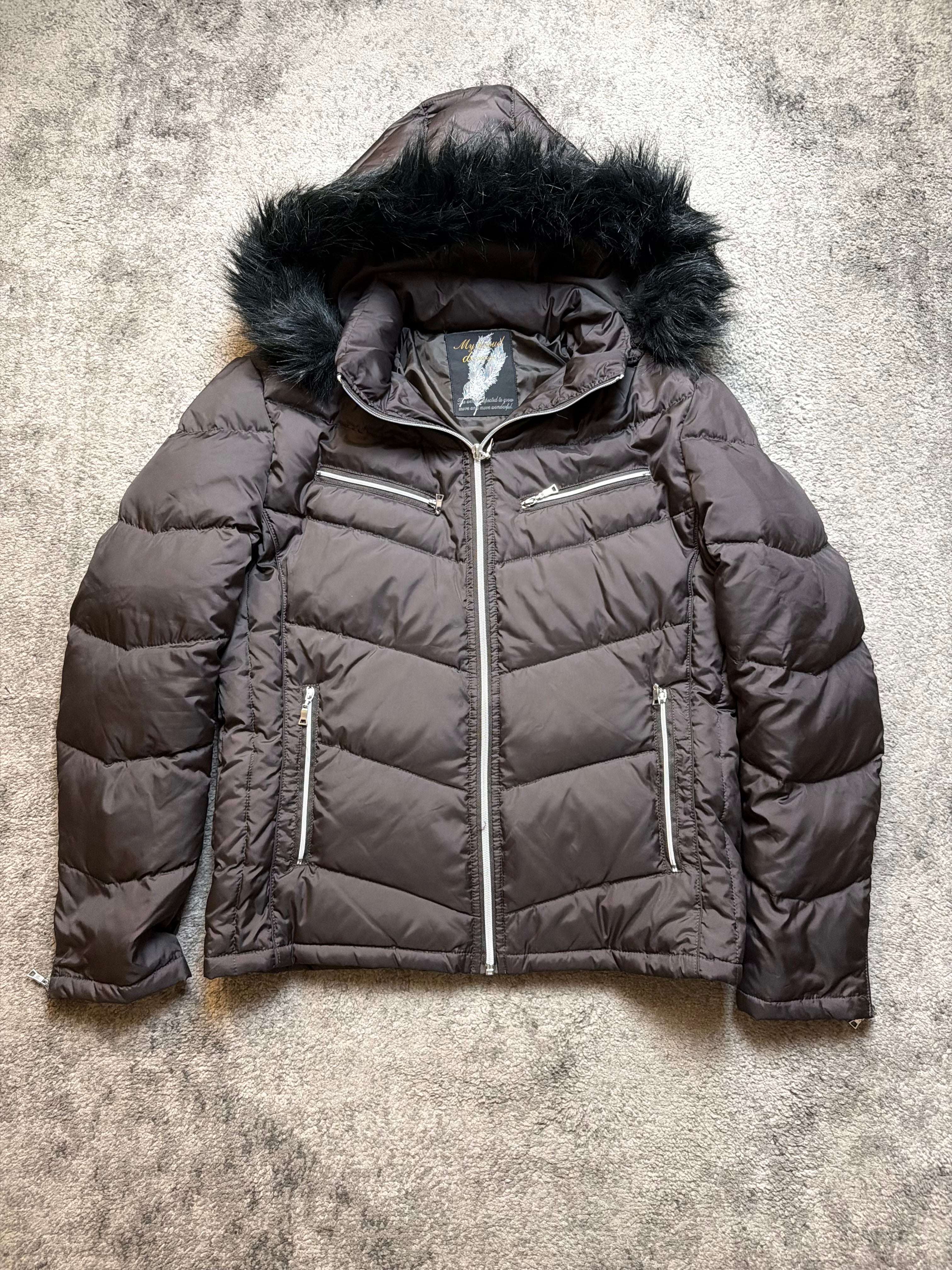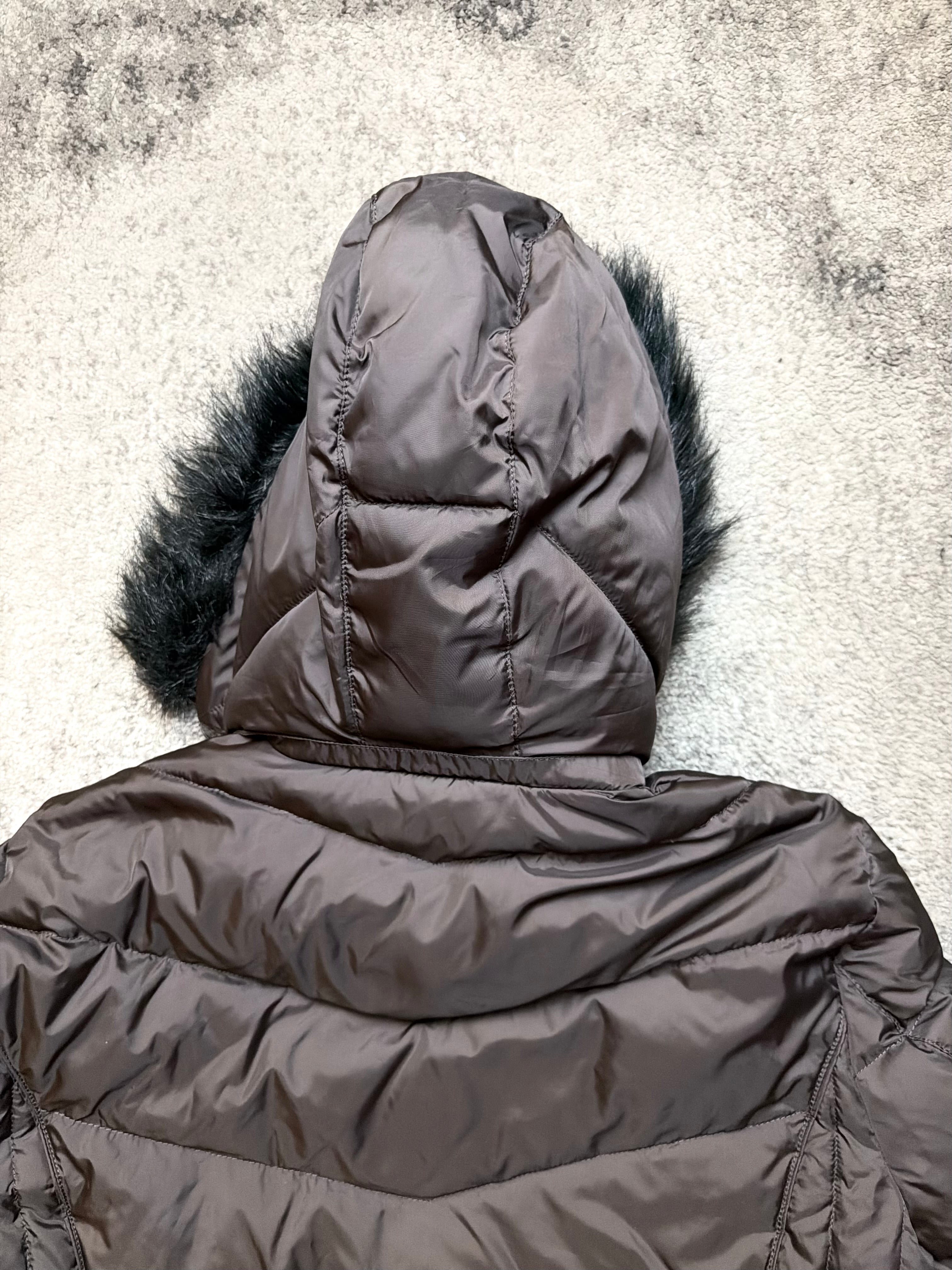 A sleek, archive-leaning winter piece—deep charcoal shell, razor-clean quilting, and a dramatic black faux-fur hood that adds just the right amount of rockstar winter energy. Refined but still dangerous.