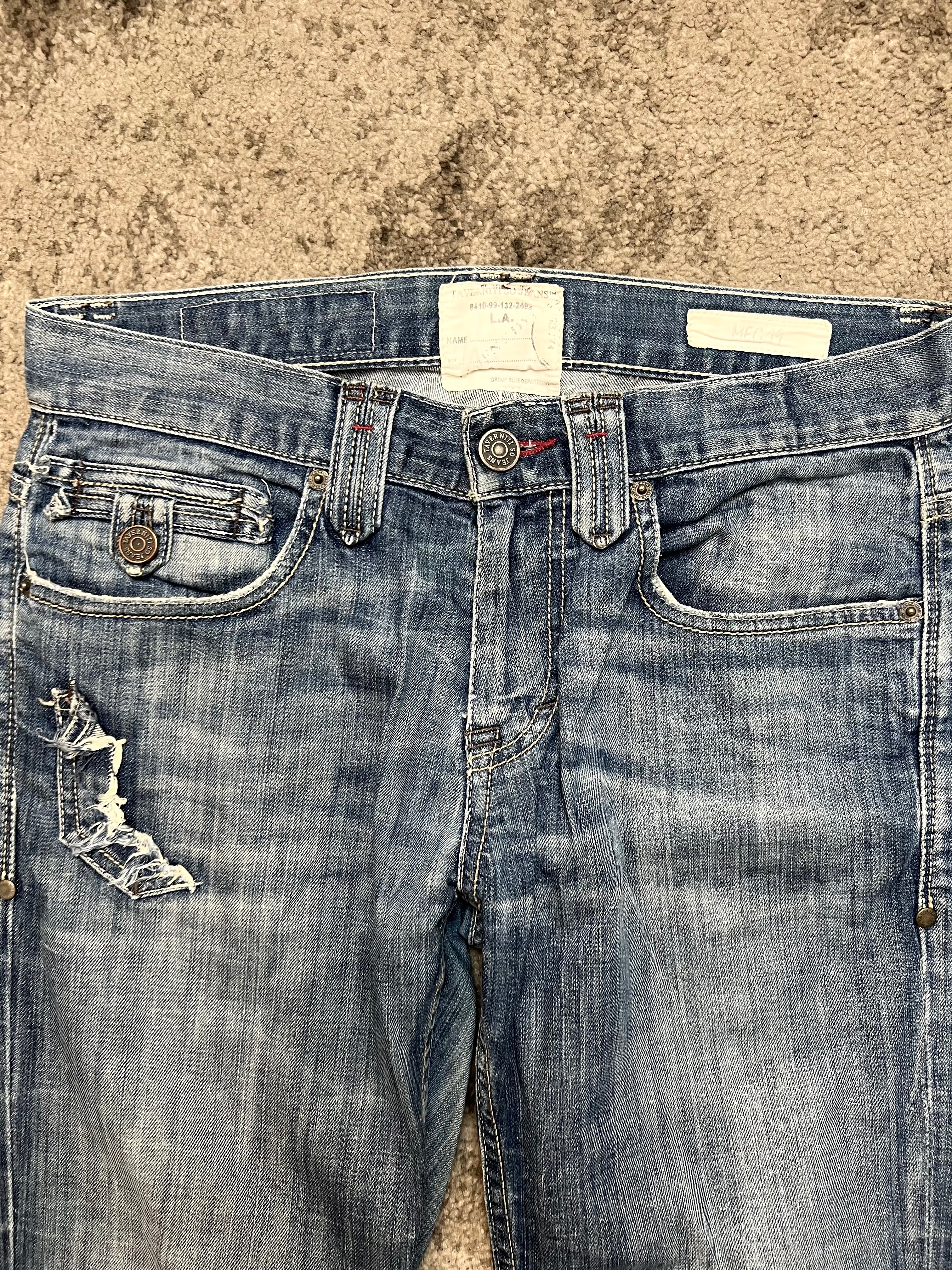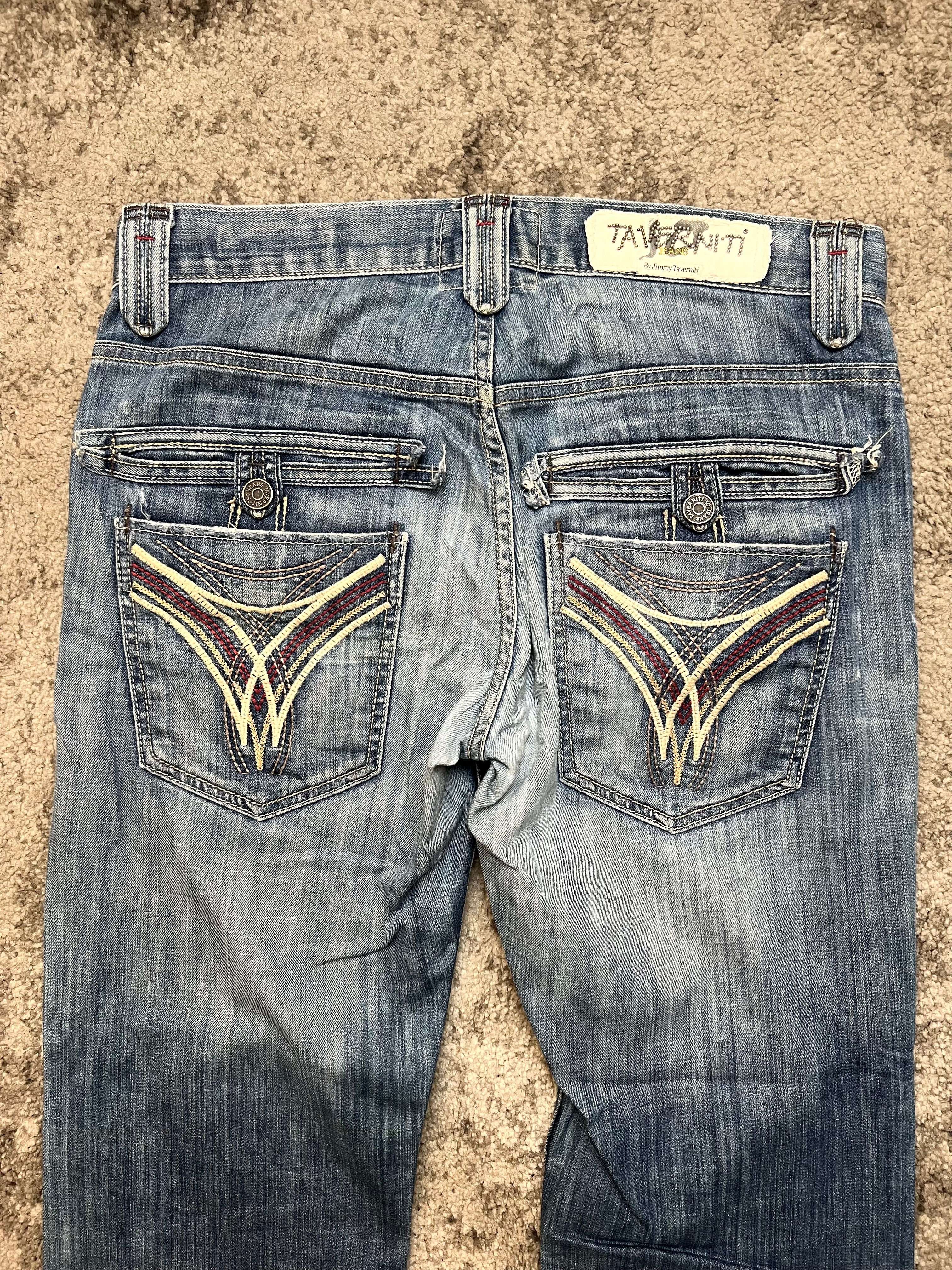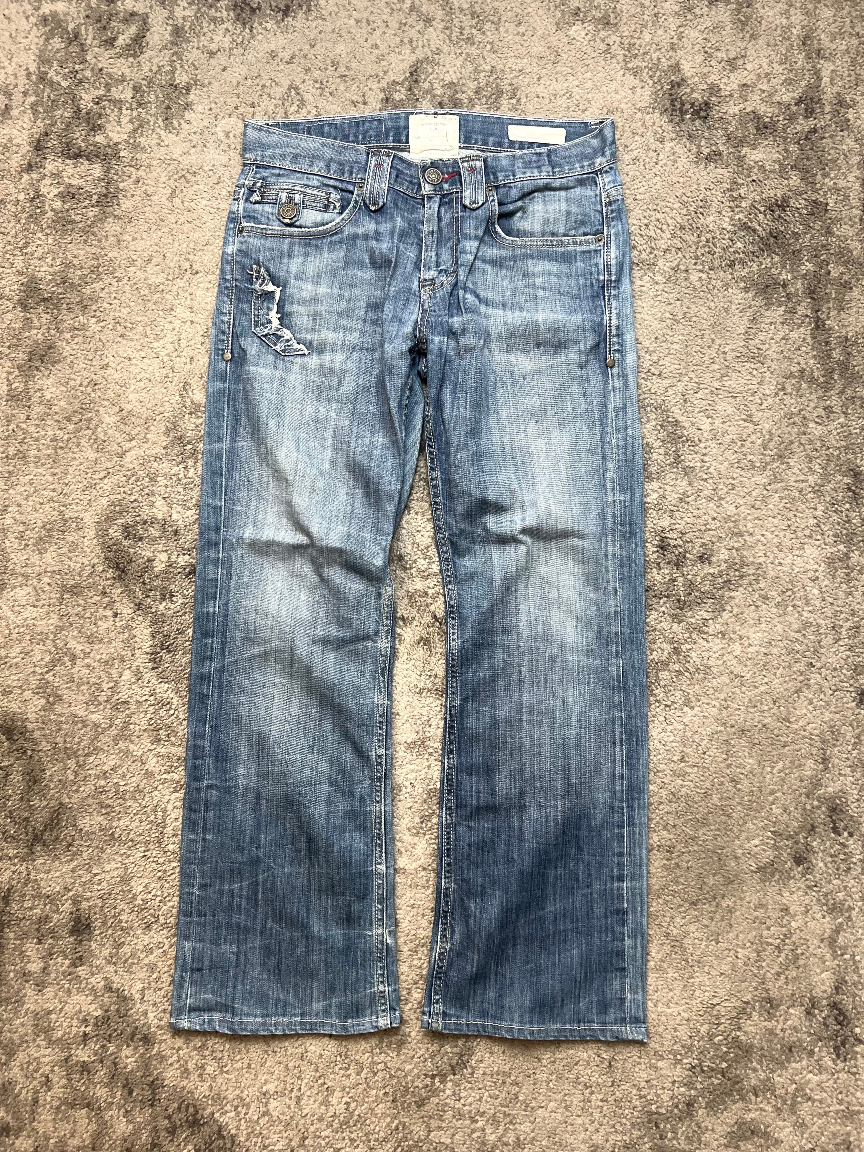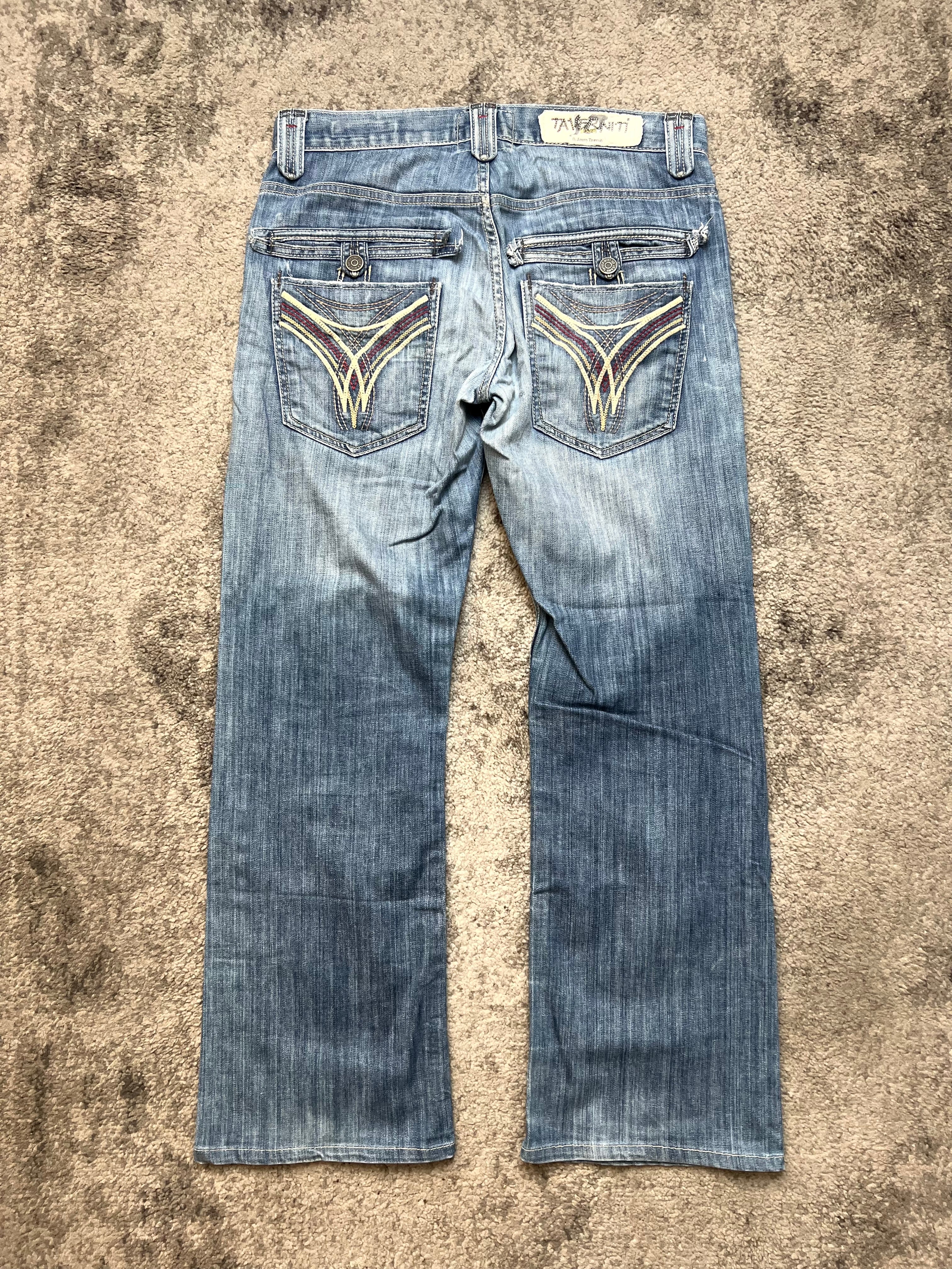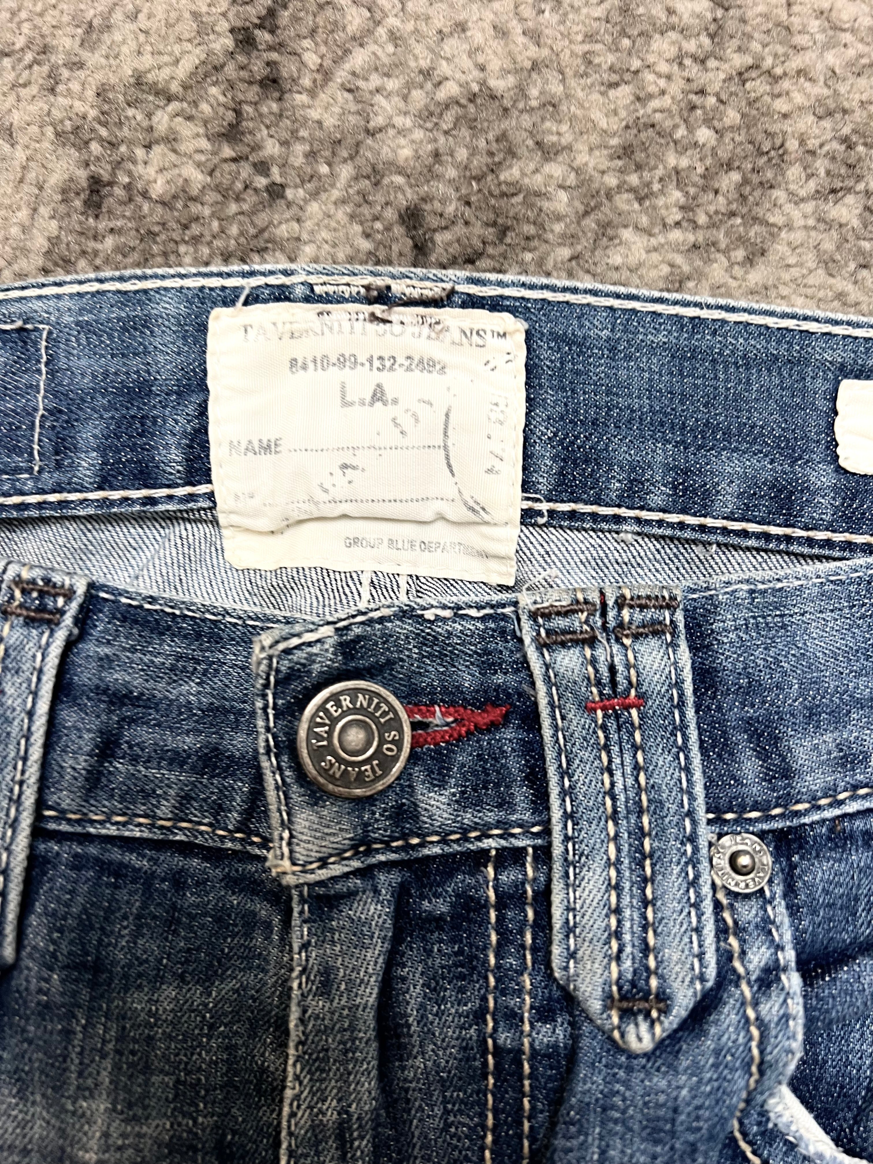 A beautifully worn TAVERNI denim that blends craftsmanship and attitude — a perfect representation of Japan’s early-2000s archive scene. The light indigo wash carries soft fading and natural creasing, giving it that effortless lived-in look.