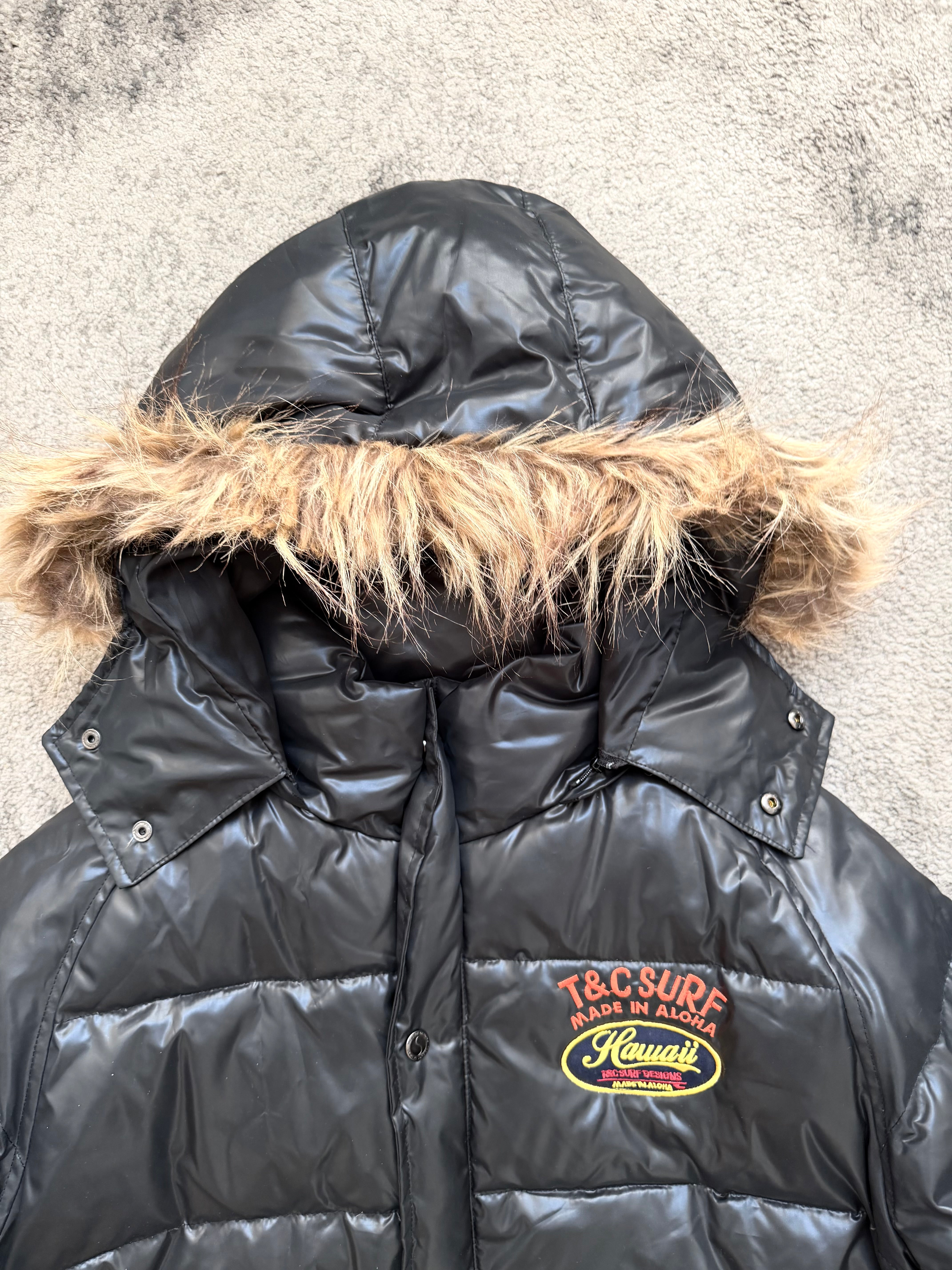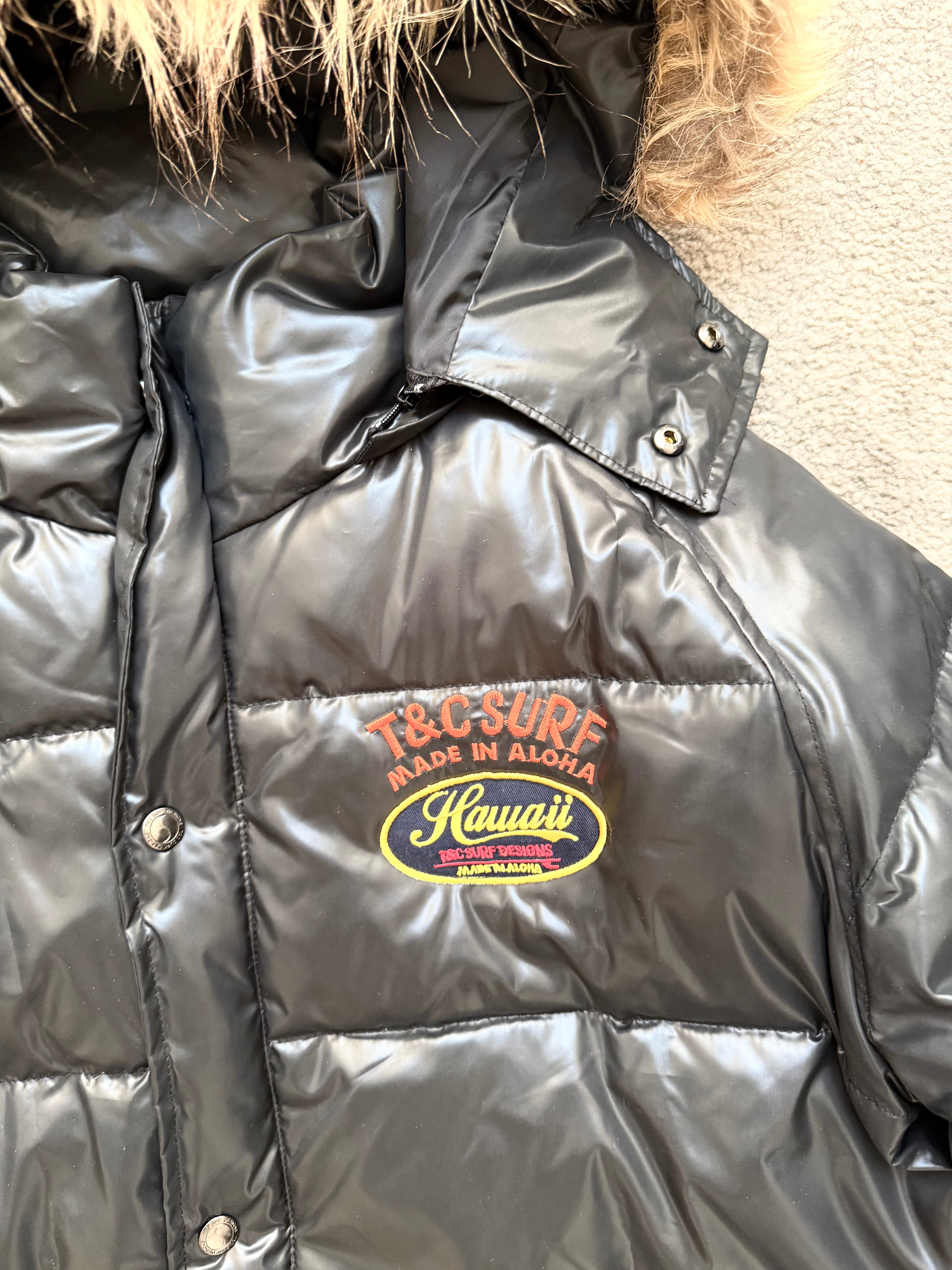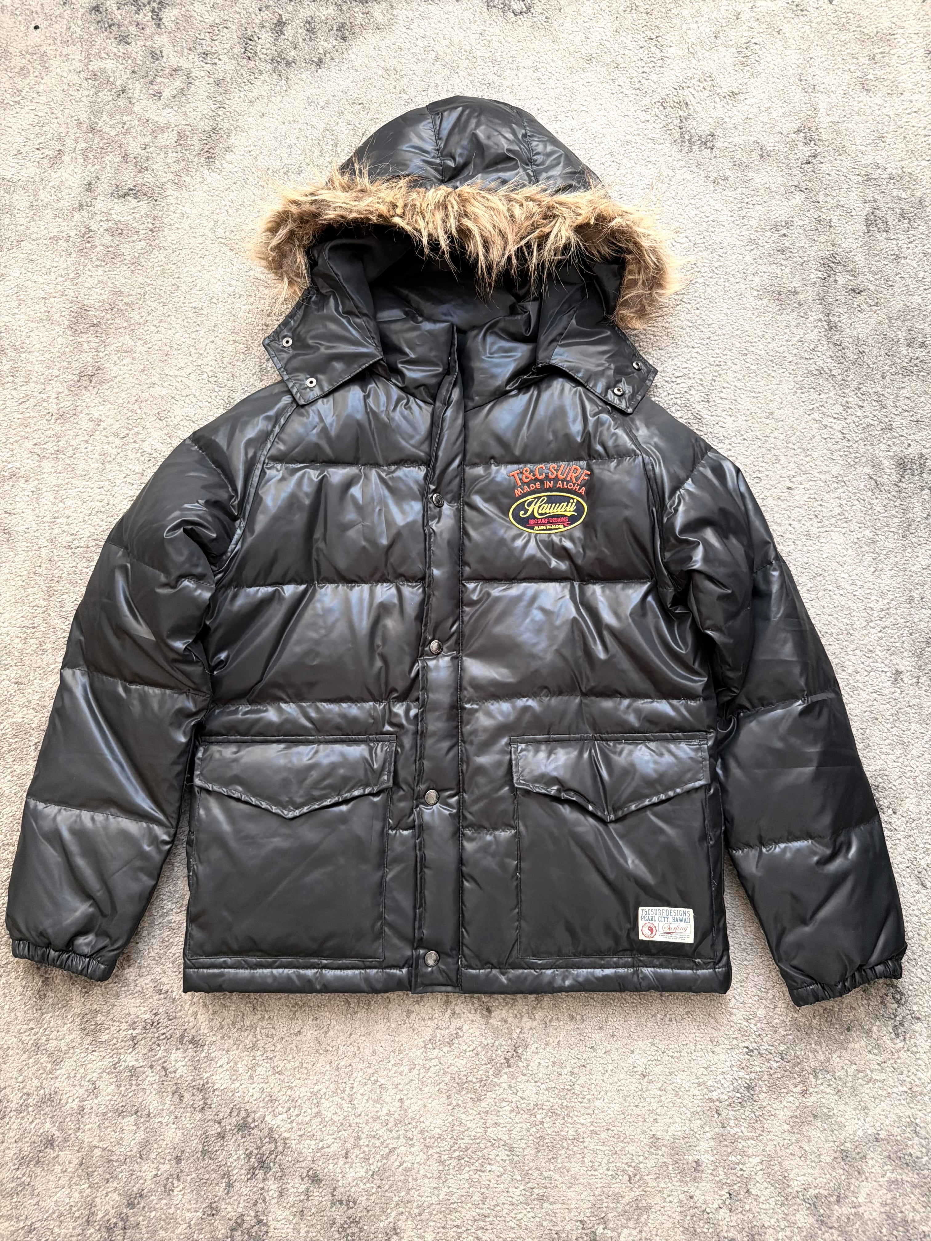 A rare slice of Japanese street-archives energy, built with that unmistakable early-2000s surf–meets-city attitude. This T&C SURF puffer comes in a clean glossy black shell, padded and structured with those chunky horizontal quilts that give it a real Number (N)ine / early Harajuku winter vibe.