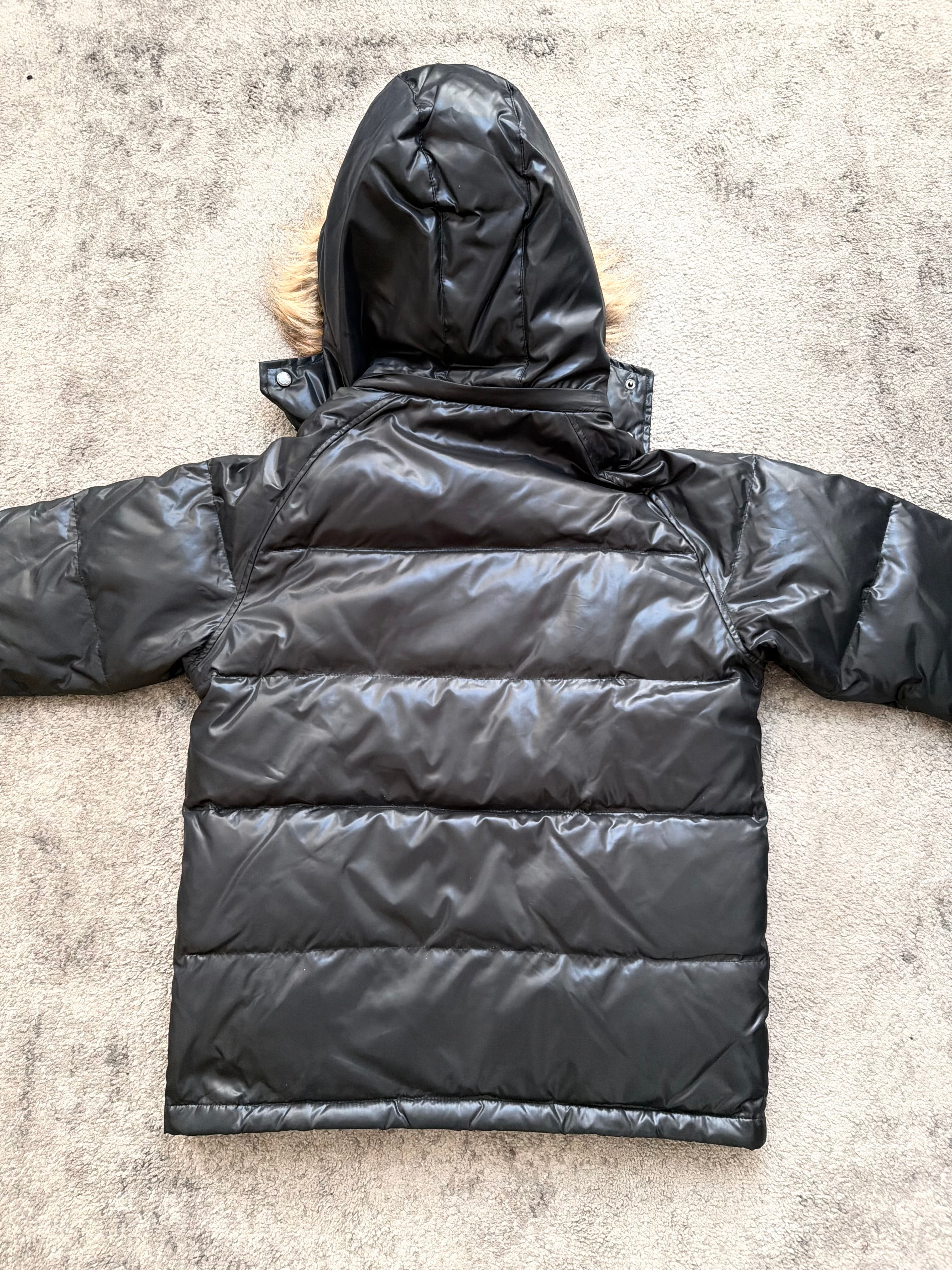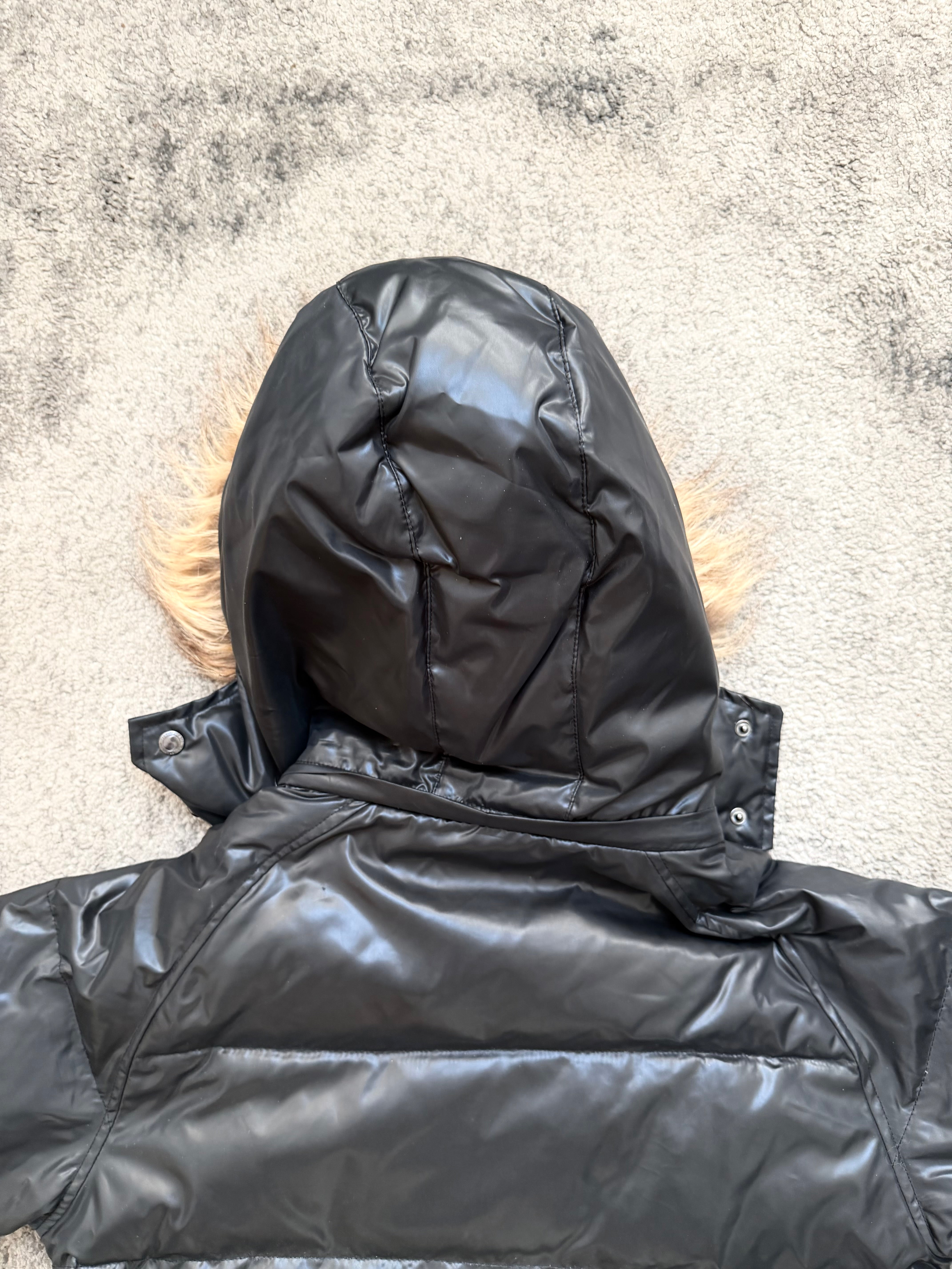 Material: Soft, lightweight synthetic down shell with a bold sheen. Warm padded fill. Faux-fur trimmed hood for that dramatic winter silhouette.