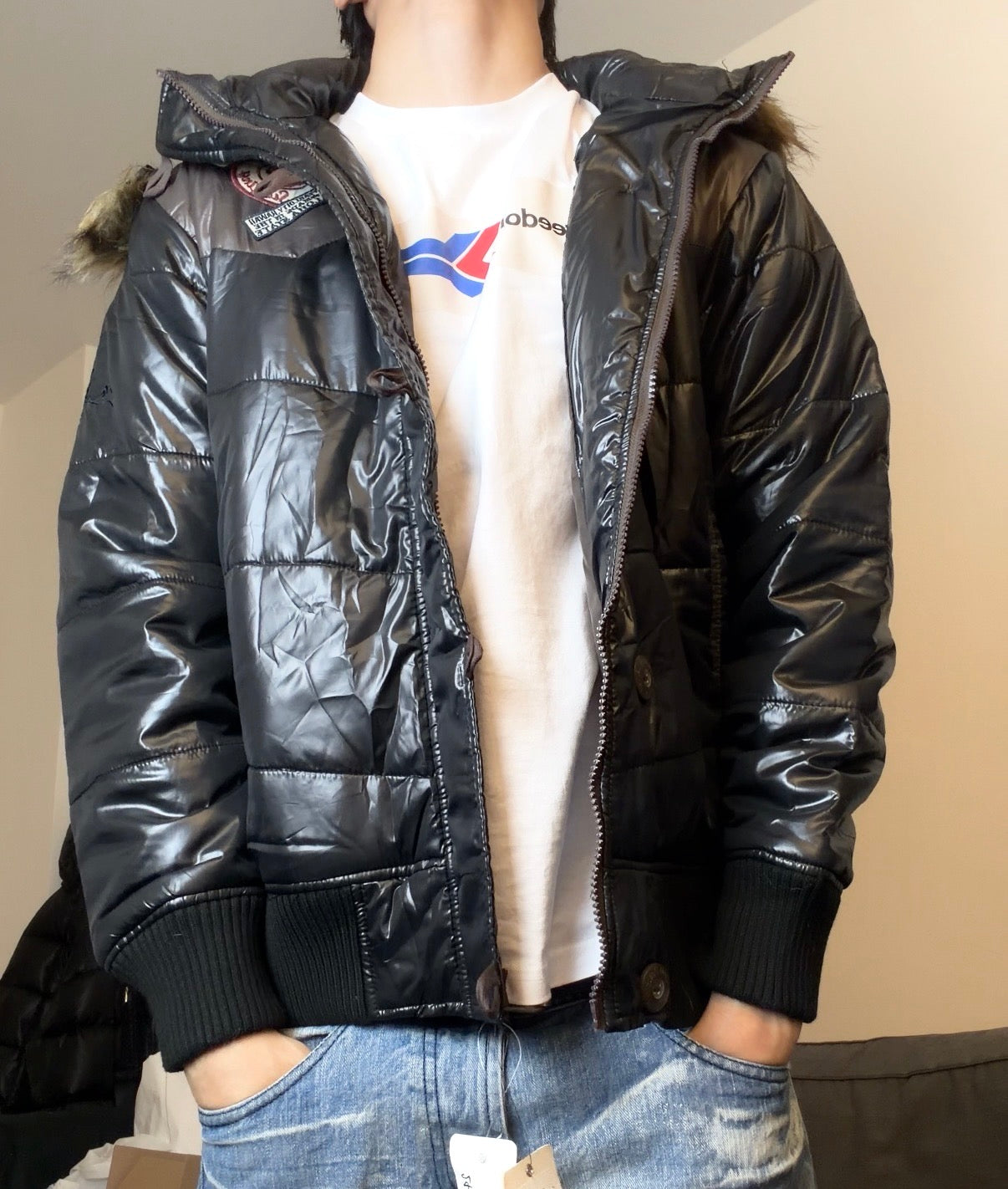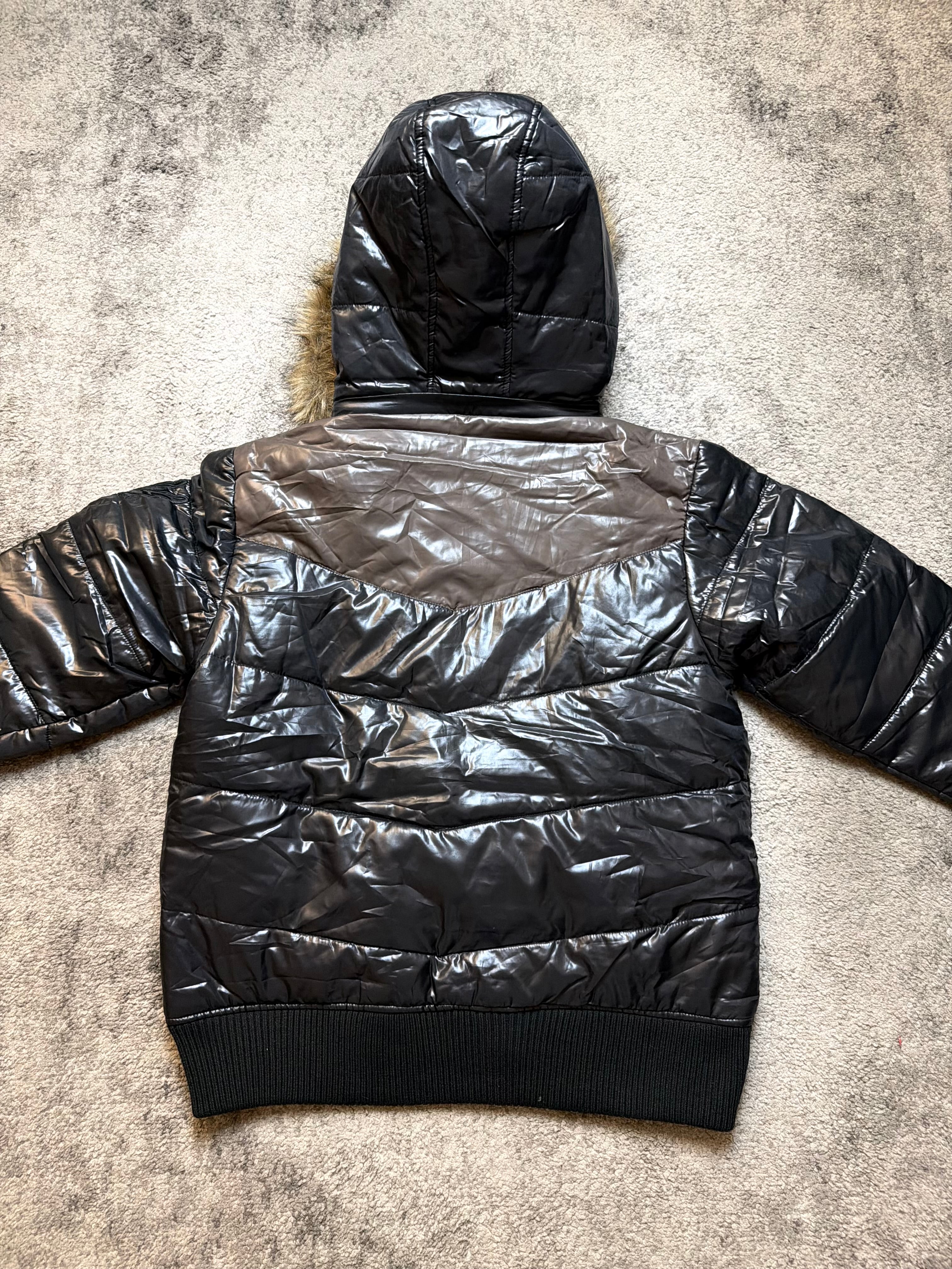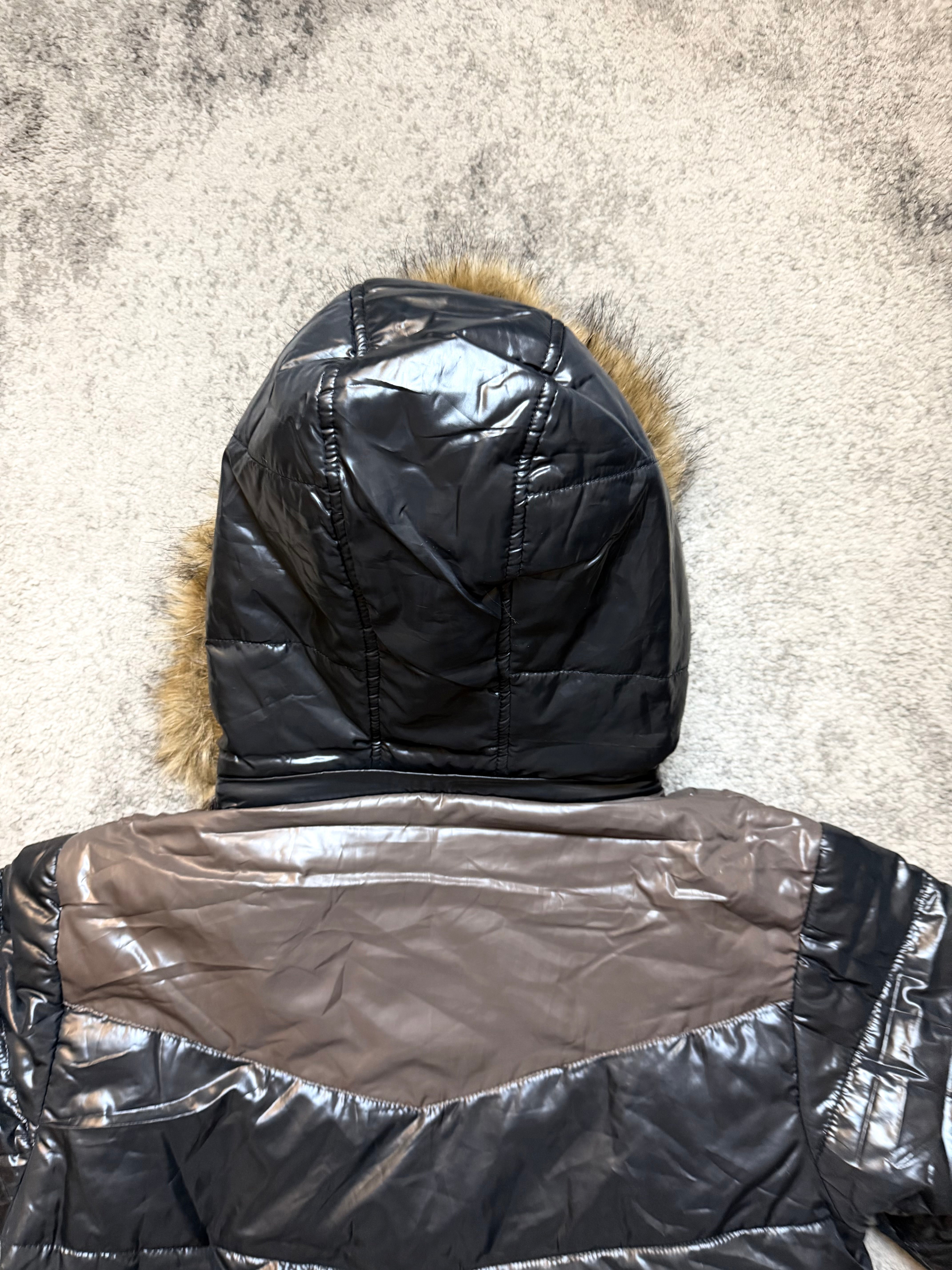 Glossy nylon shell with insulated padding for real warmth. Faux-fur hood trim adds extra texture and that classic Japanese winter silhouette. Ribbed cuffs and hem keep the fit tight and cozy.