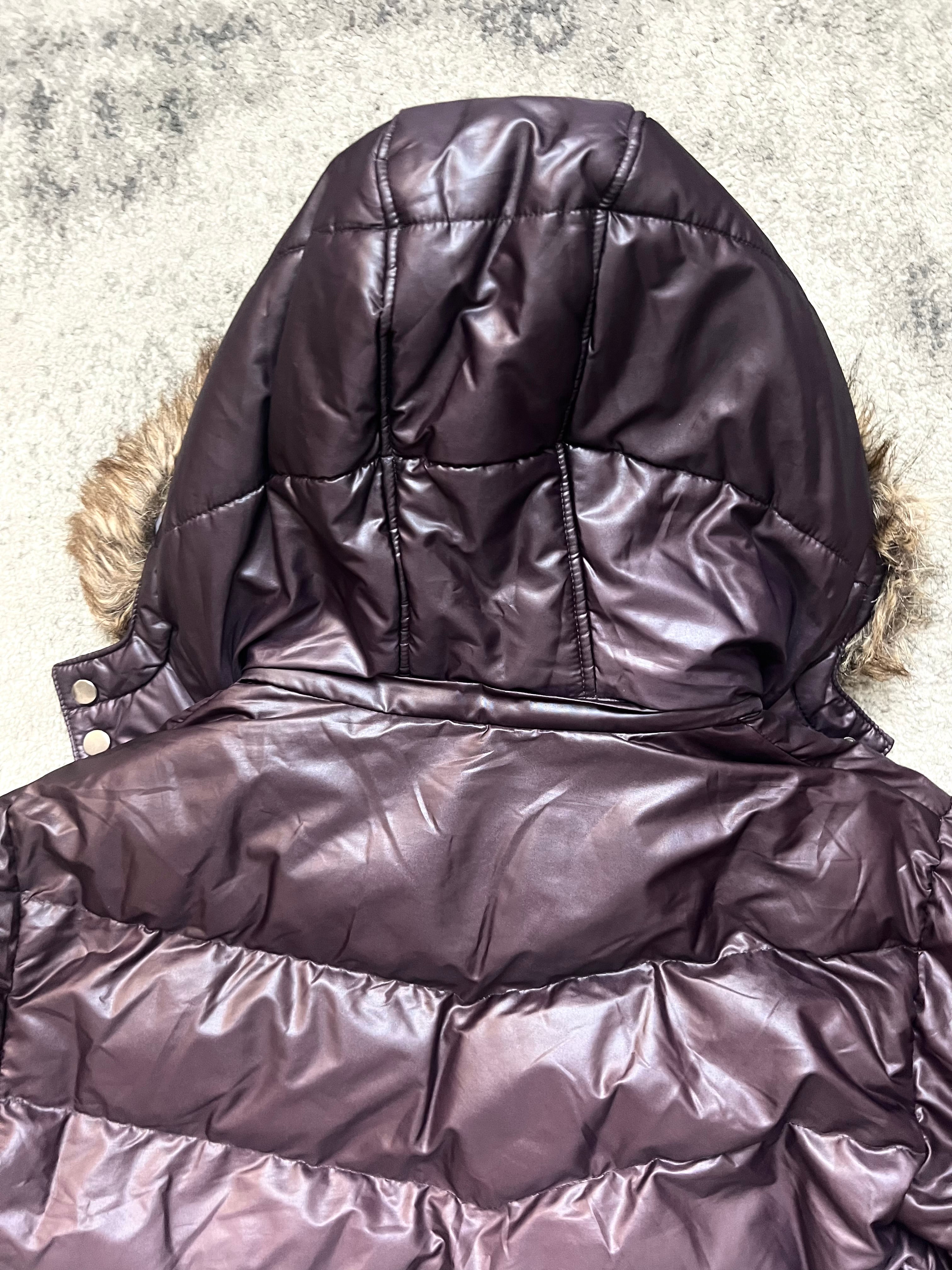 Constructed from glossy nylon with full down insulation, it features ribbed hems, zip and snap pockets, and a detachable faux-fur hood. The slightly cropped, structured fit gives it a modern silhouette with that signature Japanese balance between techwear and street attitude.