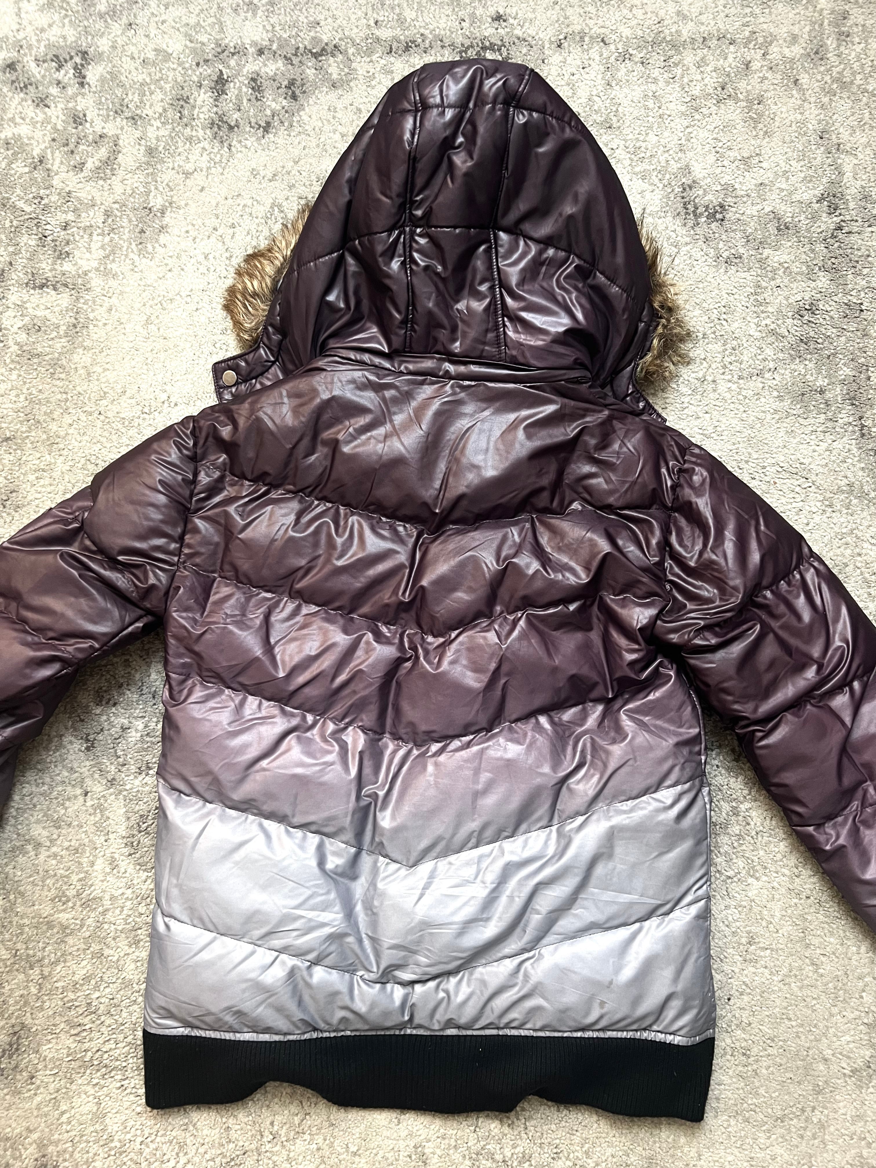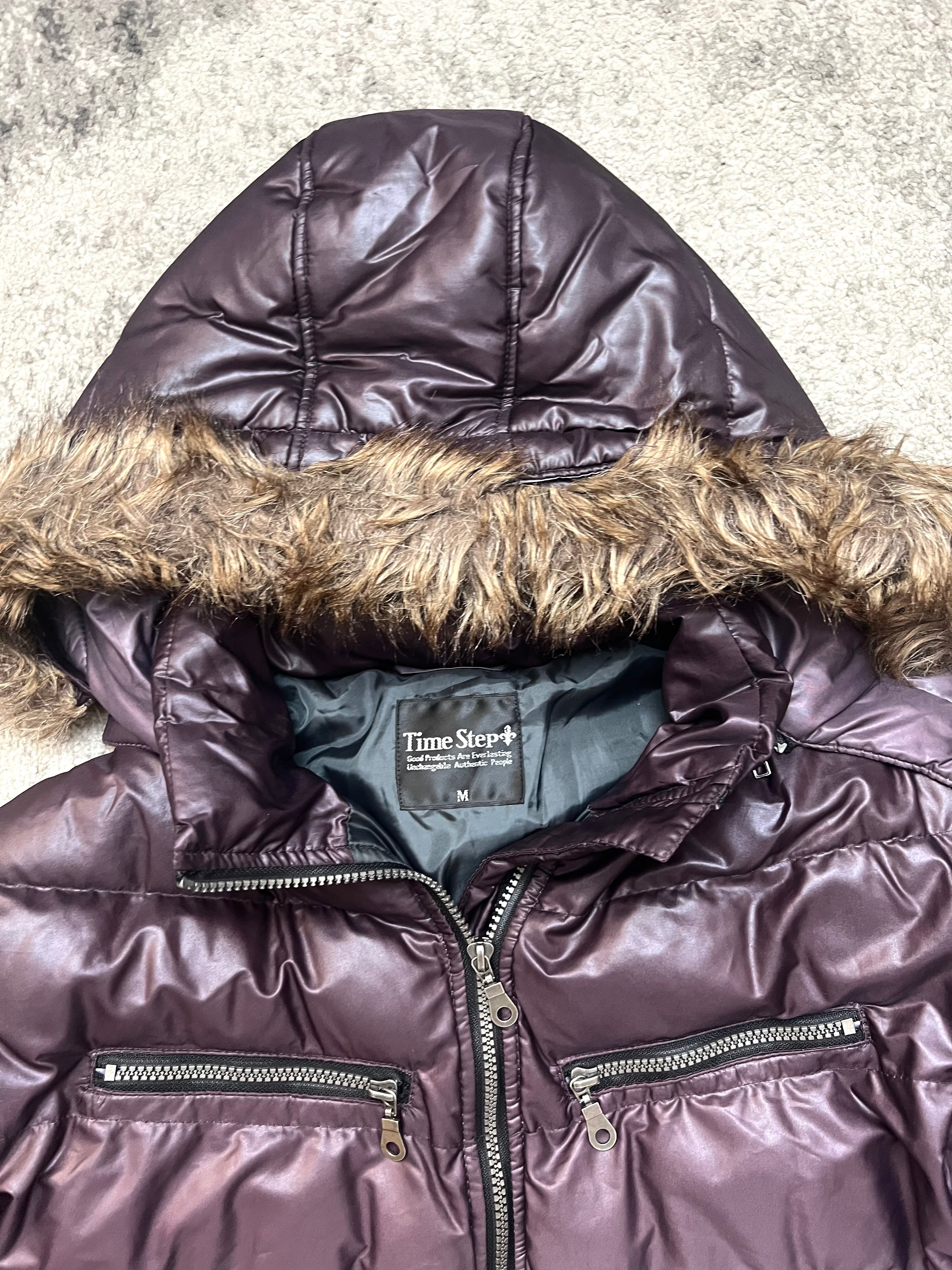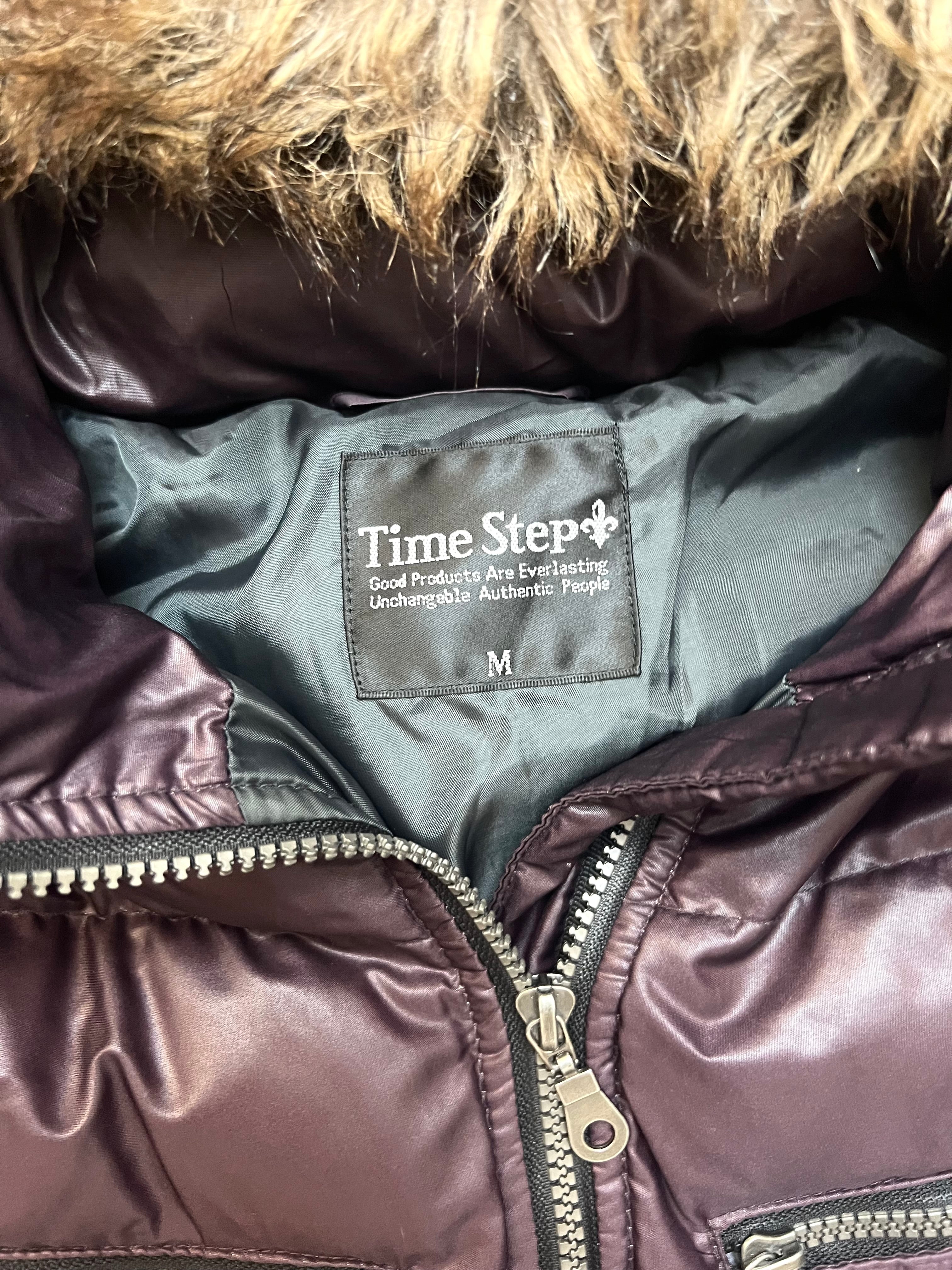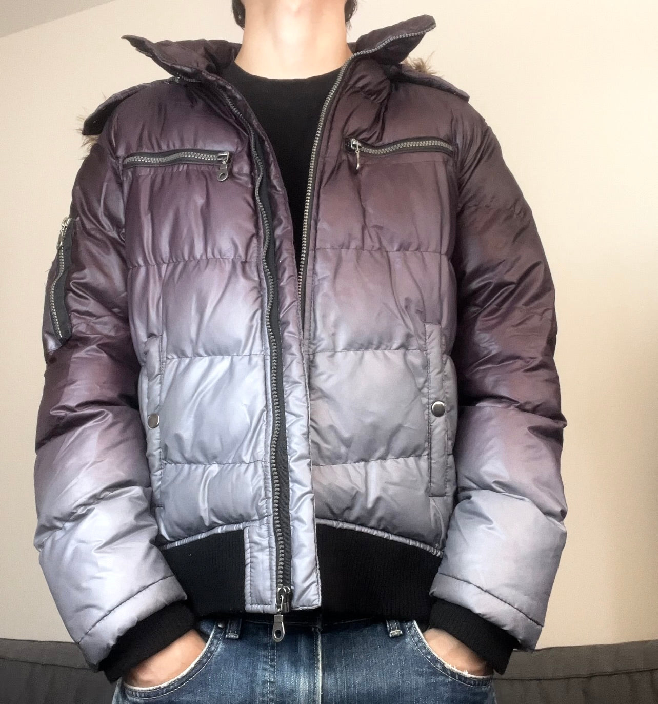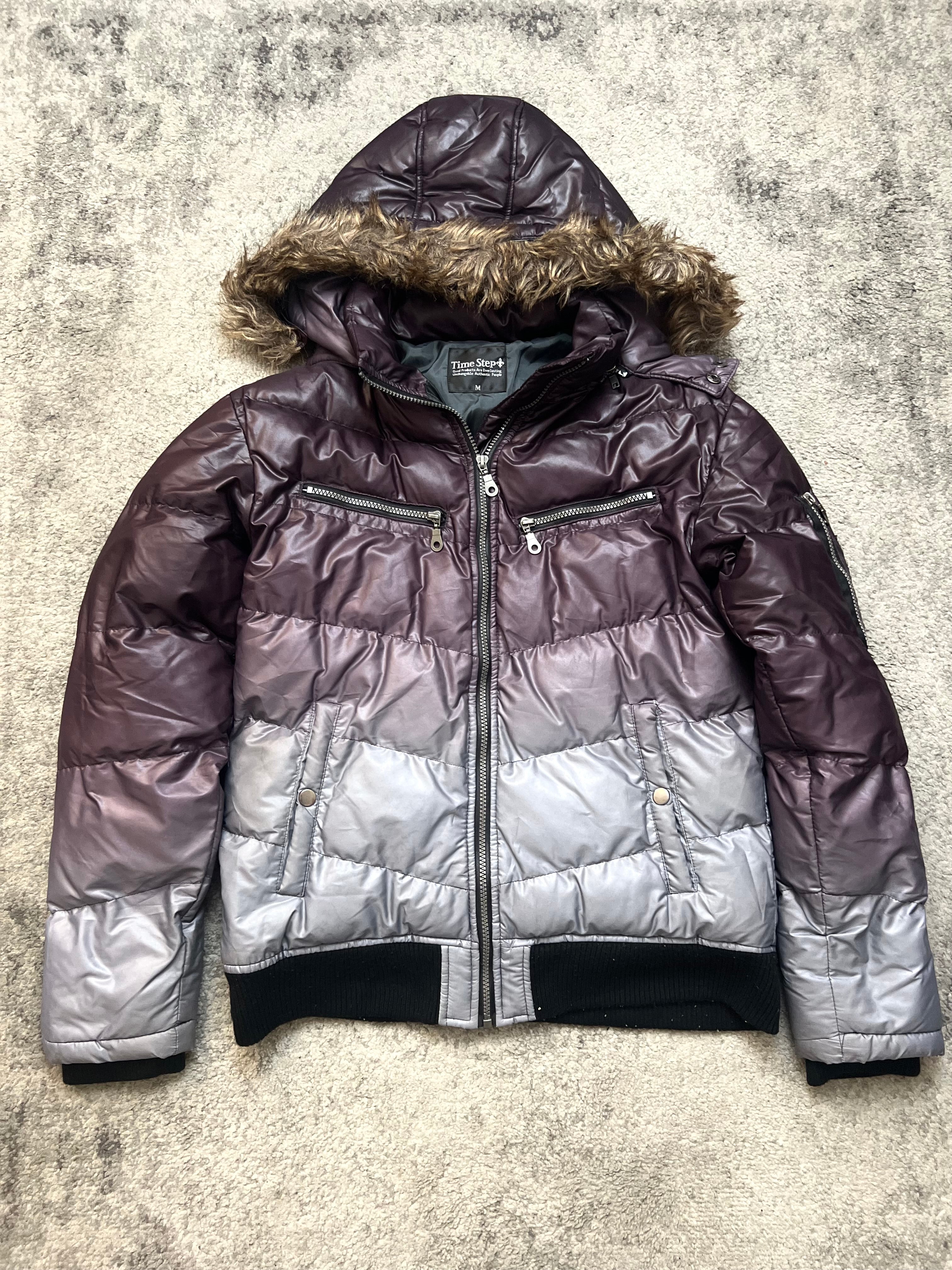 A rare gradient down jacket from TIMESTEP Japan, channeling that unmistakable early-2000s archive energy. The ombré fade from deep plum to metallic silver creates a futuristic yet nostalgic visual rhythm — the kind of outerwear you’d see in old Harajuku street snaps.