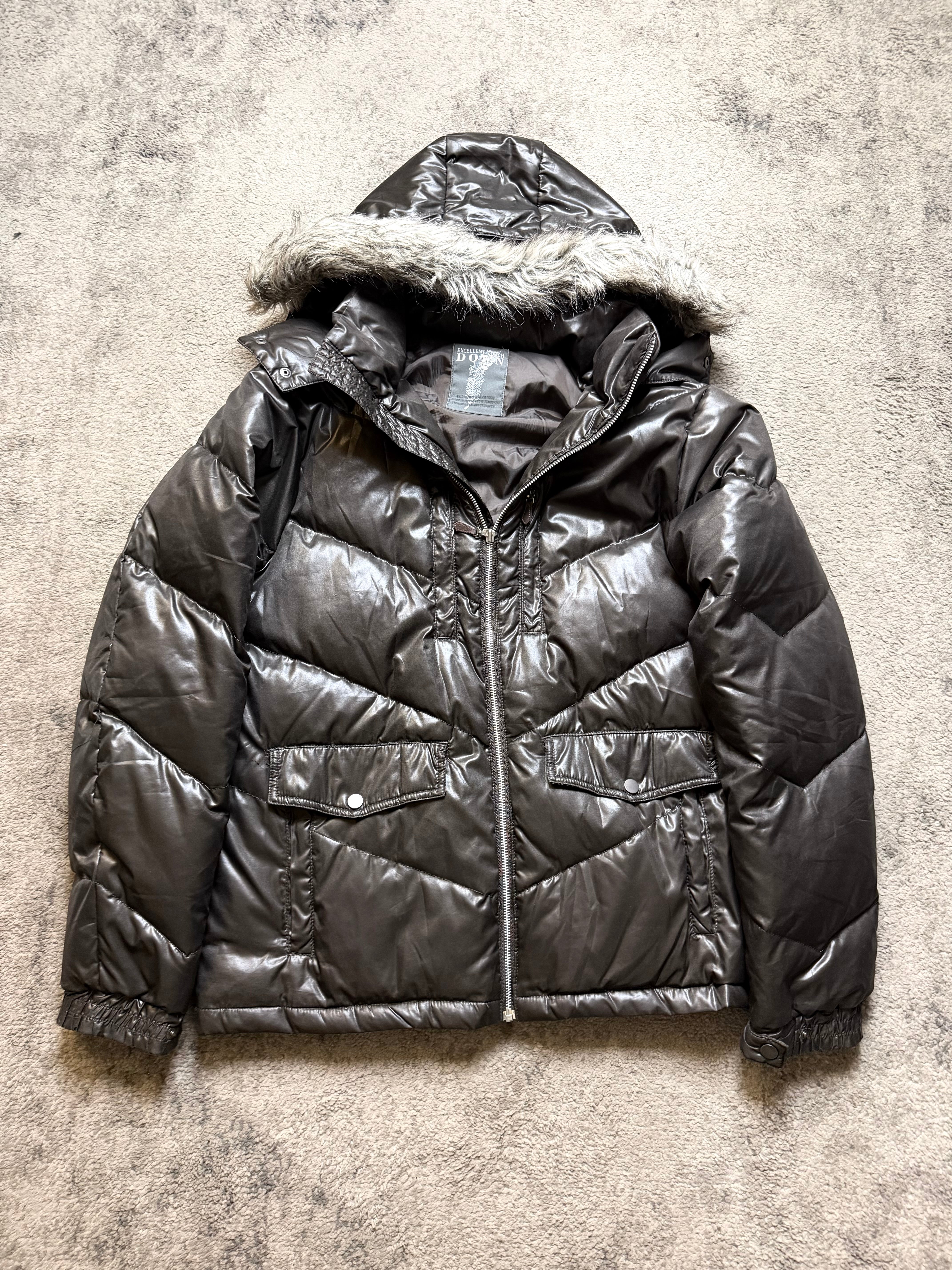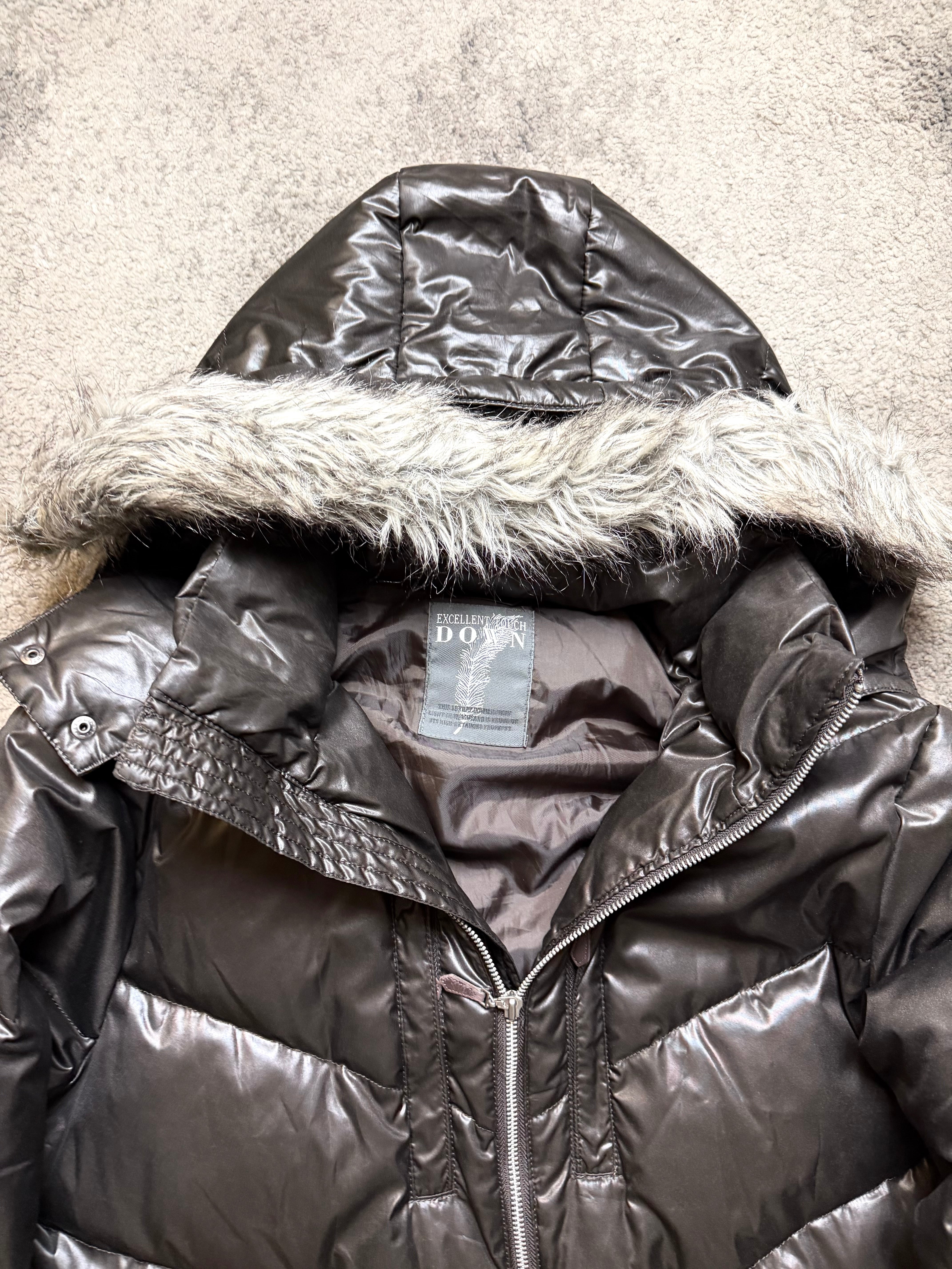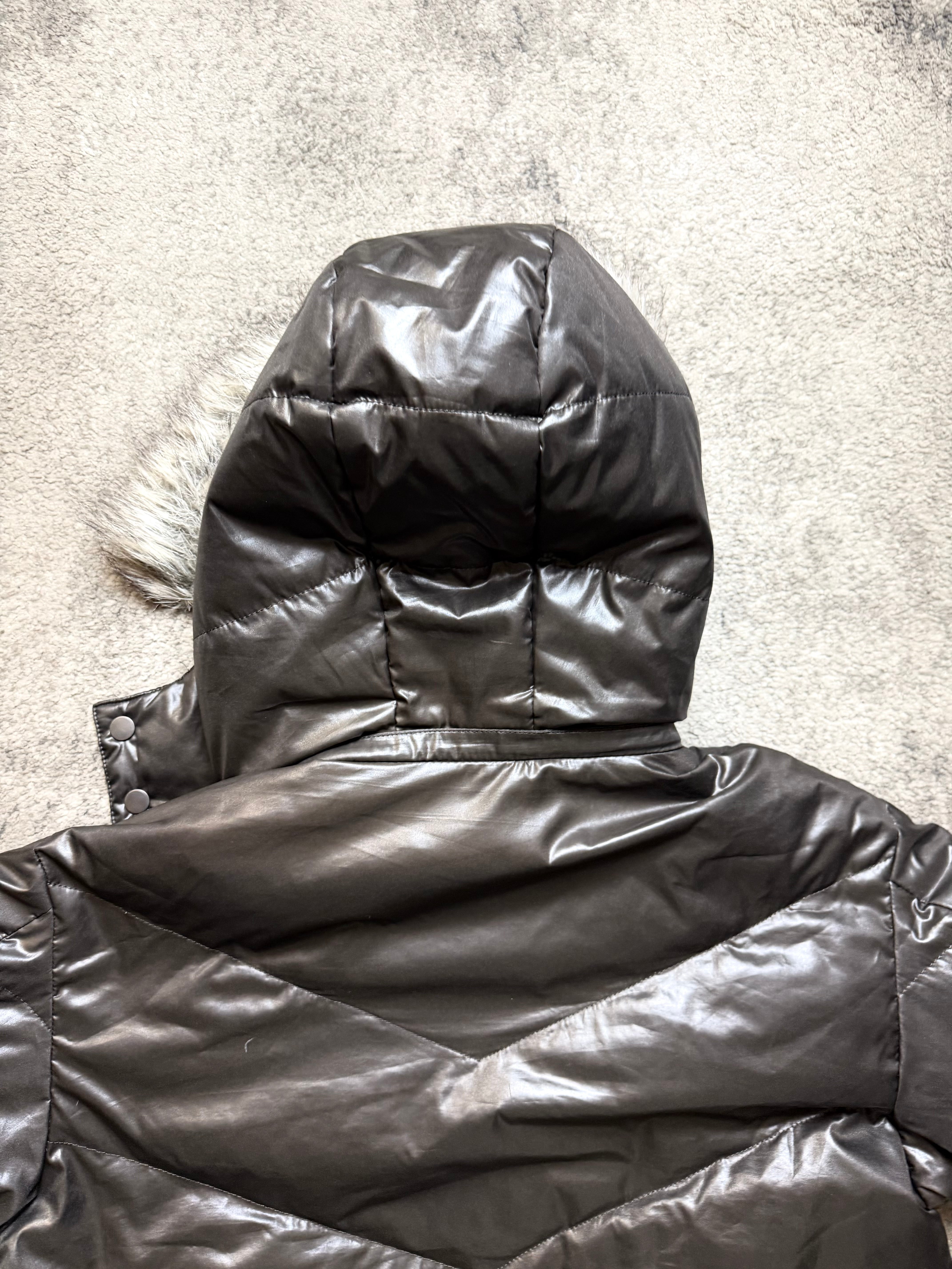Material: High-gloss nylon shell with warm padded insulation. Smooth, almost liquid-like finish contrasted by a soft faux-fur hood trim for that unmistakable archive feel.