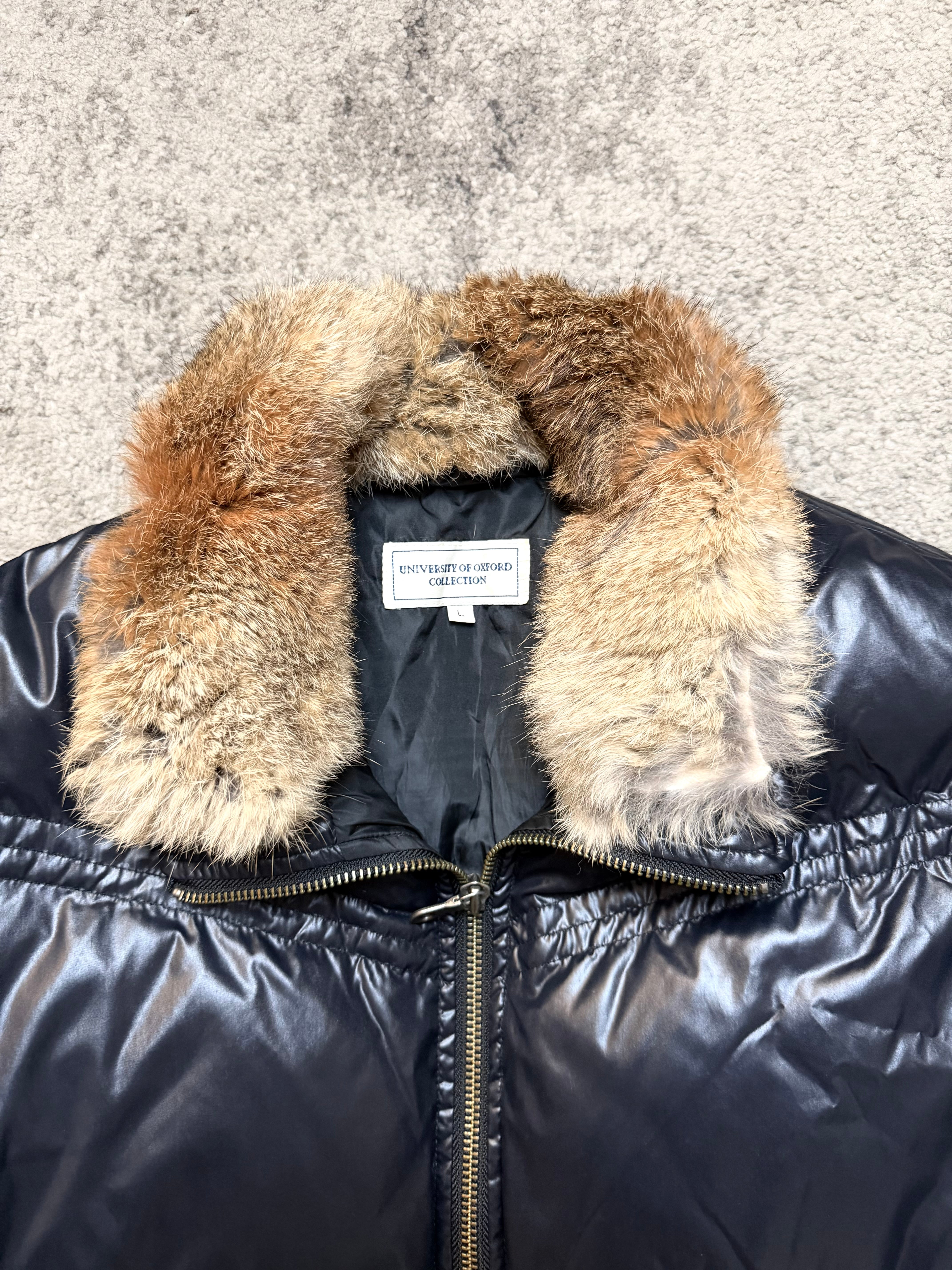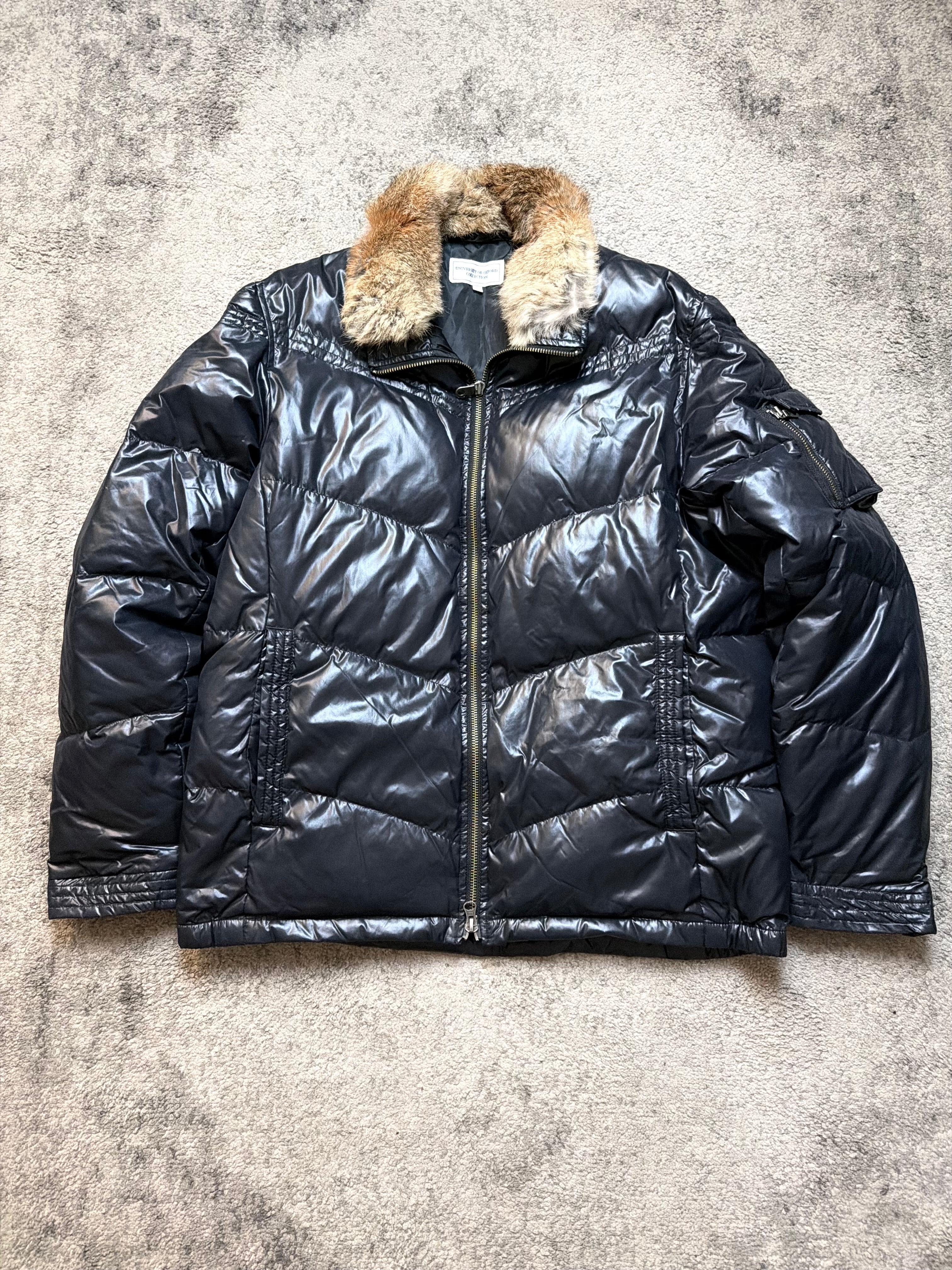 A rare Japanese-market puffer by UNIVERSITY OF OXFORD, captured in rich, dark graphite tones with that signature archive sheen that feels straight out of a 2000s Tokyo street snapshot.