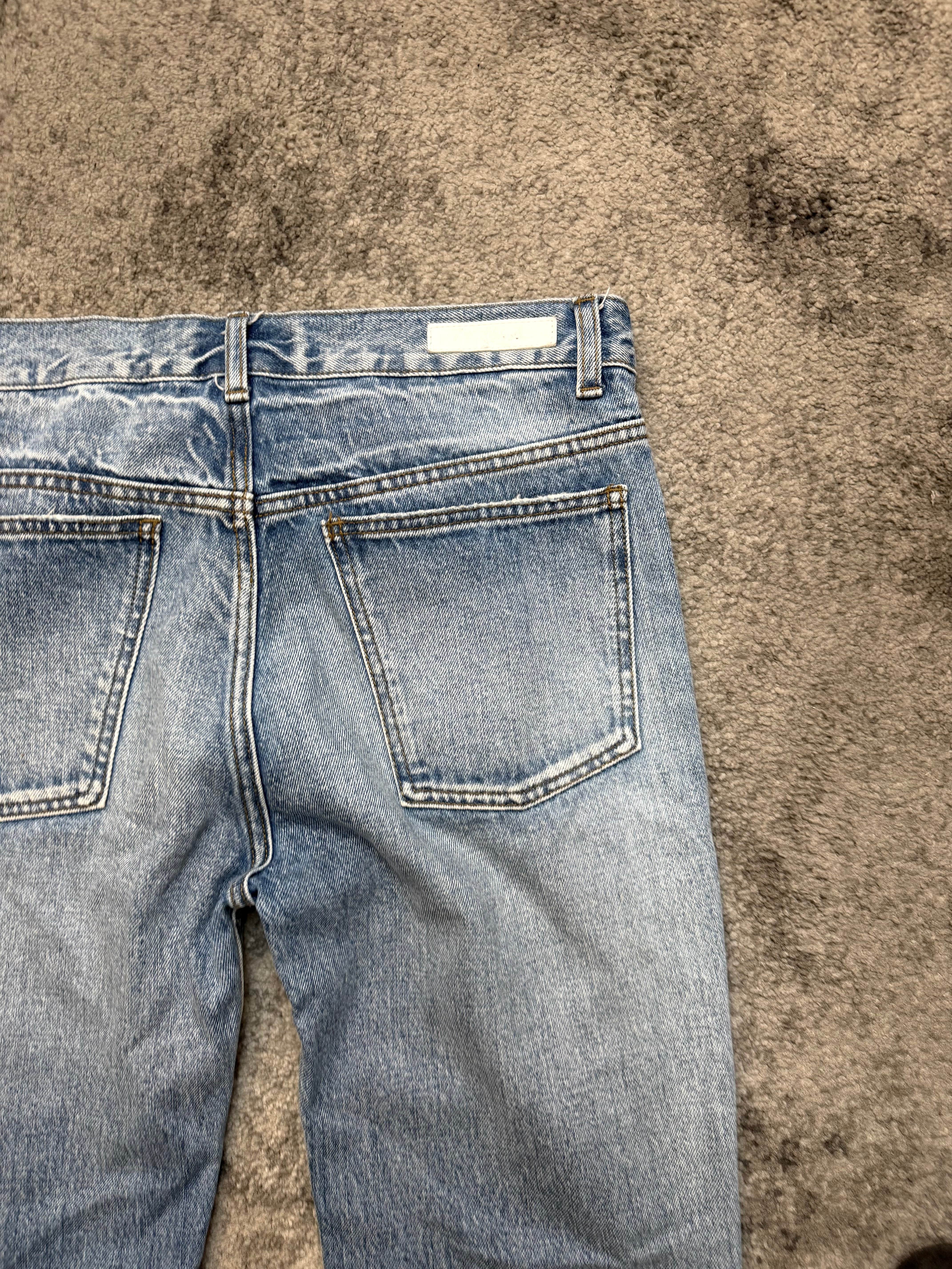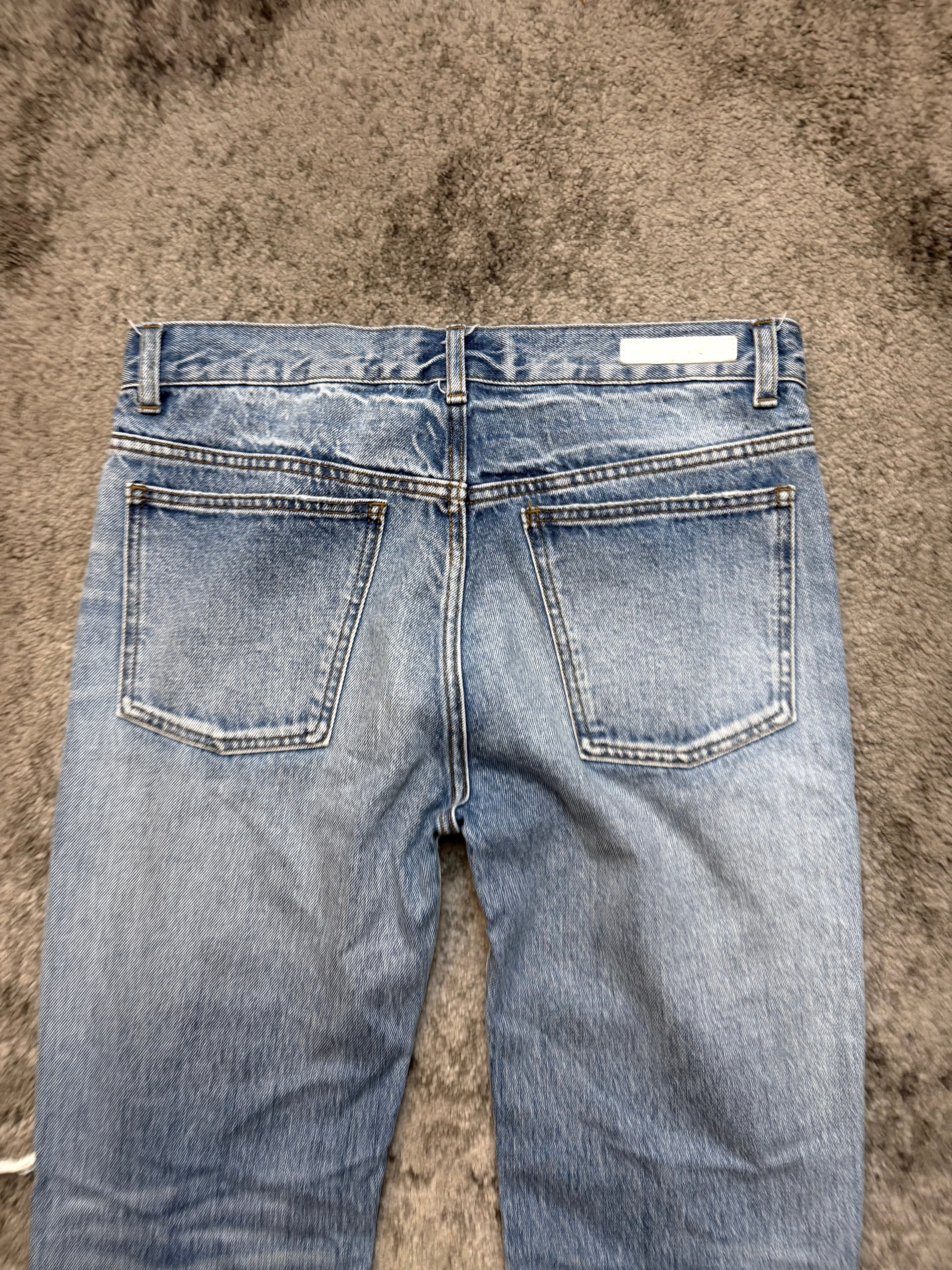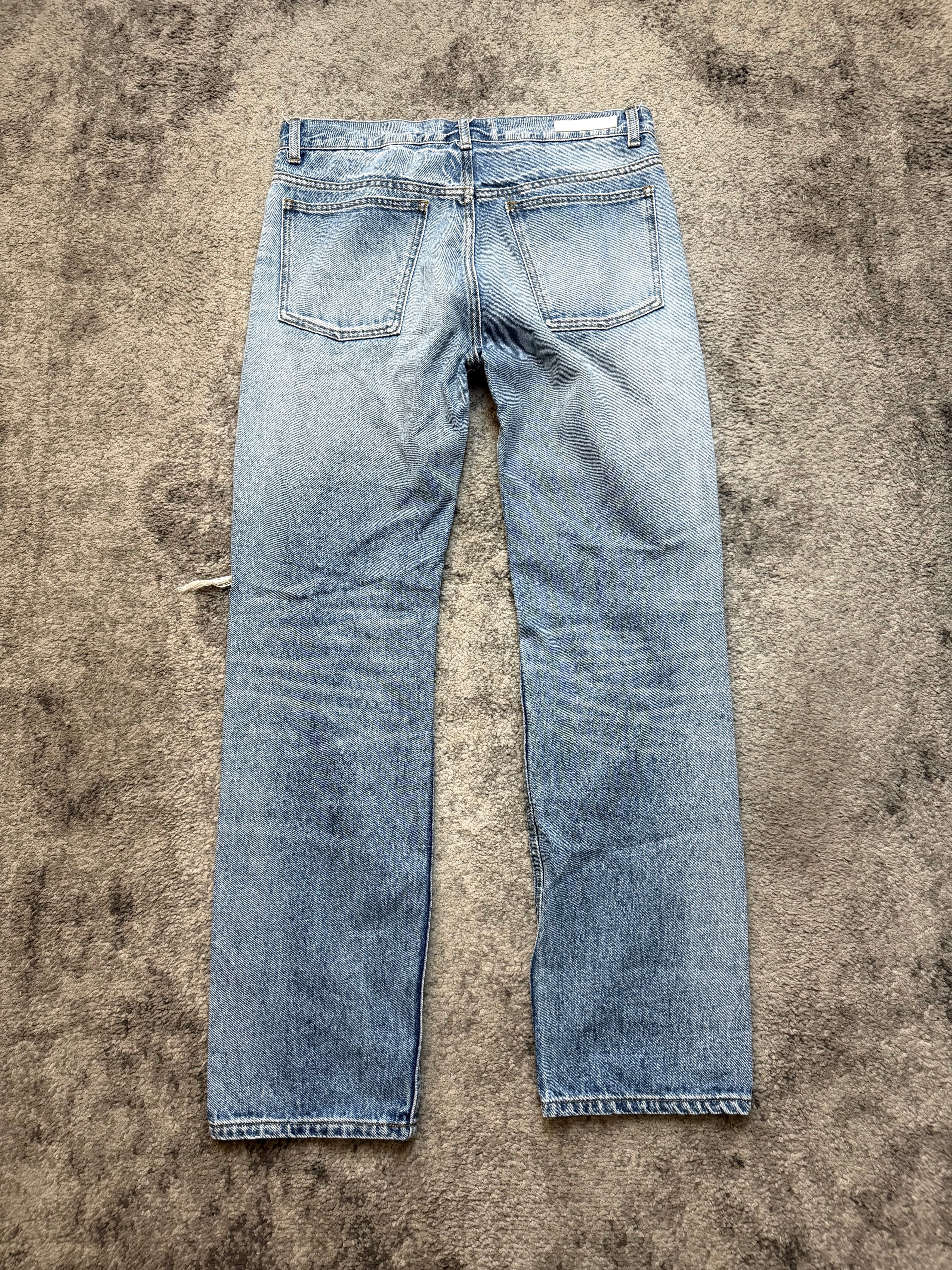 Gently used, with intentional heavy distressing throughout — beautifully frayed knees, soft fading, natural whiskers. No damage beyond designed wear. Authentic archive energy.
