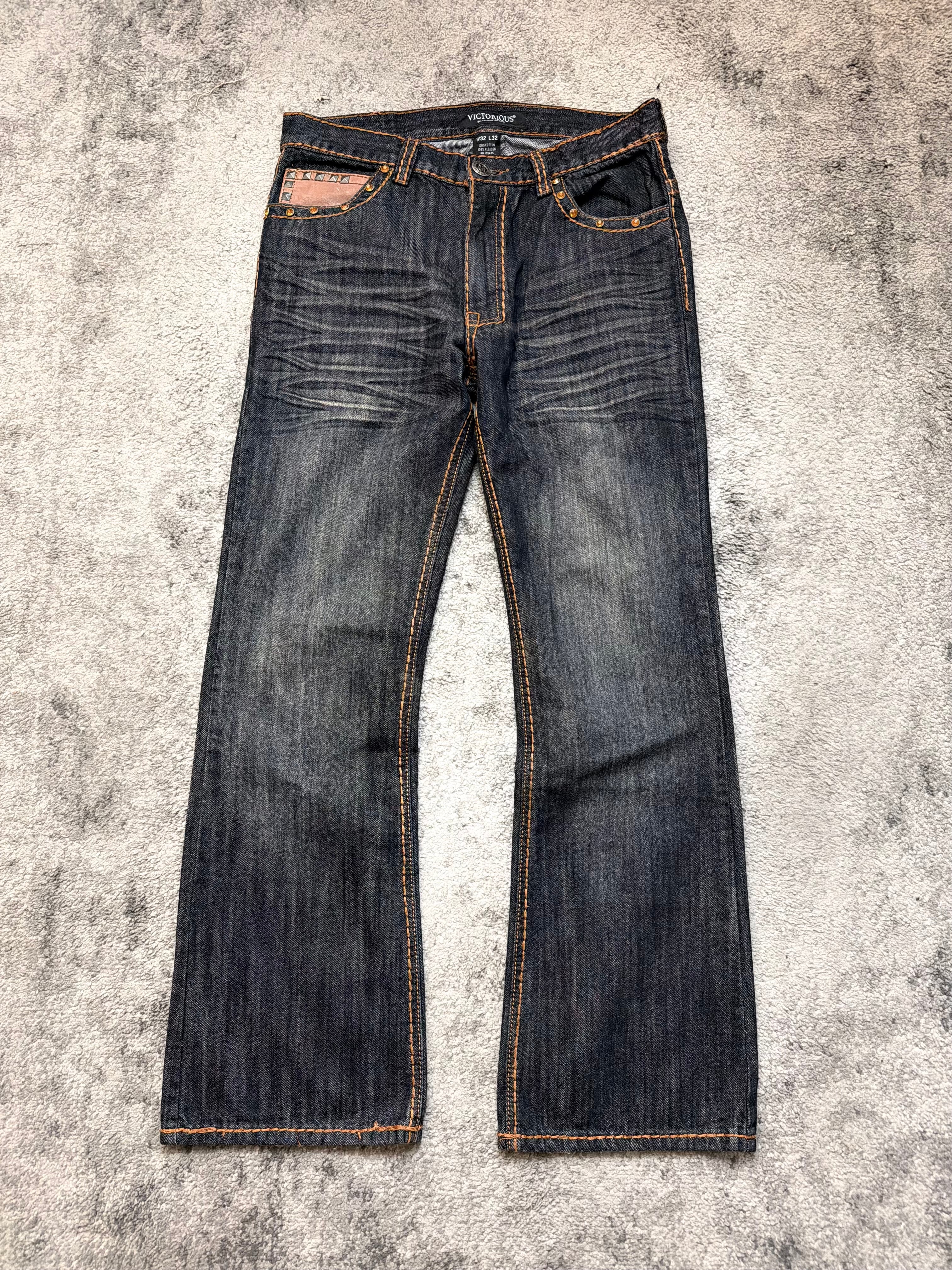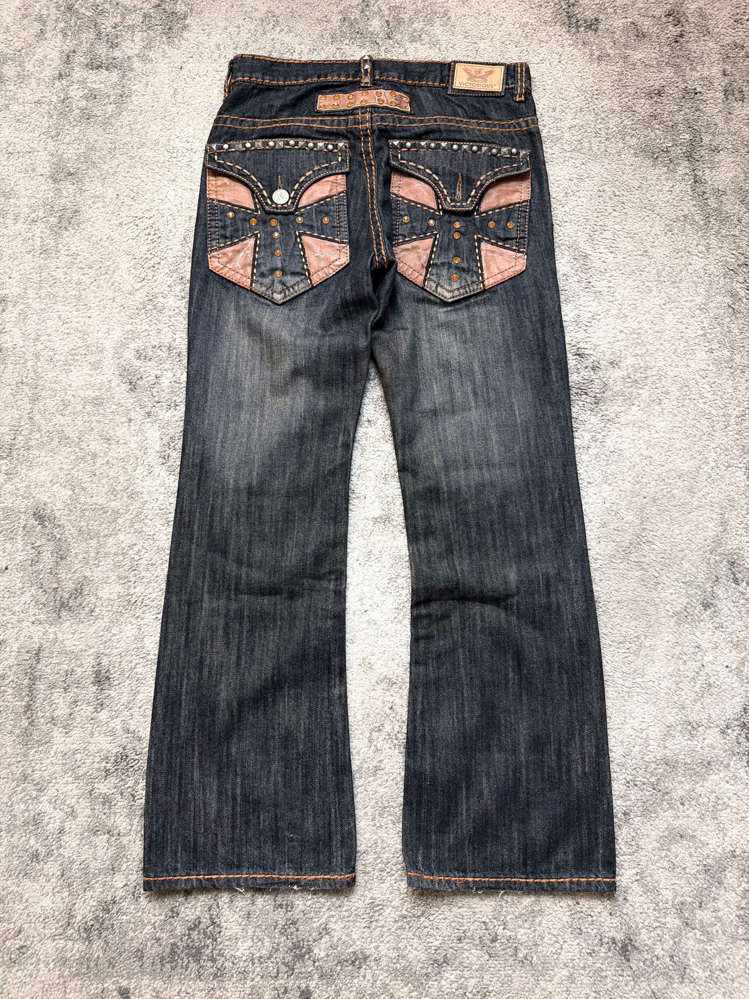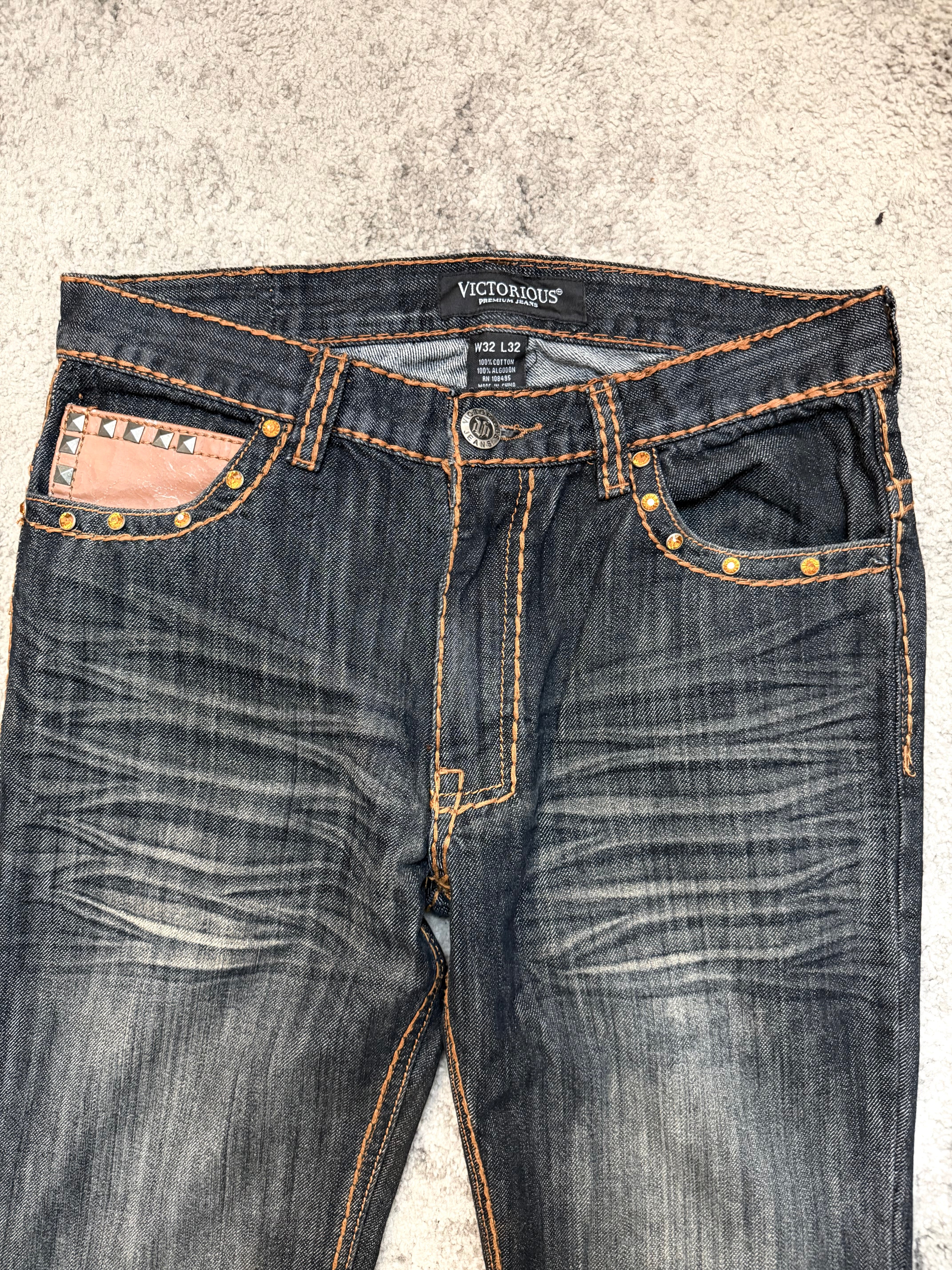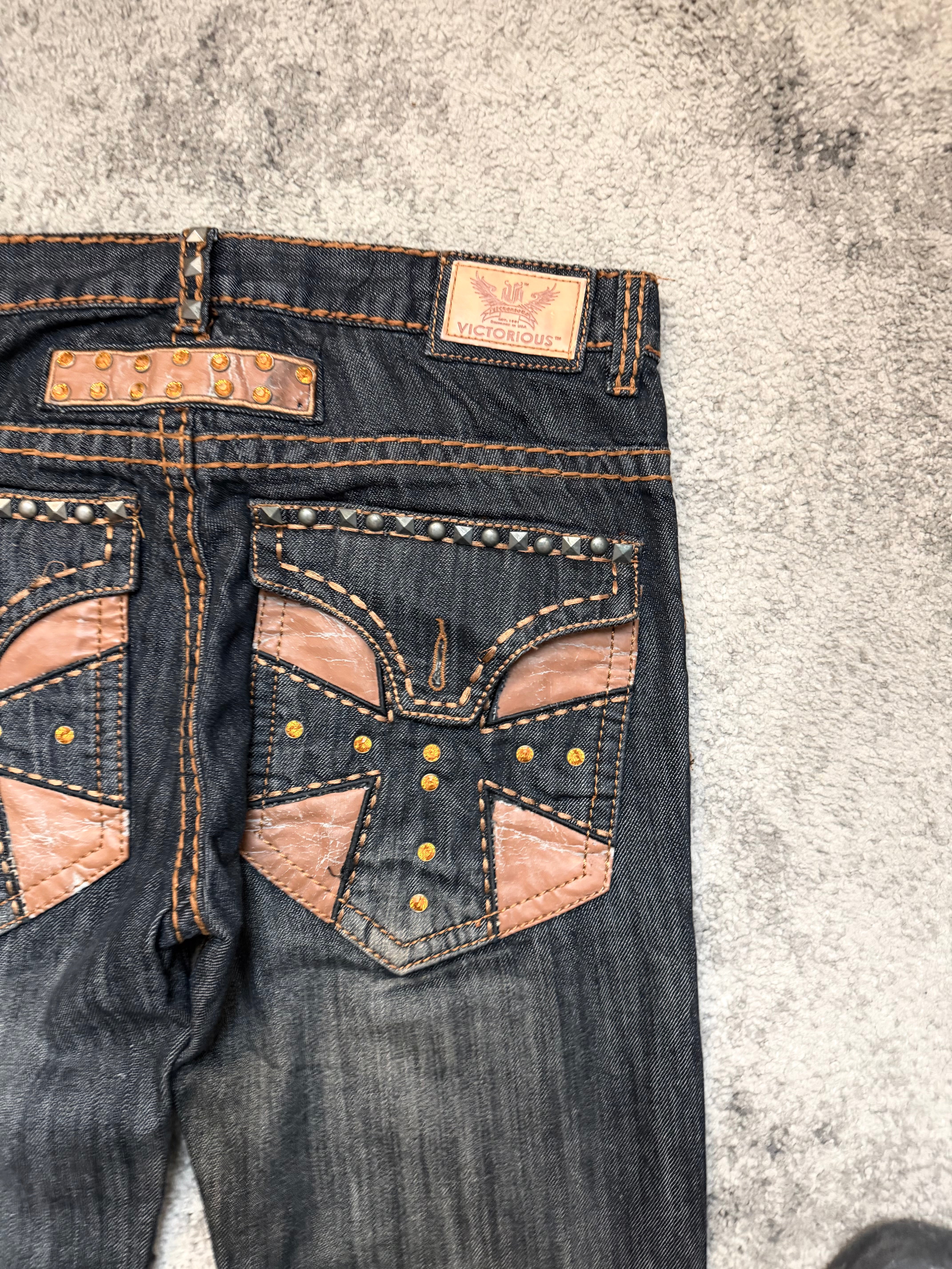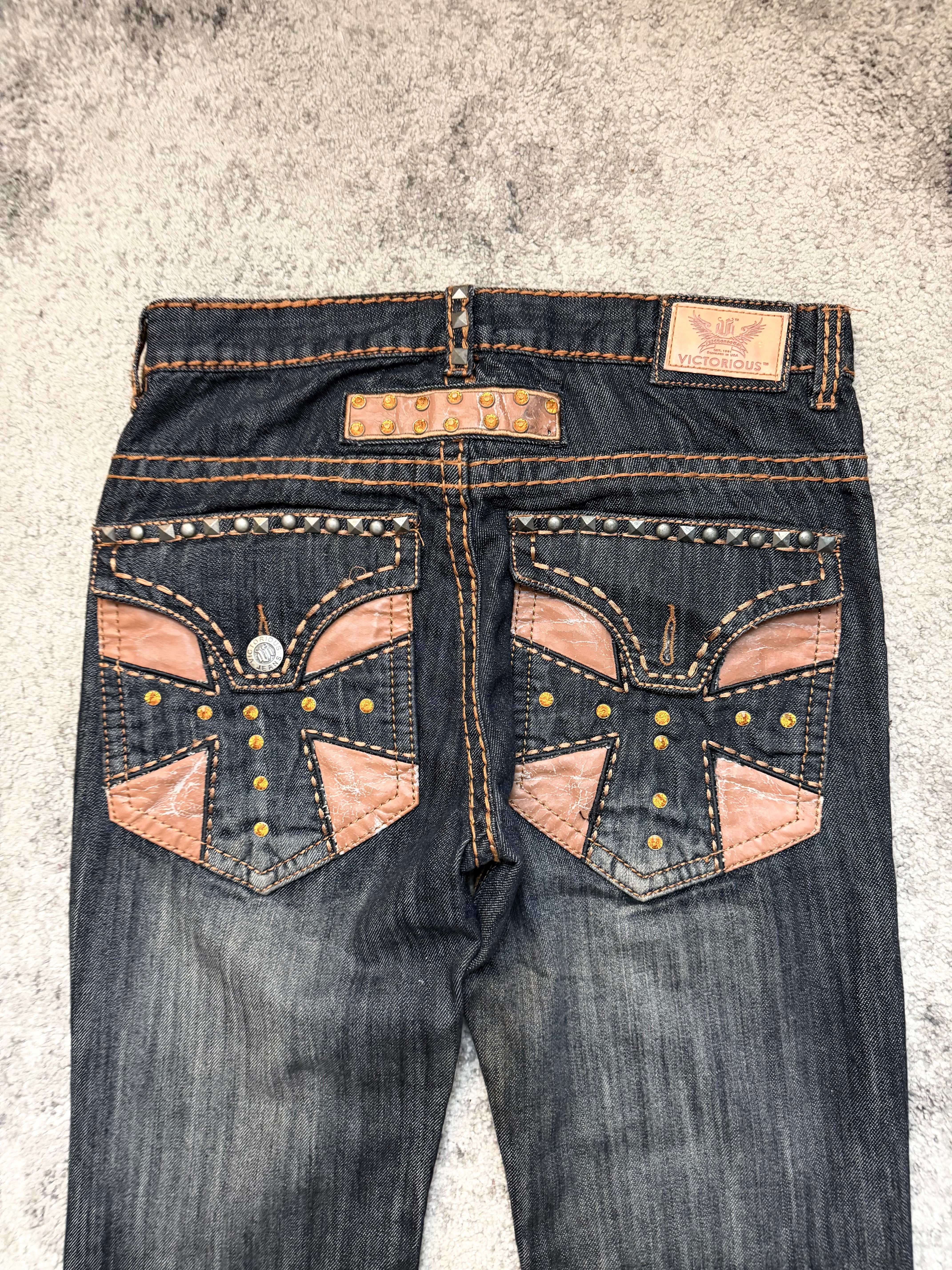 A piece that merges Japanese precision with Western grit. These VICTORIOUS jeans blend rugged structure and subtle drama — featuring deep indigo fades, aged copper contrast stitching, and raw attitude. The studded leather detailing across the pockets brings an unmistakable touch of rebellion — a nod to the golden era of Japanese denim experimentation.