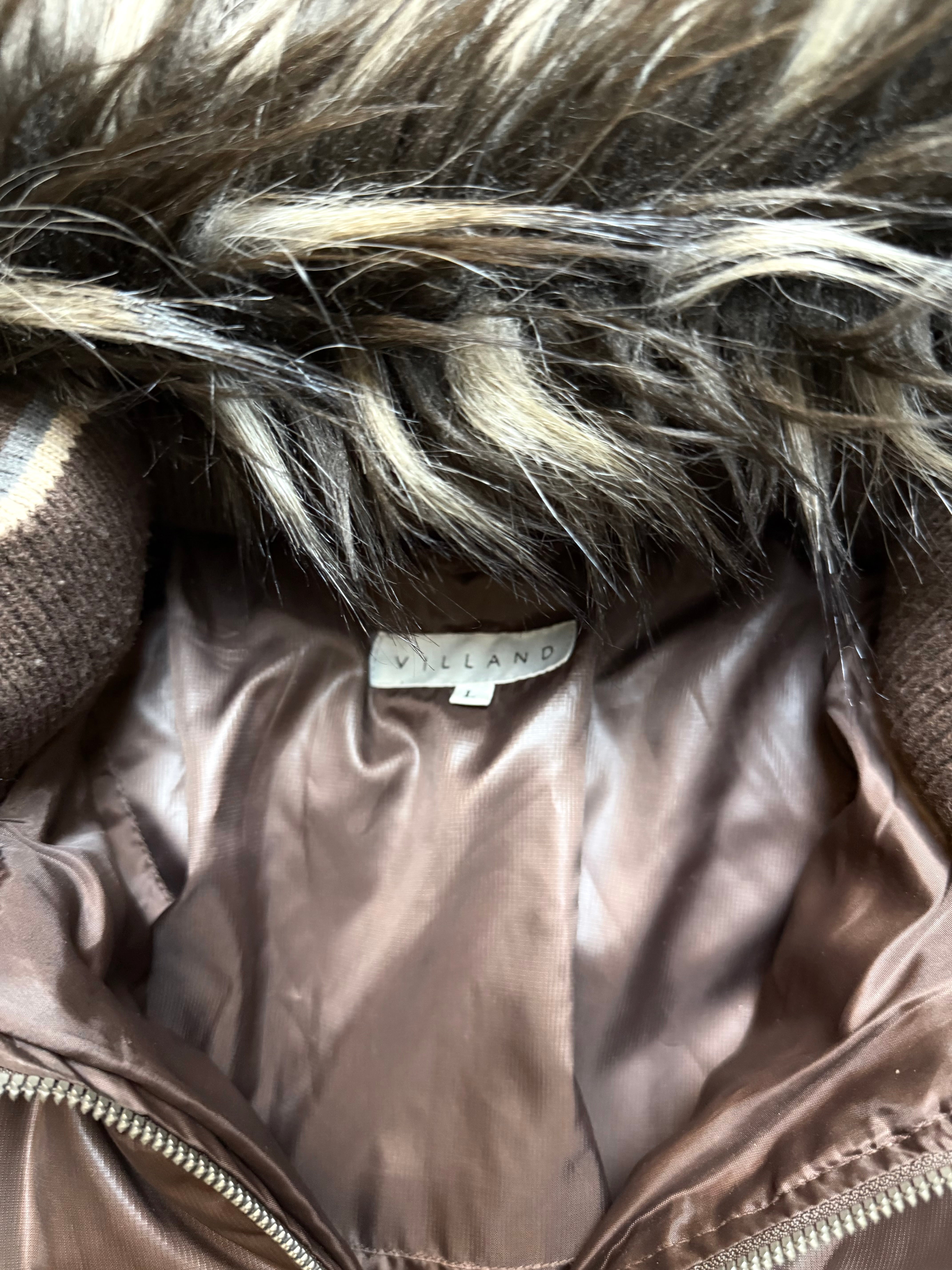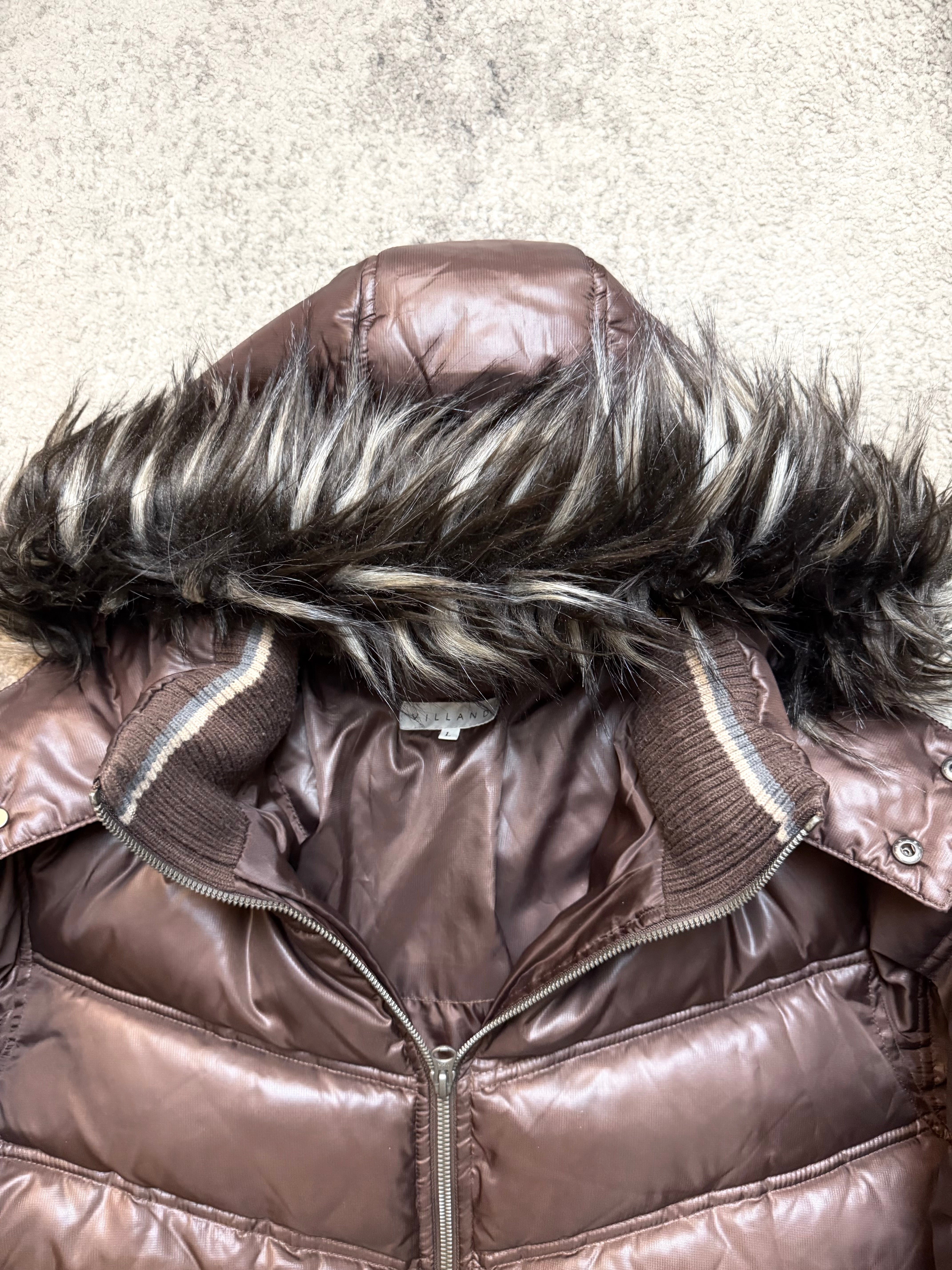 Lightweight synthetic shell with a subtle metallic sheen, padded for real warmth. Inner lining soft and comfortable. Faux-fur hood trim adds volume and attitude.