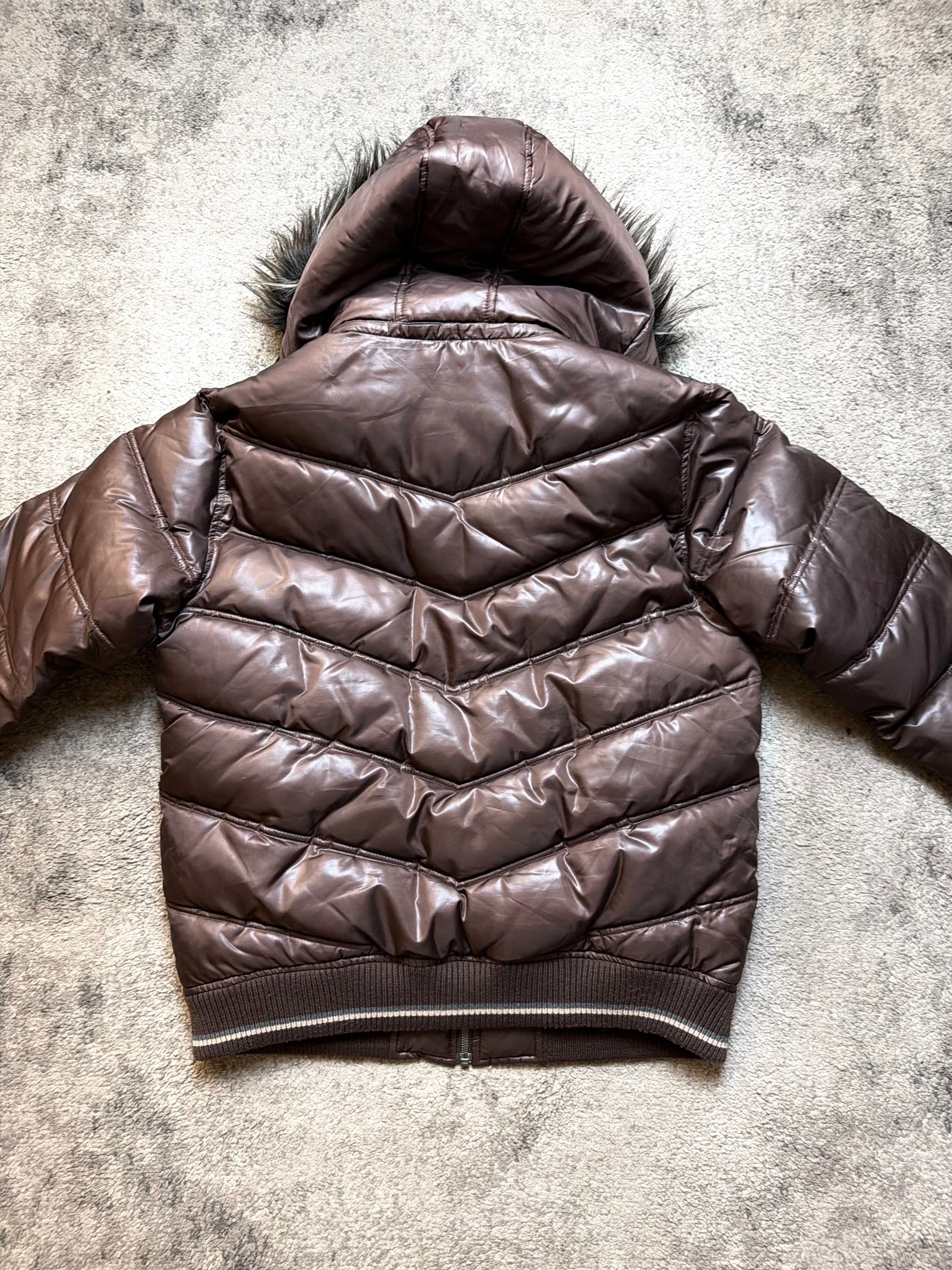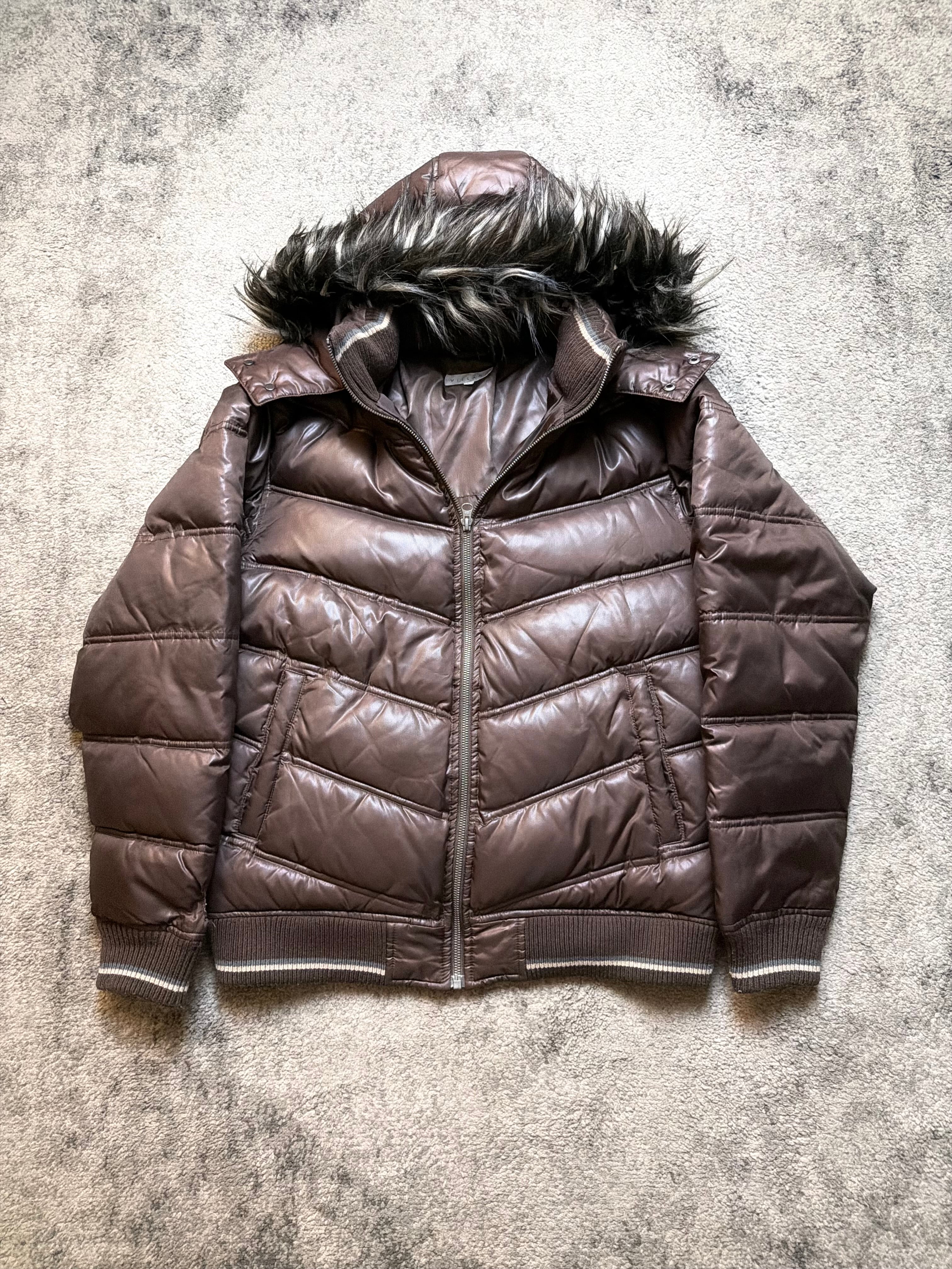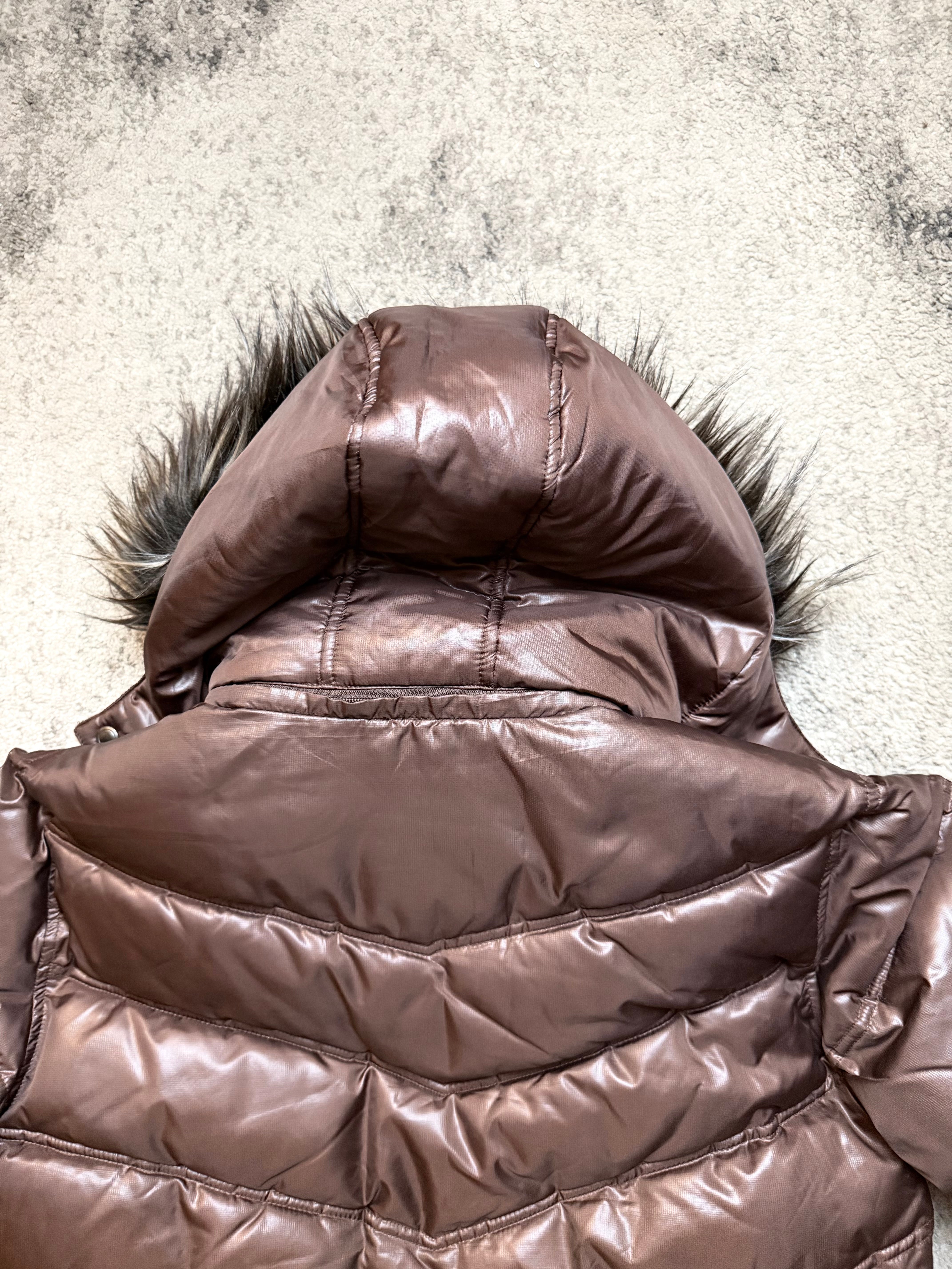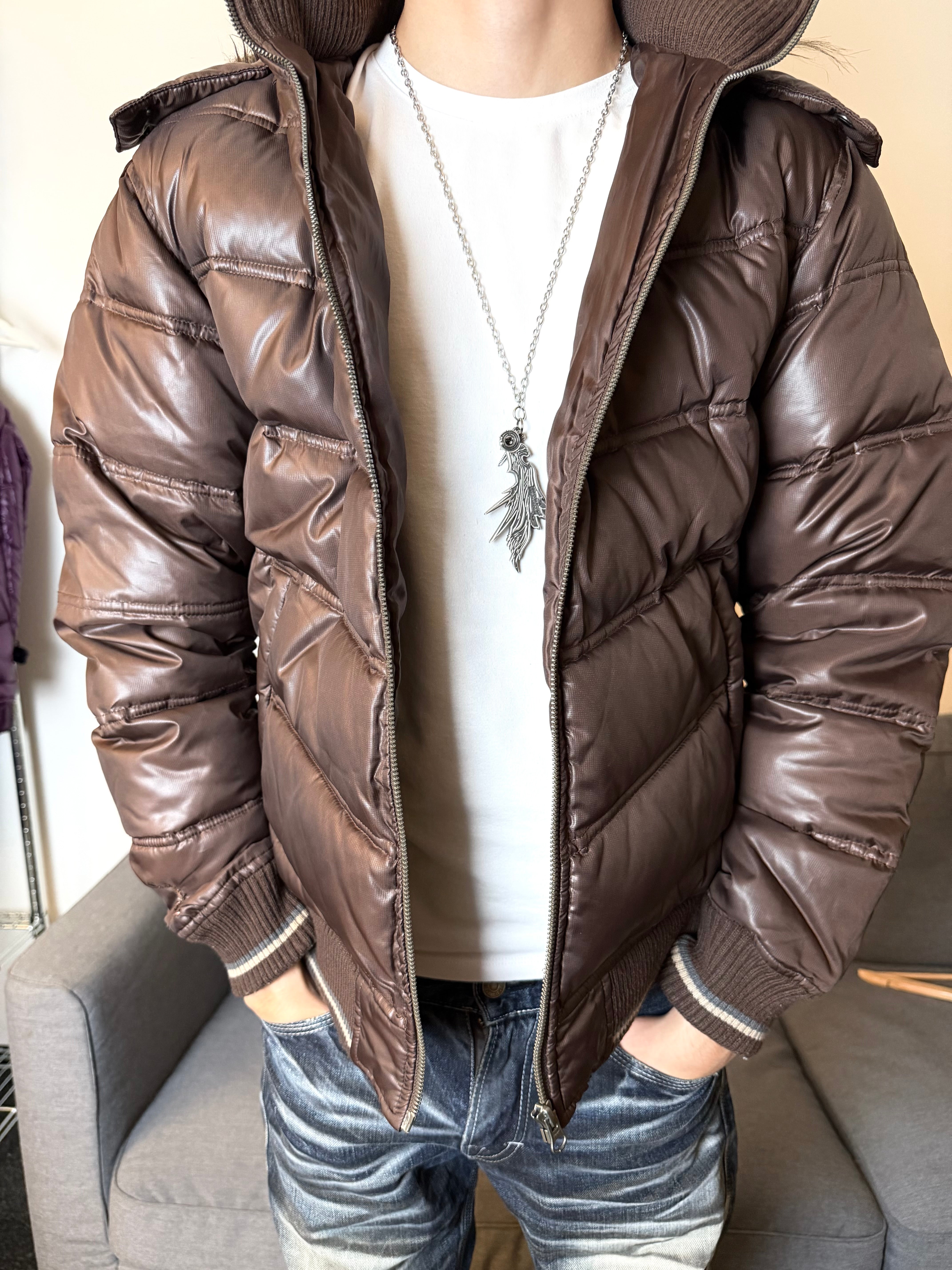 A deep mocha-brown puffer with a soft shine and a wild faux-fur hood—built like a calm flame in the cold. Understated but still undeniably host-core, the kind of jacket that looks better the later the night gets.